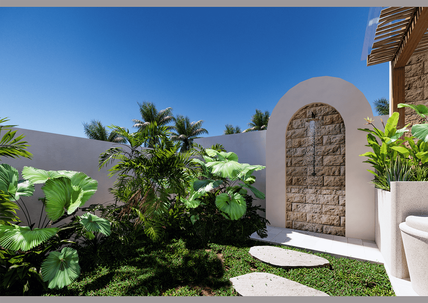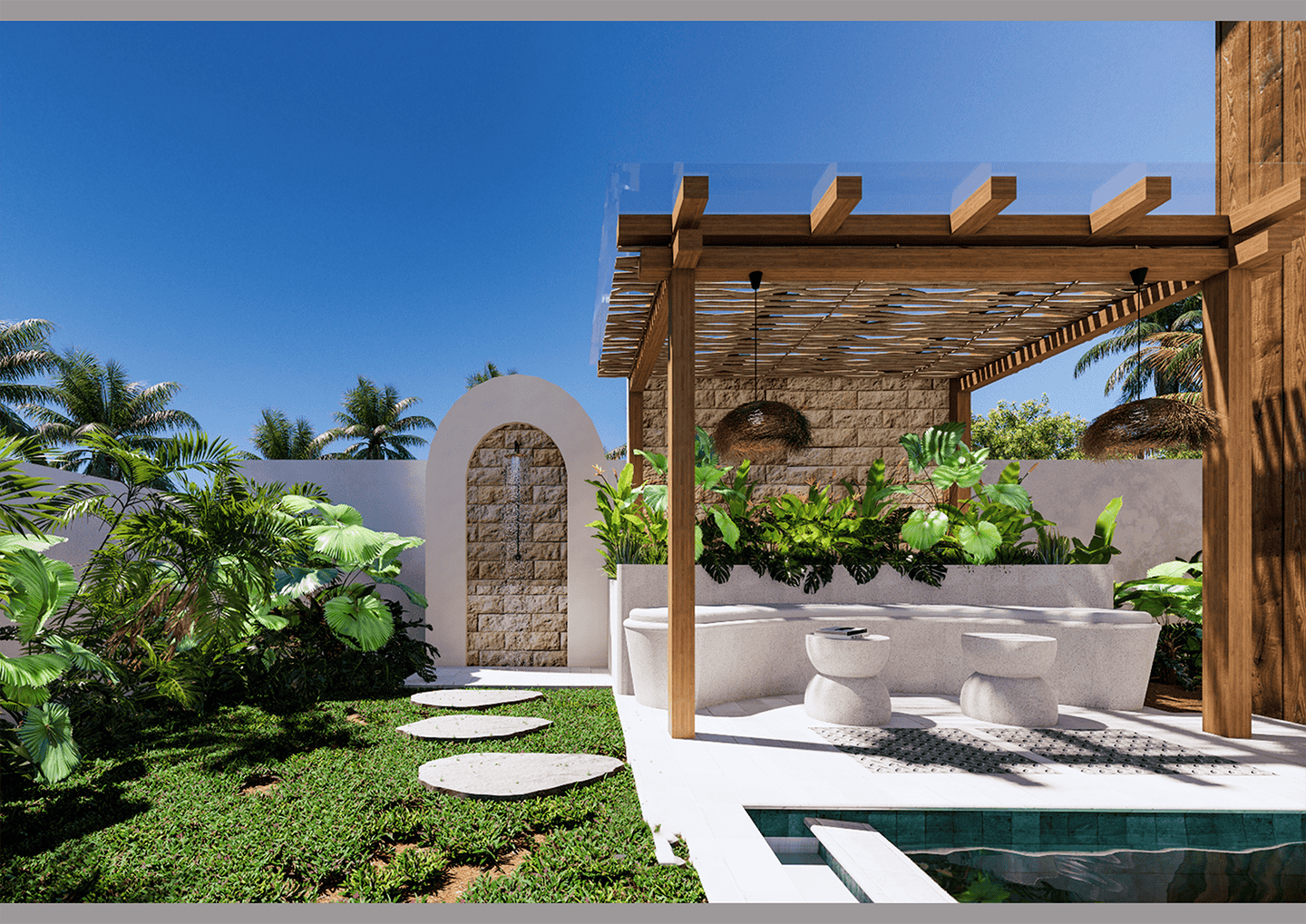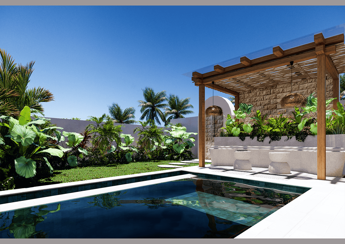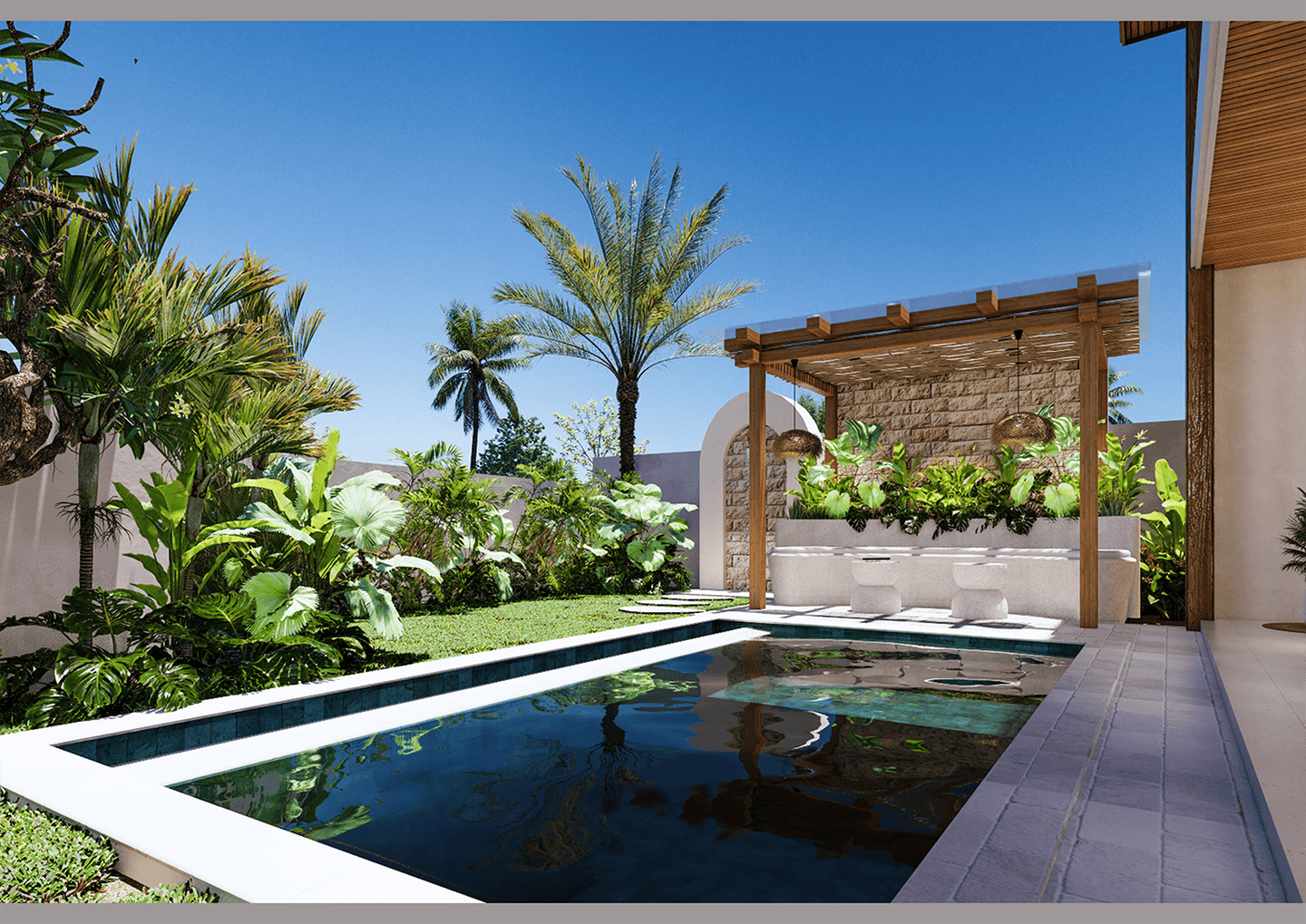 À l’extérieur, vous serez accueilli par une piscine privée entourée d’une végétation luxuriante et d’un paysage tropical. Le jardin offre un havre de paix, tandis que le balcon à l’étage offre une vue paisible sur les environs, vous invitant à vous détendre en toute intimité.