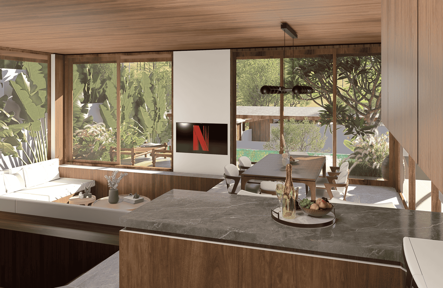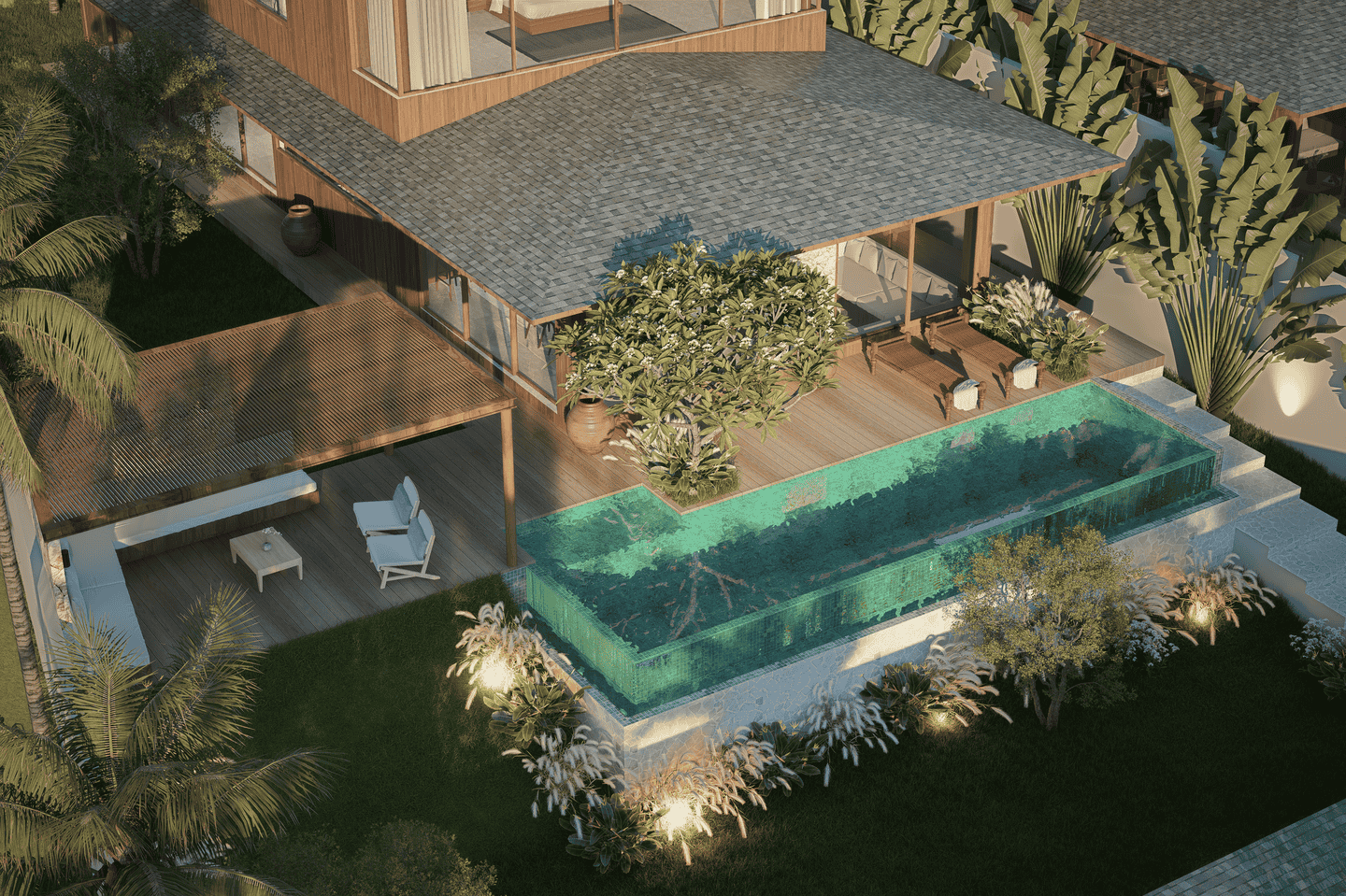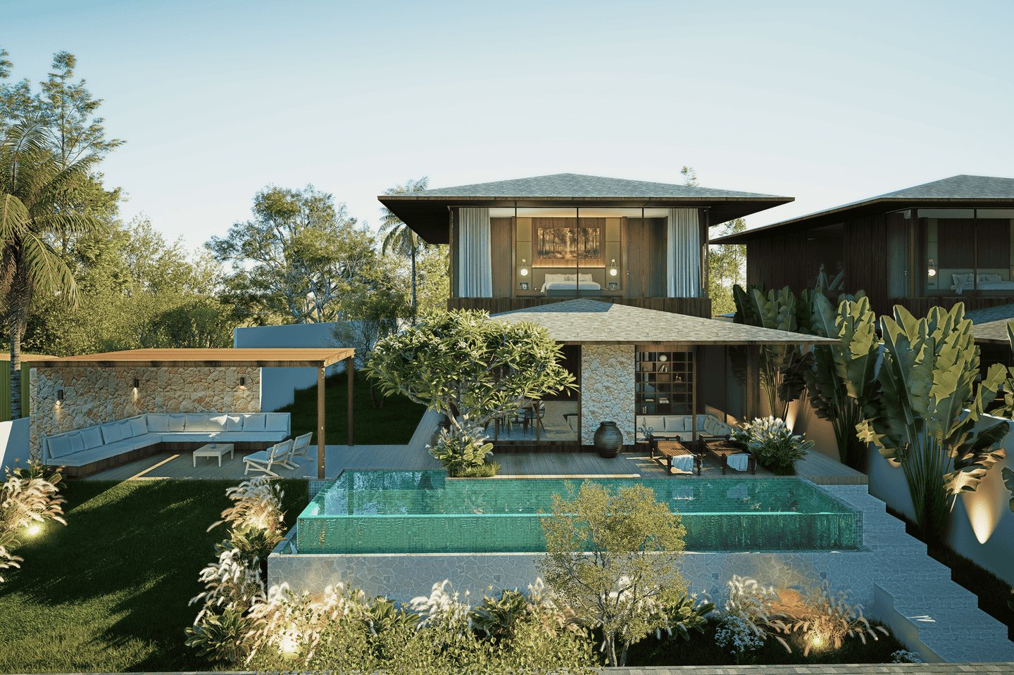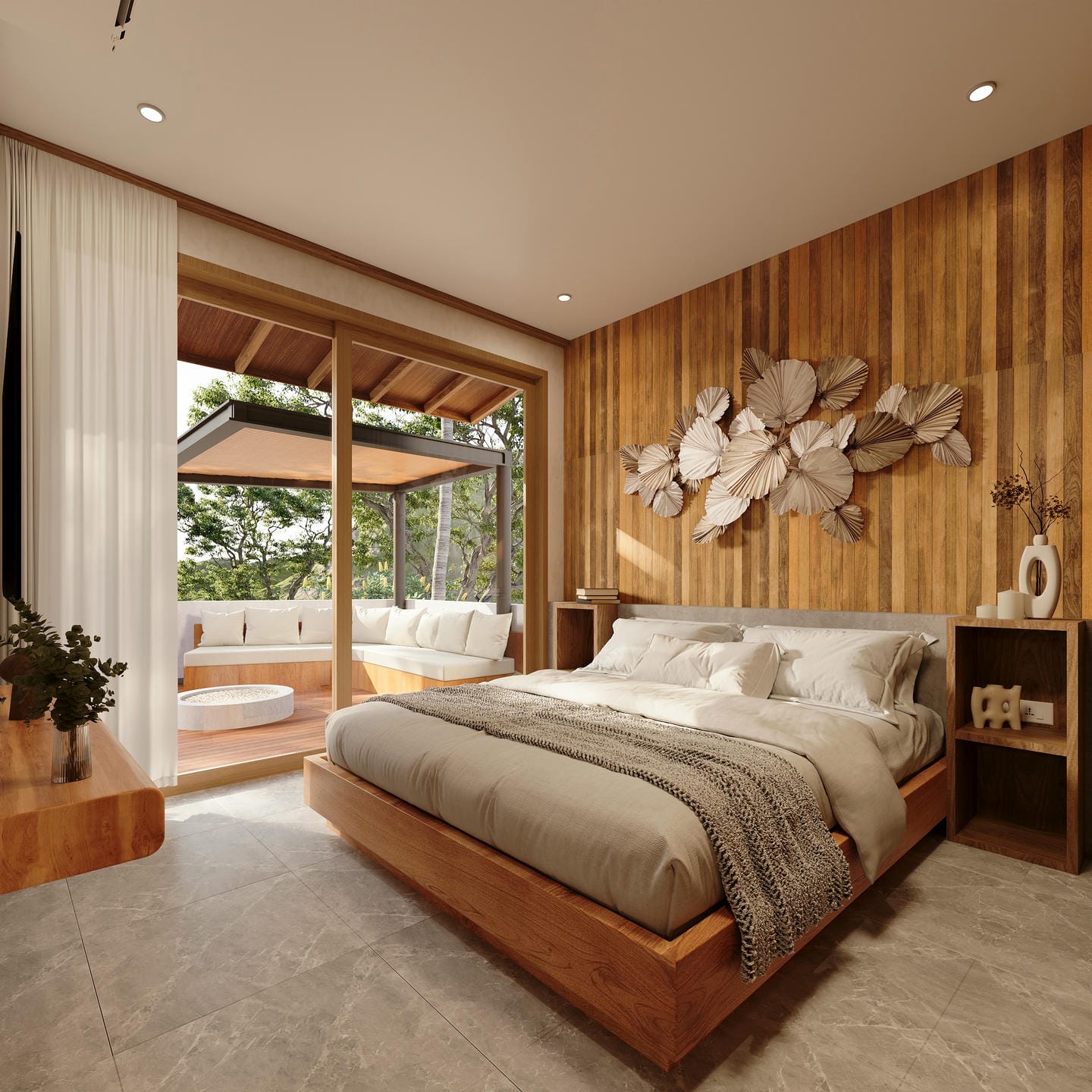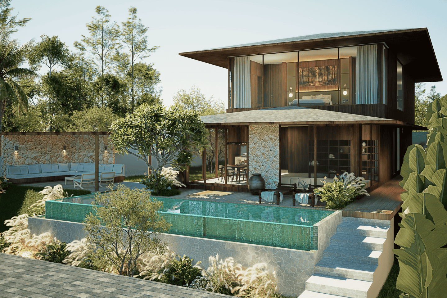 L’intérieur présente un design tropical moderne avec des touches de bois chaleureux, des espaces de vie ouverts et des tons naturels qui créent une atmosphère accueillante et élégante. La villa comprend cinq chambres spacieuses, avec la possibilité d’ajouter des installations bien-être comme un sauna et un bain de glace pour une expérience de vie optimale.