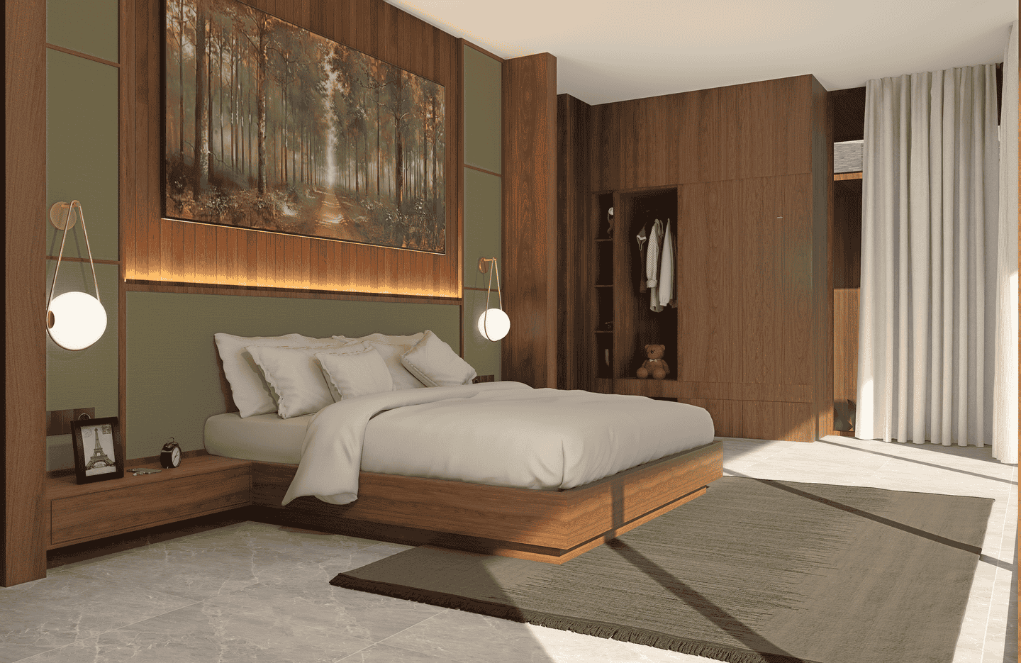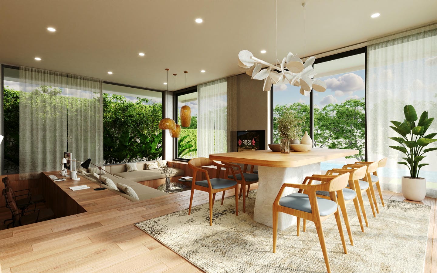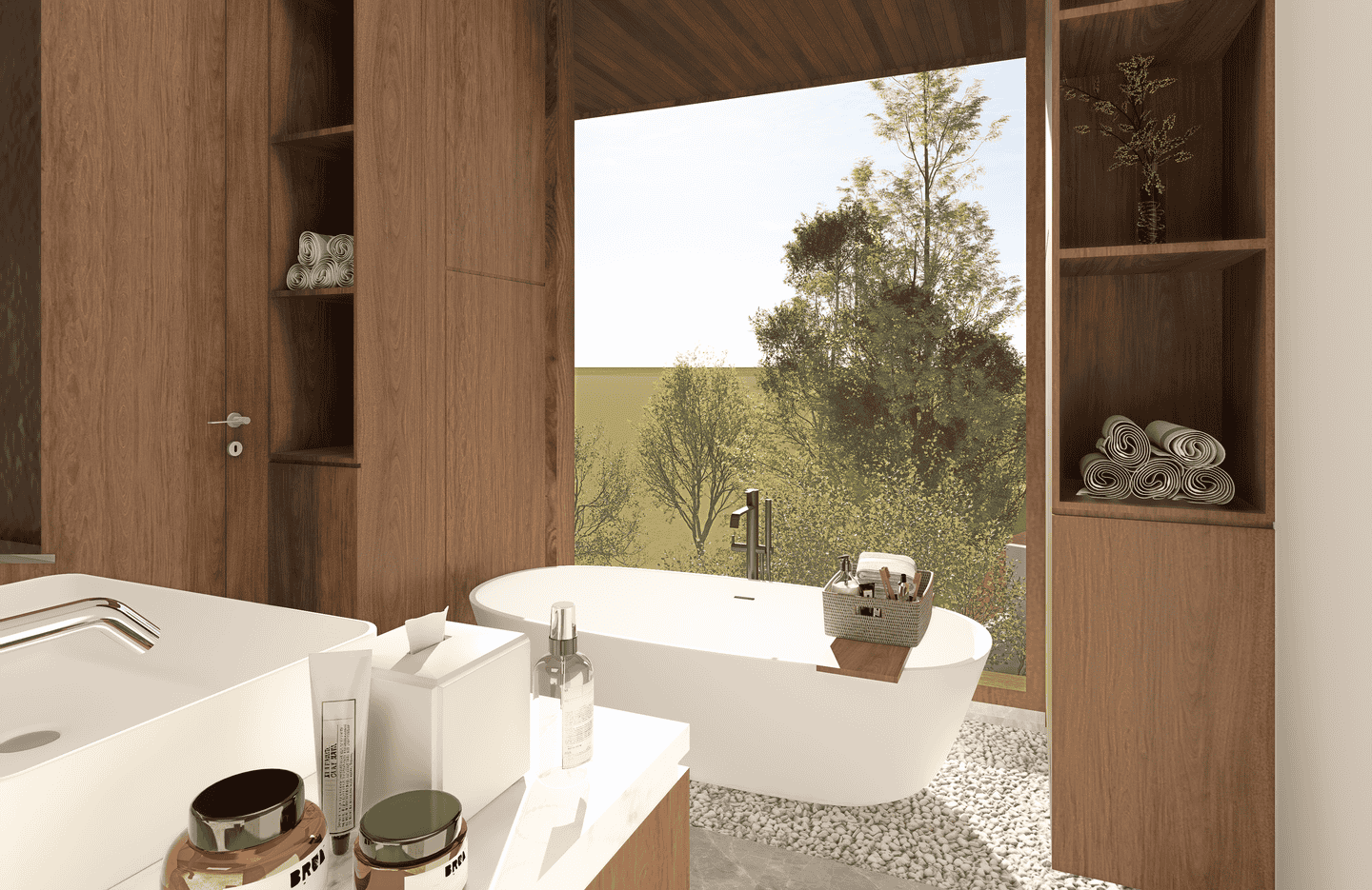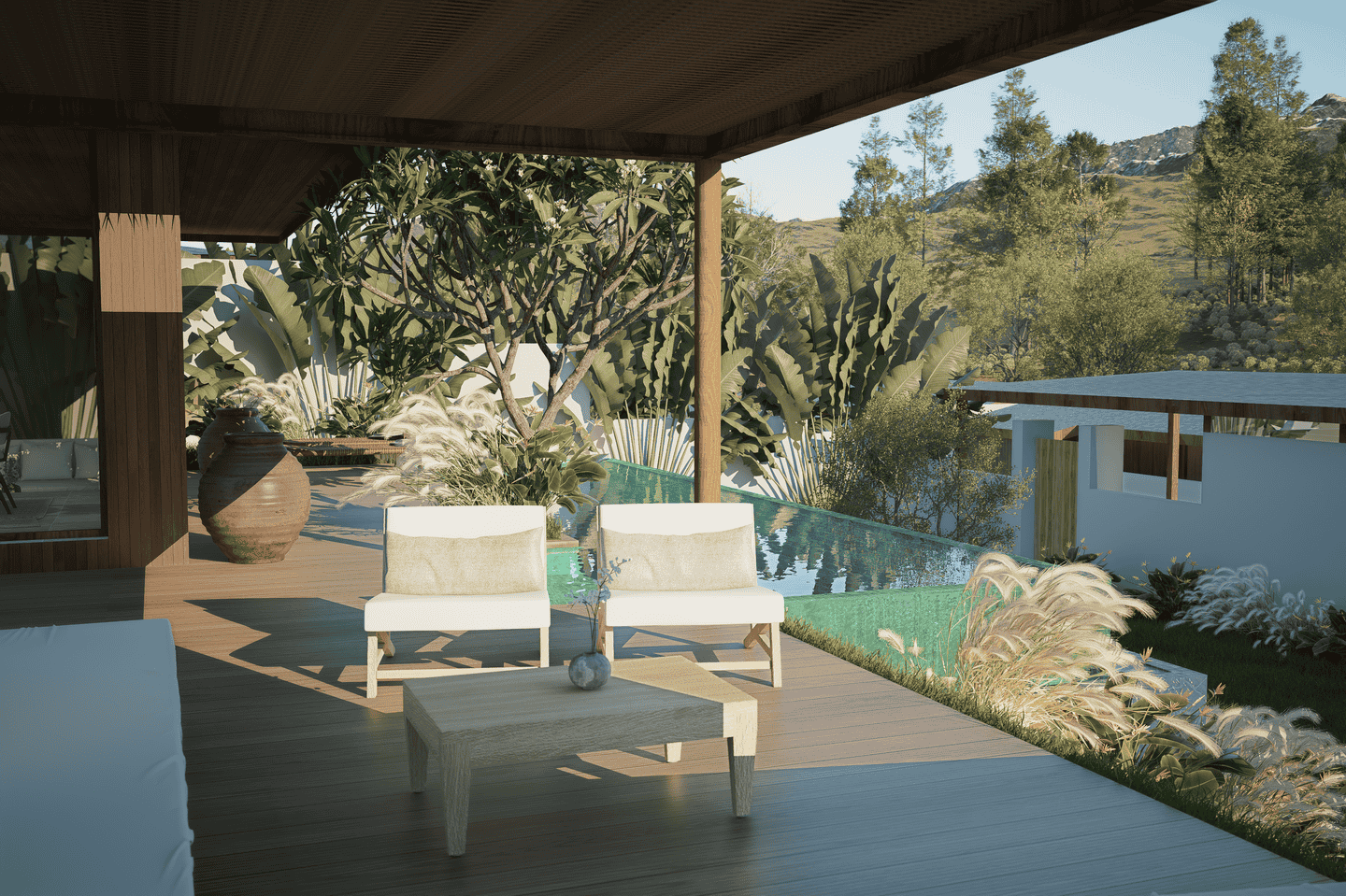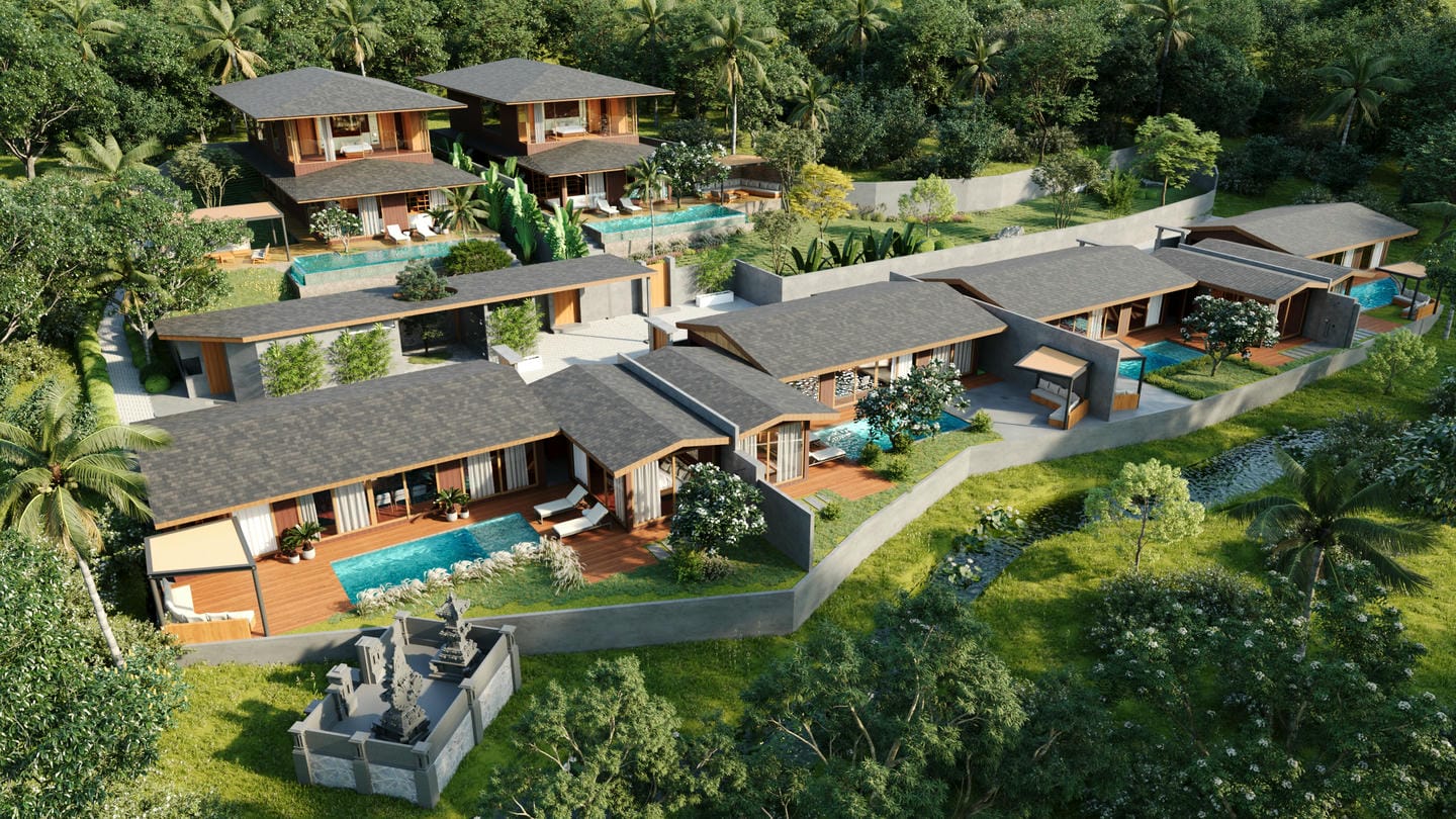 L’intérieur présente un design tropical moderne avec des touches de bois chaleureux, des espaces de vie ouverts et des tons naturels qui créent une atmosphère accueillante et élégante. La villa comprend cinq chambres spacieuses, avec la possibilité d’ajouter des installations bien-être comme un sauna et un bain de glace pour une expérience de vie optimale.