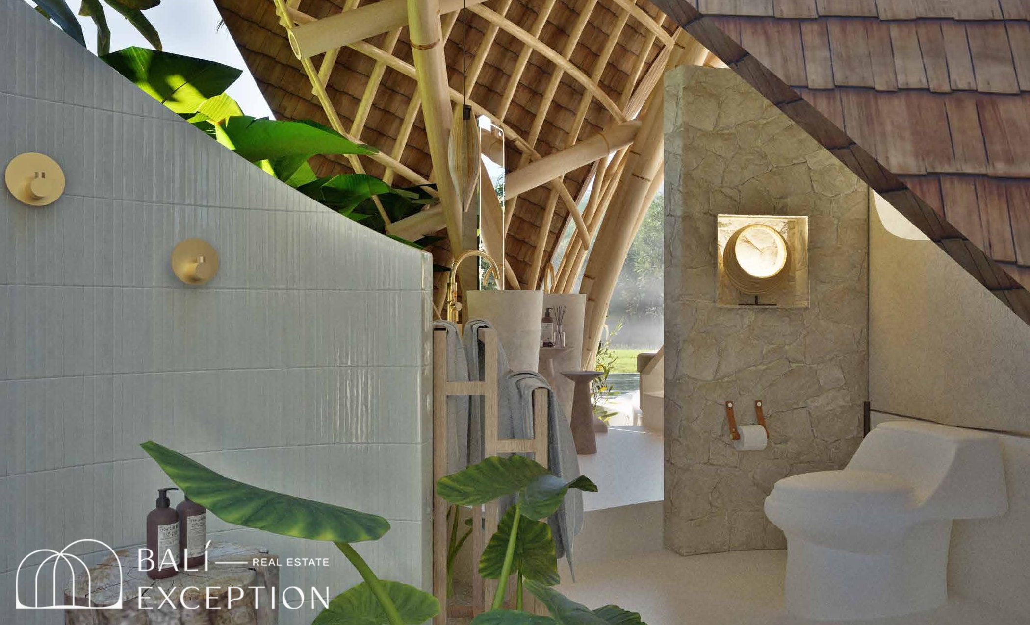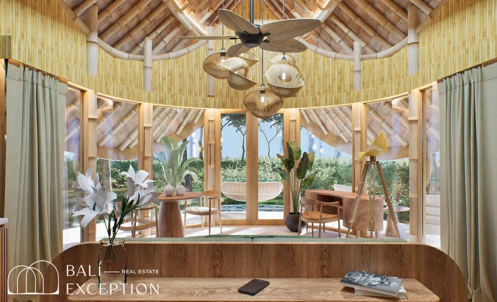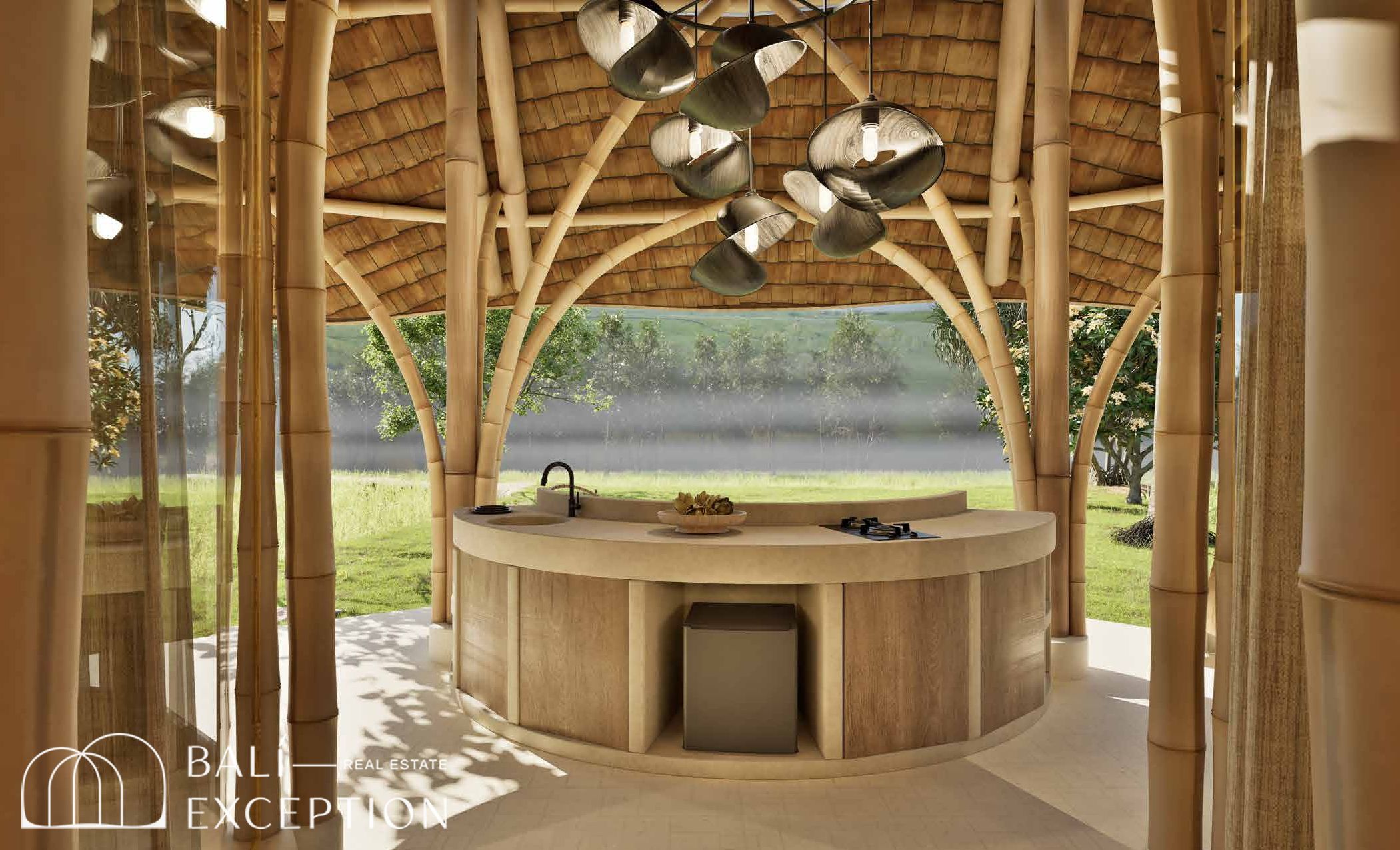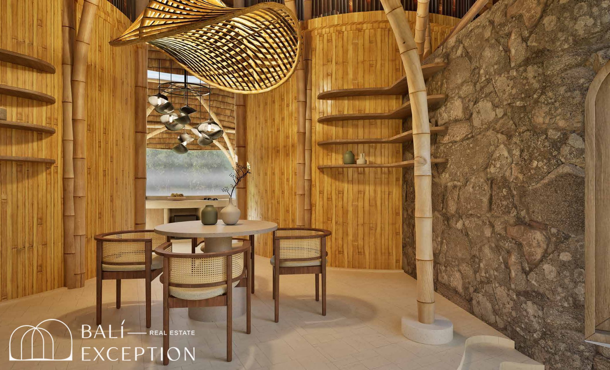 L’intérieur présente un style tropical organique chaleureux, dominé par des matériaux naturels tels que le bambou, le bois et la pierre. L’architecture met en valeur des structures sculpturales en bambou, des tons doux et terreux, ainsi que des détails artisanaux, créant une atmosphère à la fois cosy et design. Les hauts plafonds et les espaces ouverts renforcent la circulation de l’air et la luminosité naturelle, offrant une sensation d’espace sereine et aérée.