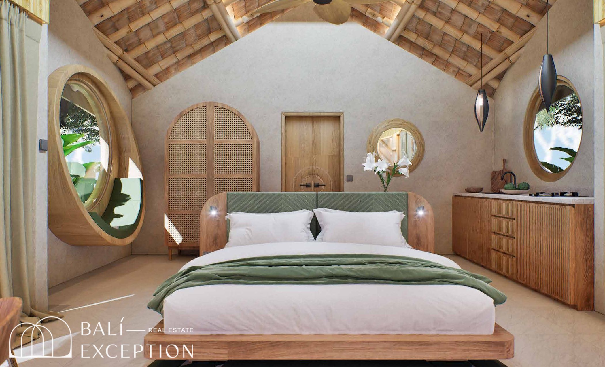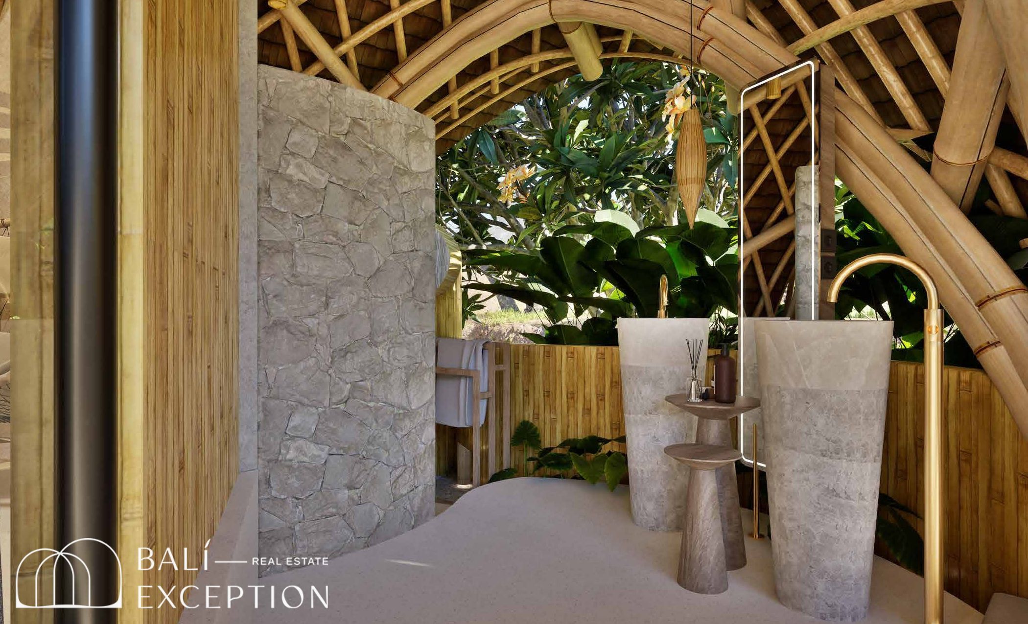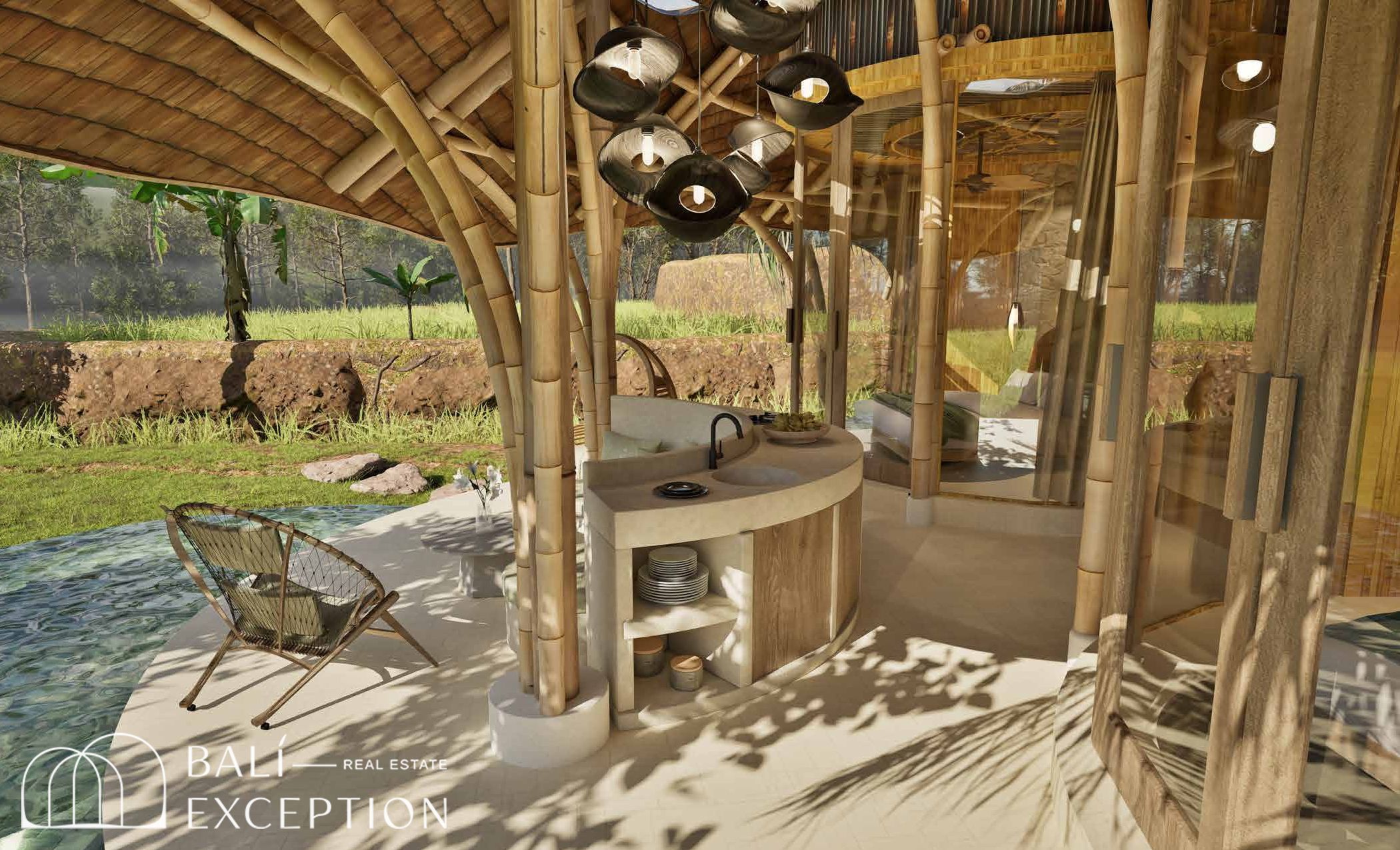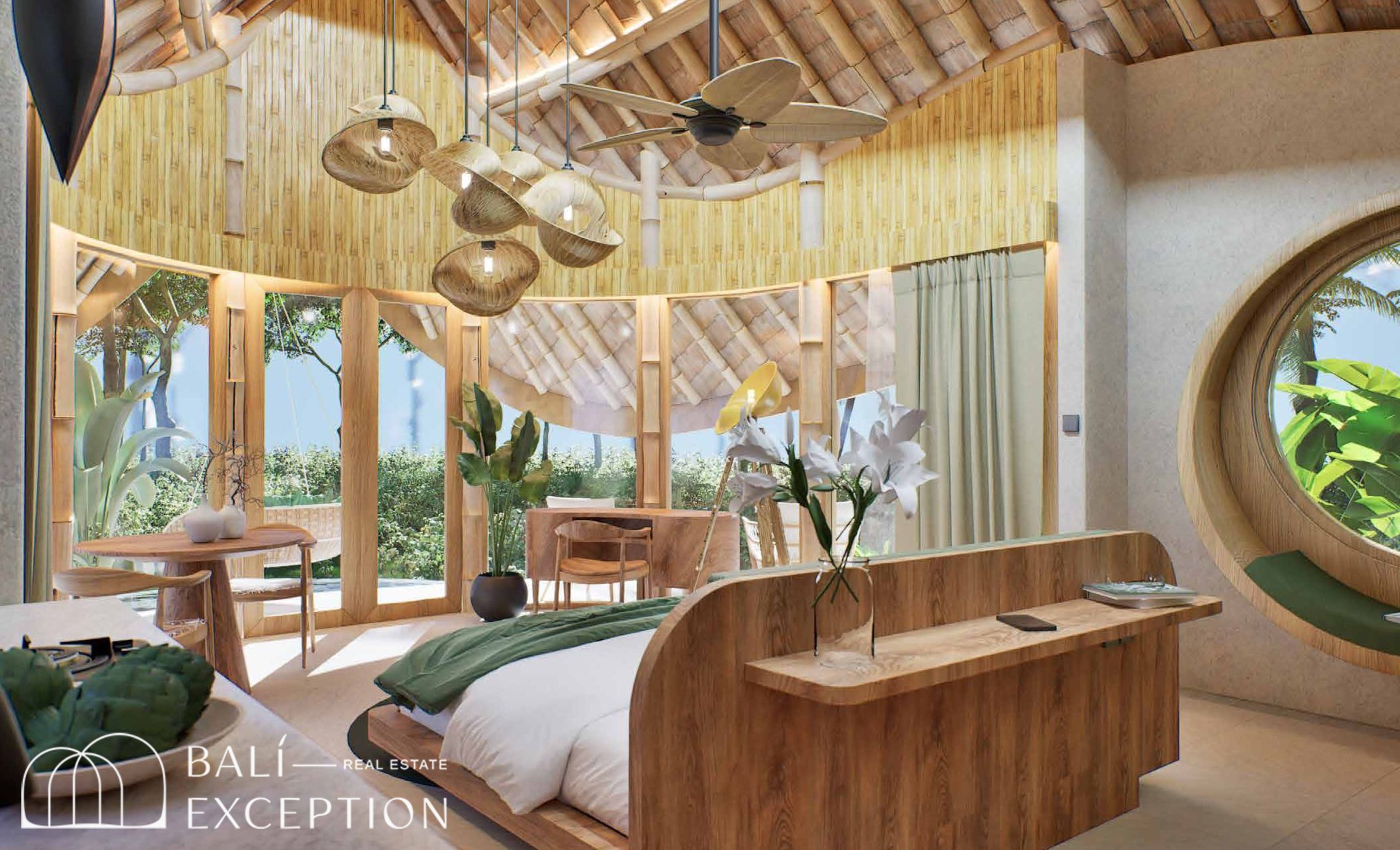 L’intérieur présente un style tropical organique chaleureux, dominé par des matériaux naturels tels que le bambou, le bois et la pierre. L’architecture met en valeur des structures sculpturales en bambou, des tons doux et terreux, ainsi que des détails artisanaux, créant une atmosphère à la fois cosy et design. Les hauts plafonds et les espaces ouverts renforcent la circulation de l’air et la luminosité naturelle, offrant une sensation d’espace sereine et aérée.