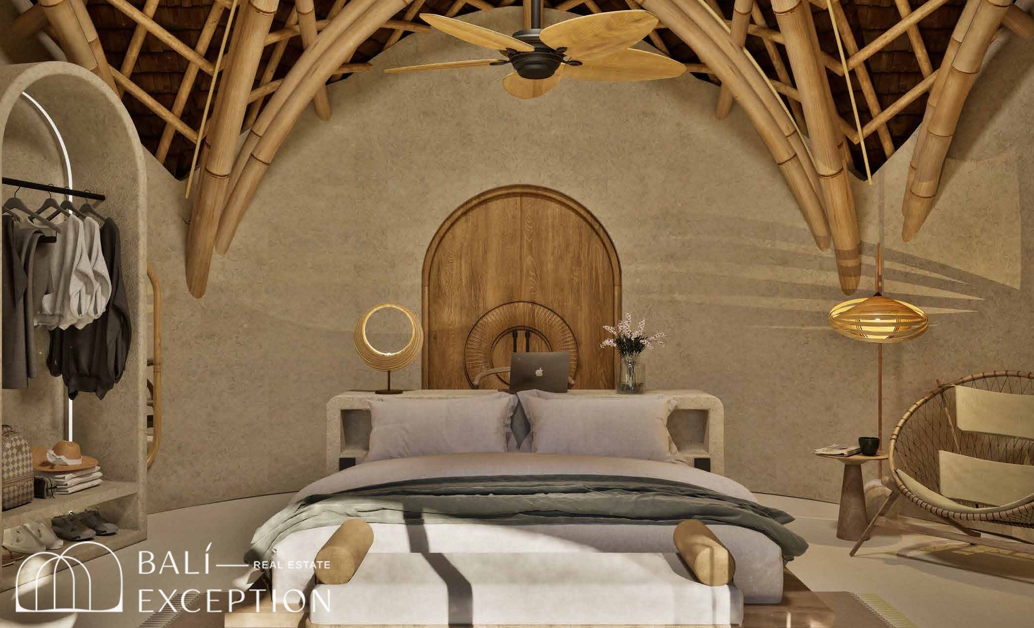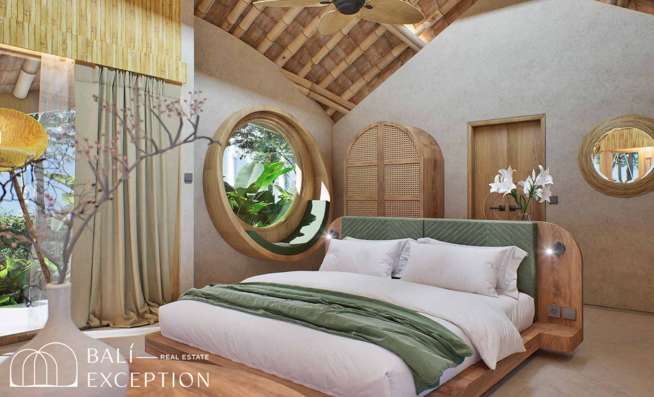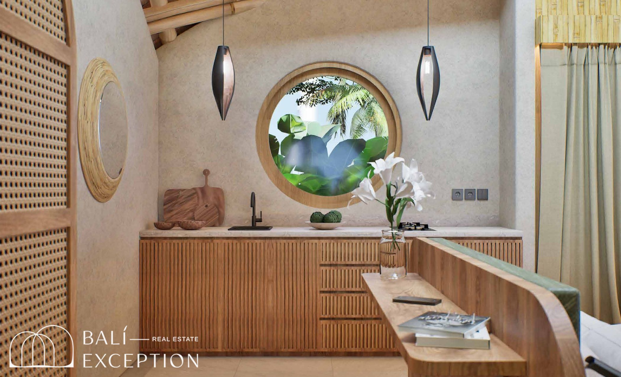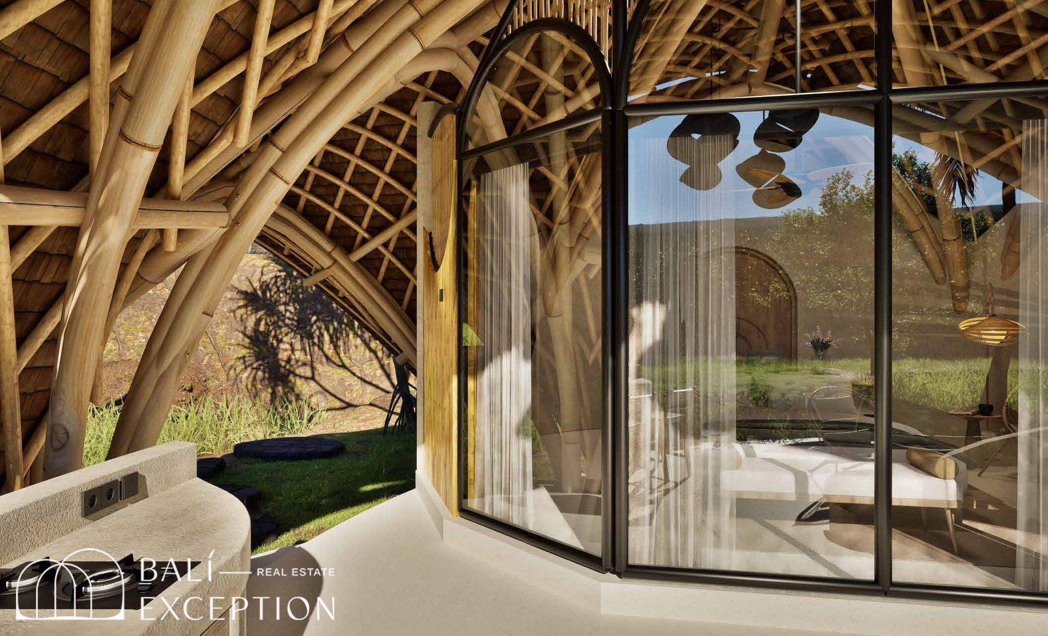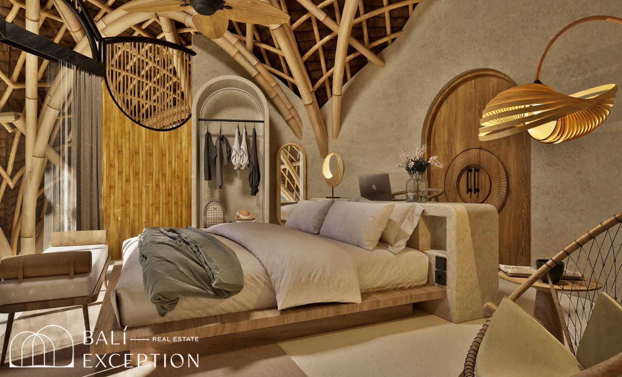 L’intérieur présente un style tropical organique chaleureux, dominé par des matériaux naturels tels que le bambou, le bois et la pierre. L’architecture met en valeur des structures sculpturales en bambou, des tons doux et terreux, ainsi que des détails artisanaux, créant une atmosphère à la fois cosy et design. Les hauts plafonds et les espaces ouverts renforcent la circulation de l’air et la luminosité naturelle, offrant une sensation d’espace sereine et aérée.