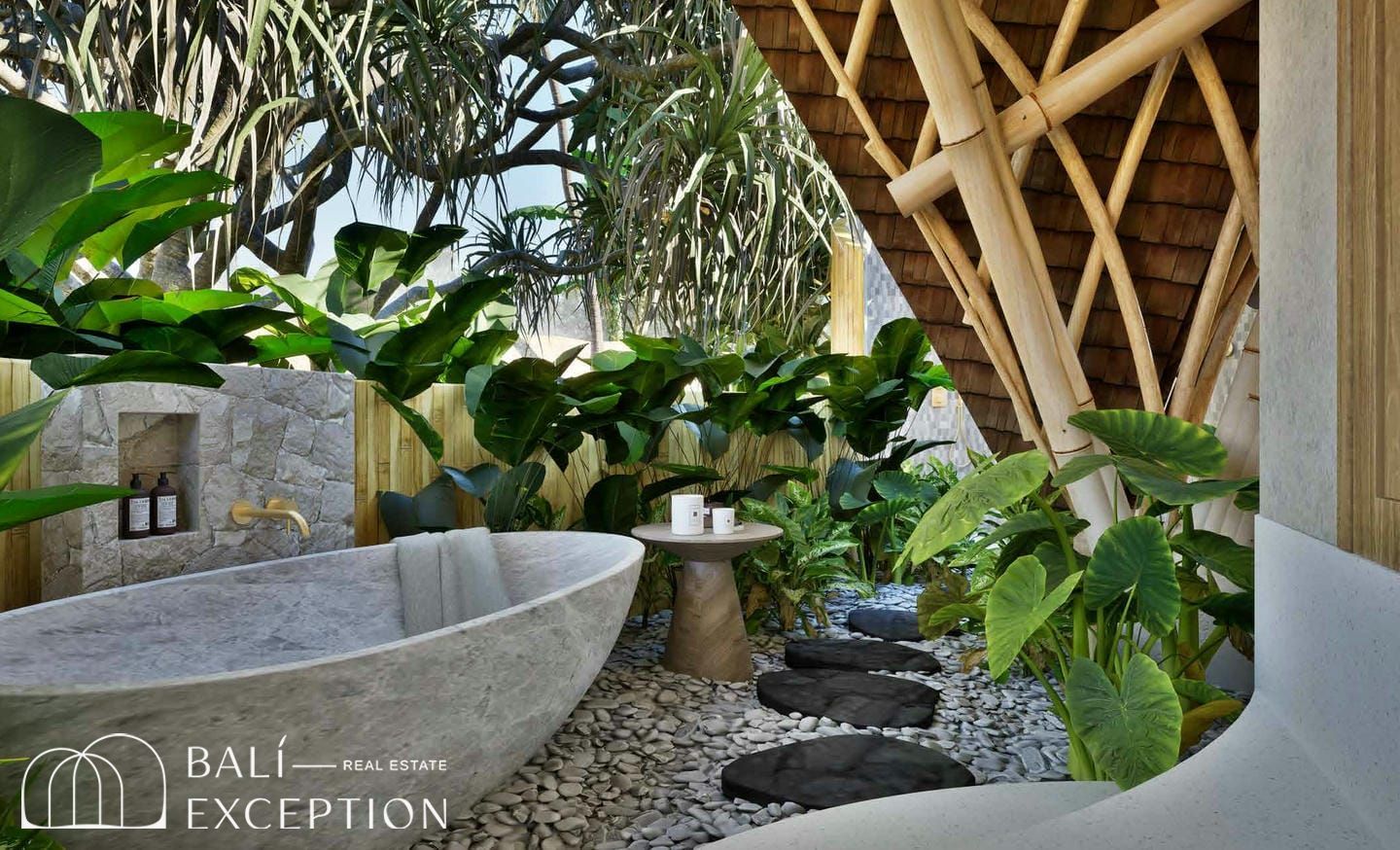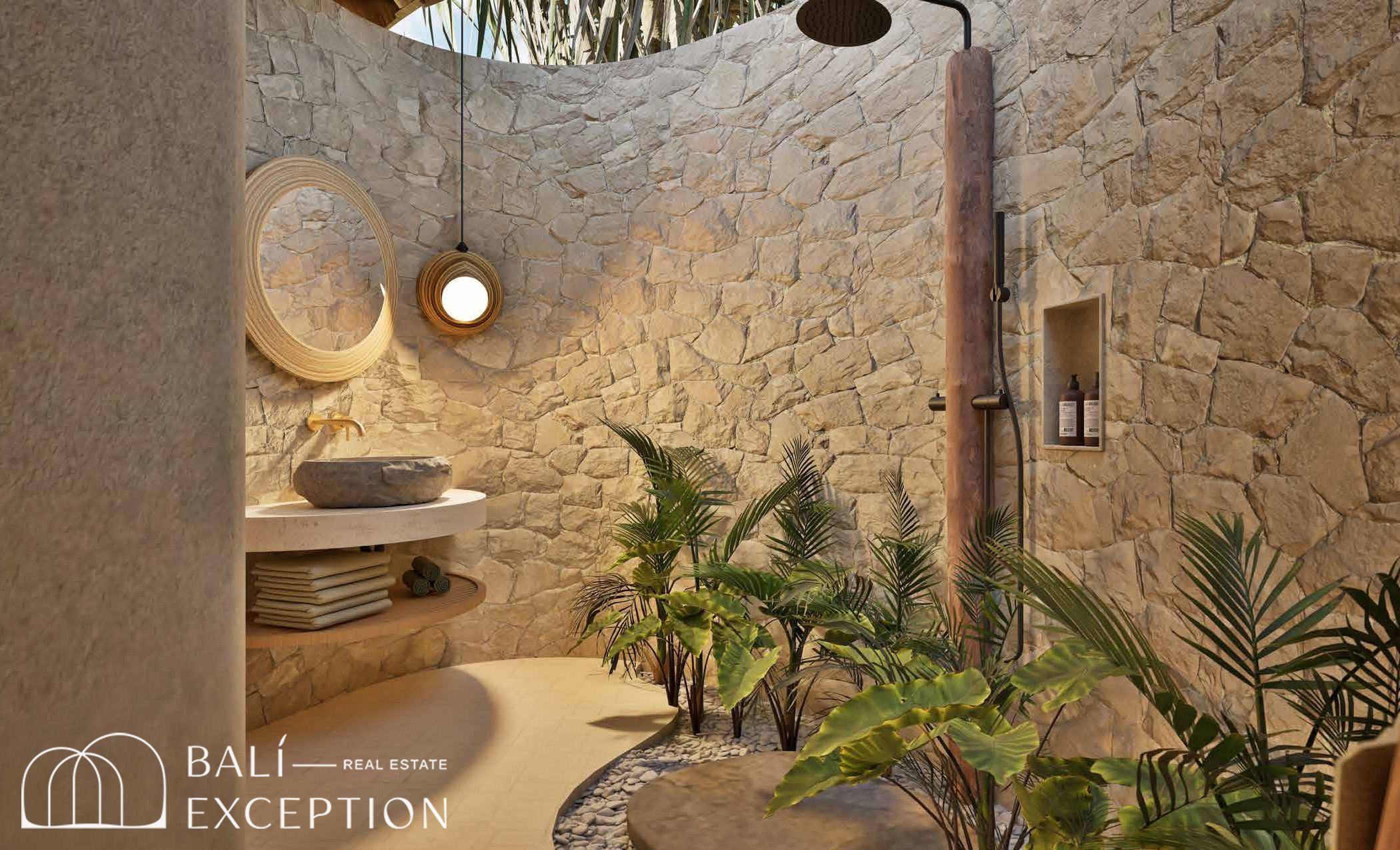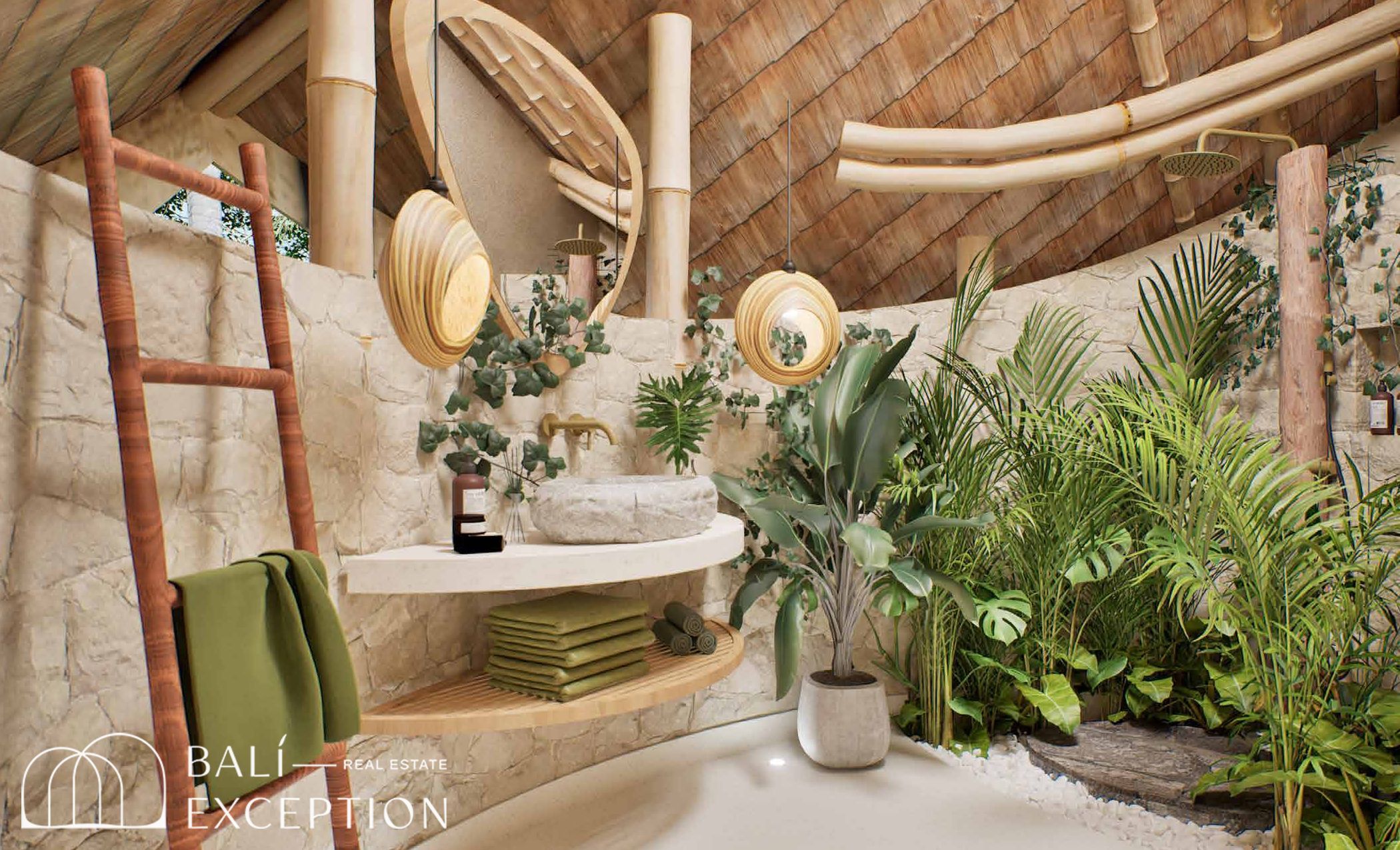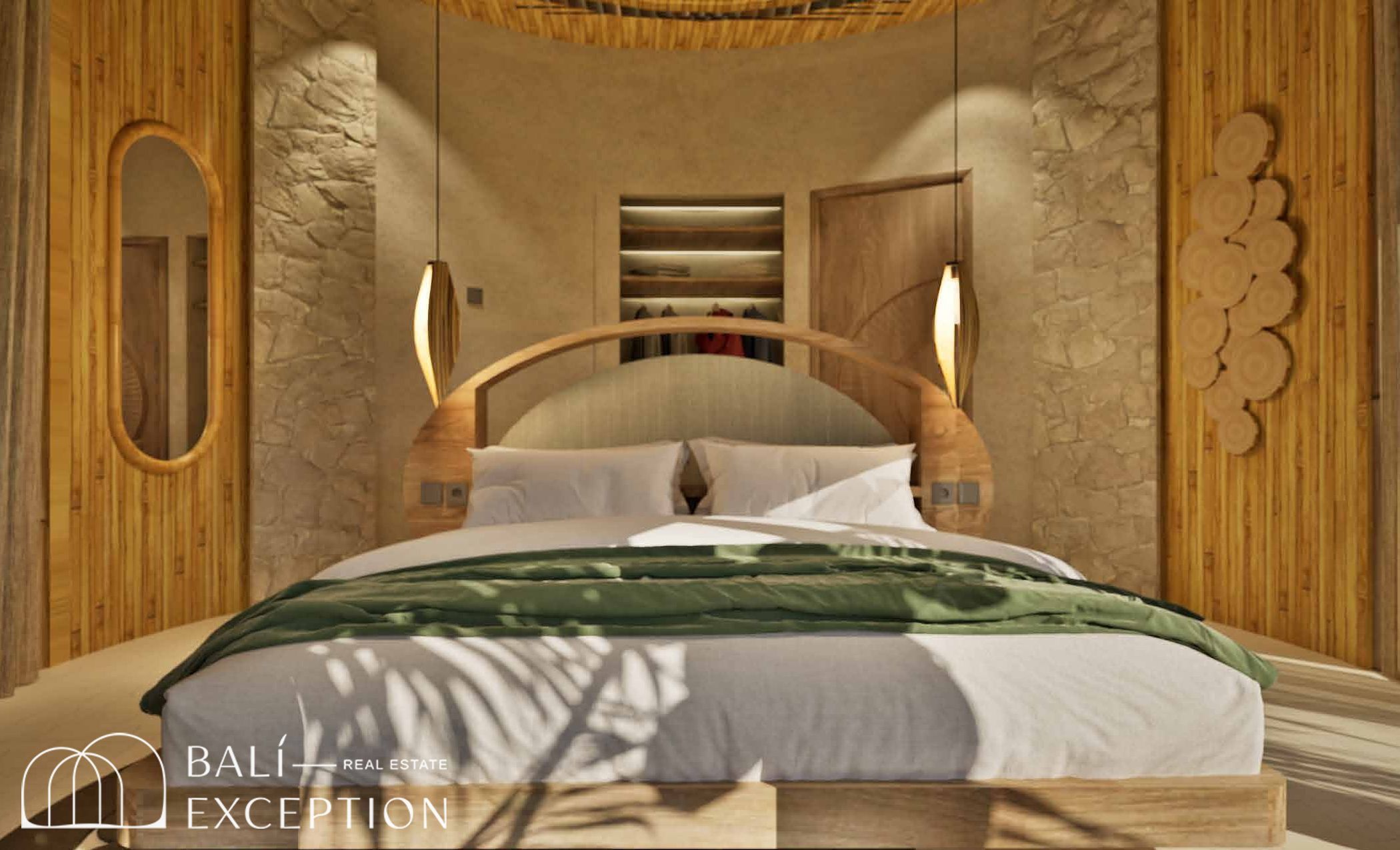 L’intérieur présente un style tropical organique chaleureux, dominé par des matériaux naturels tels que le bambou, le bois et la pierre. L’architecture met en valeur des structures sculpturales en bambou, des tons doux et terreux, ainsi que des détails artisanaux, créant une atmosphère à la fois cosy et design. Les hauts plafonds et les espaces ouverts renforcent la circulation de l’air et la luminosité naturelle, offrant une sensation d’espace sereine et aérée.