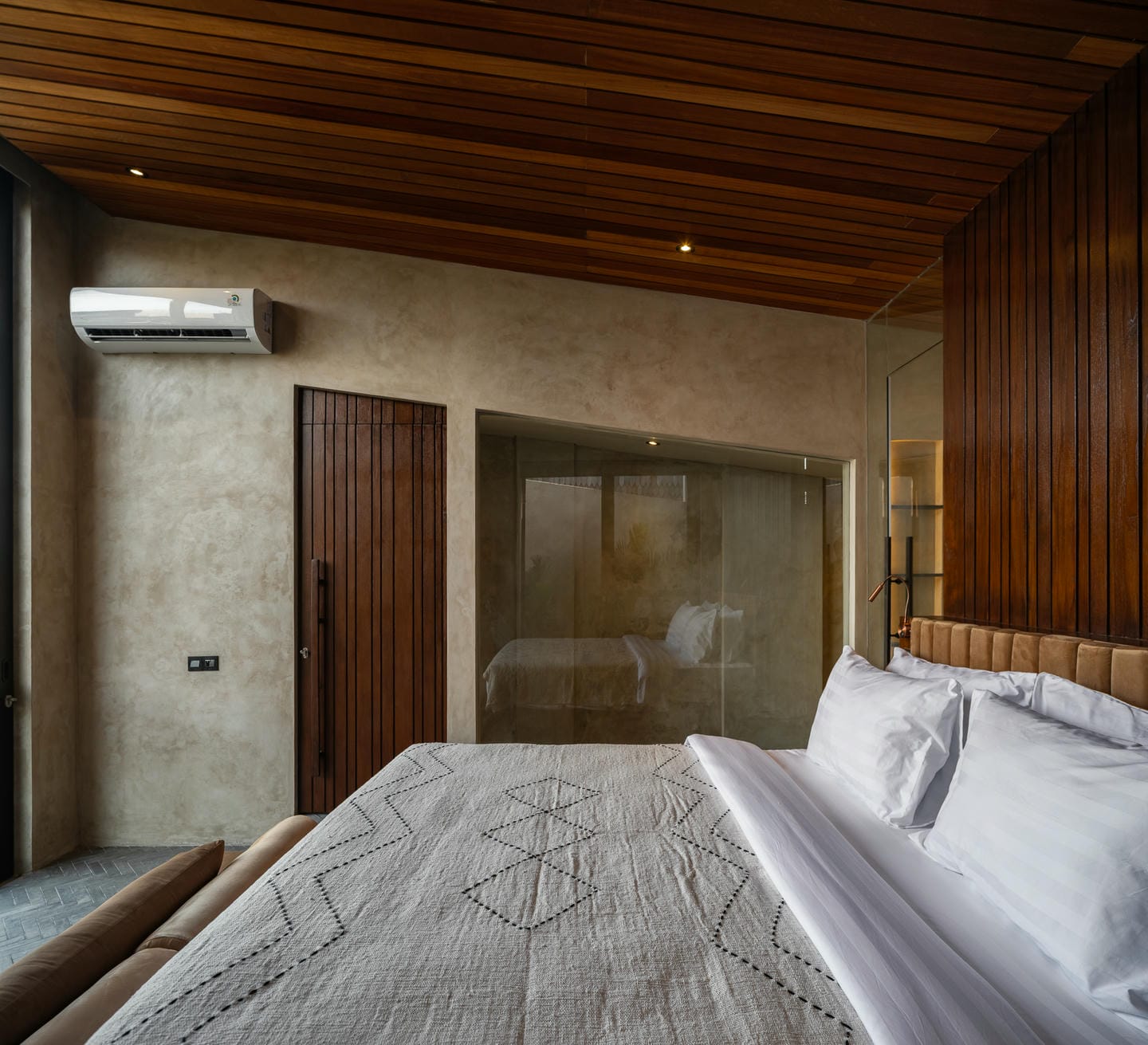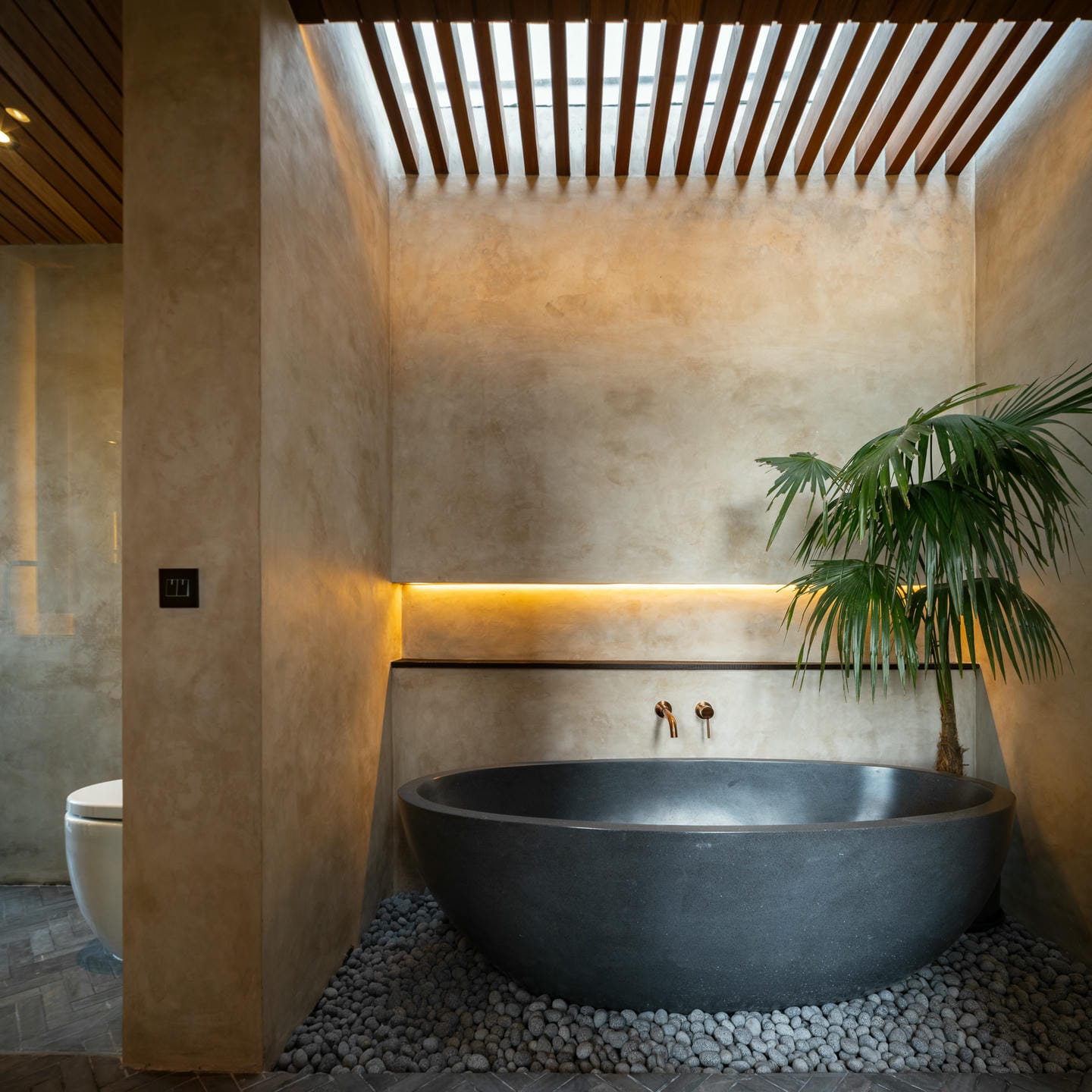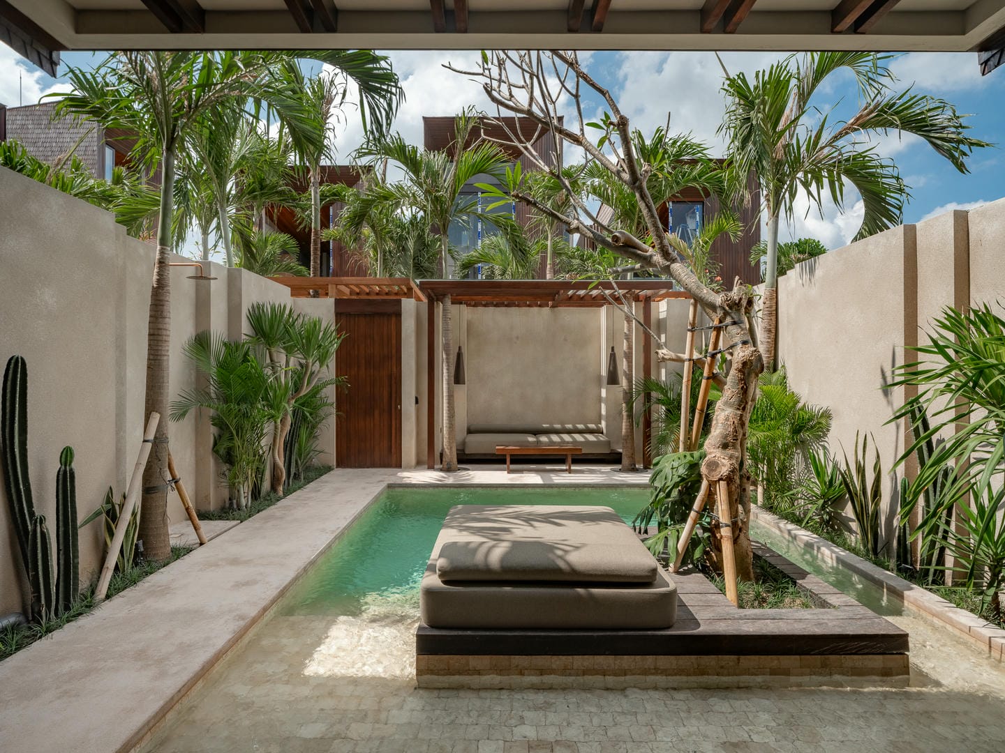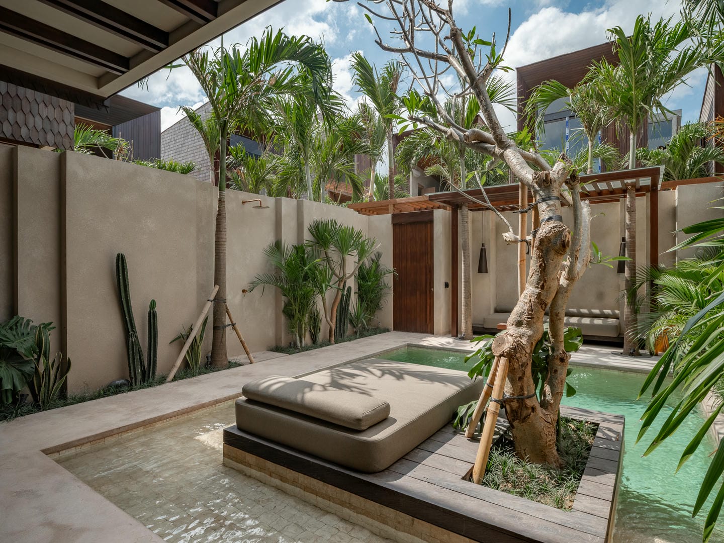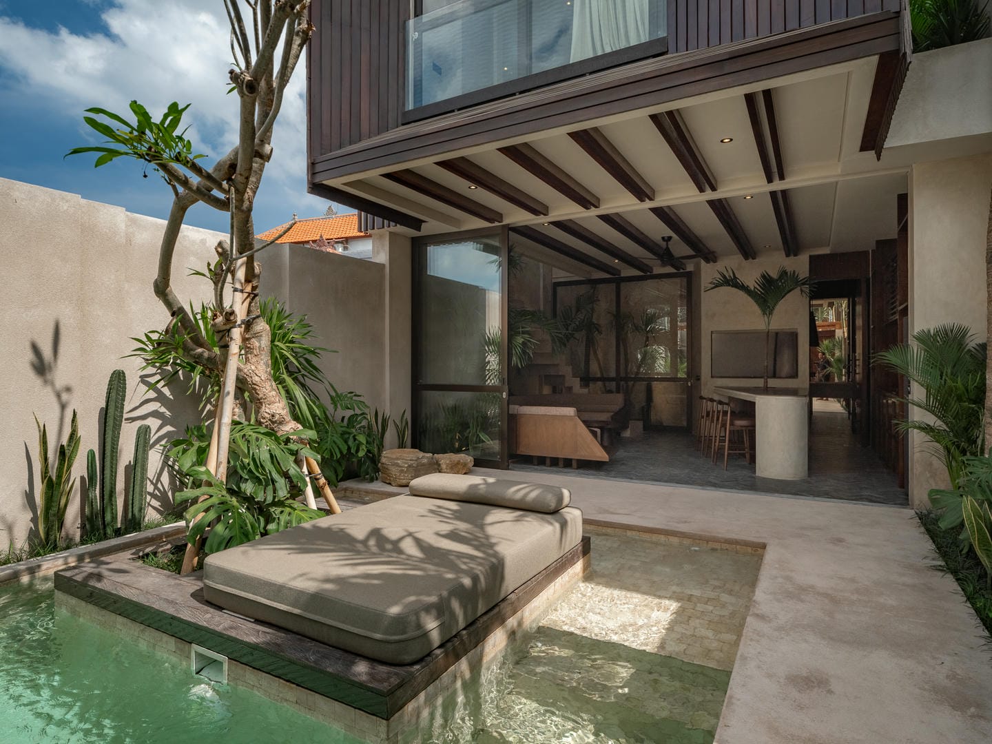 À l’extérieur, la villa dispose d’une piscine privée entourée de plantes tropicales et de murs minimalistes, offrant intimité et détente. Le design favorise une transition fluide entre l’intérieur et l’extérieur, parfait pour profiter du soleil balinais toute l’année.