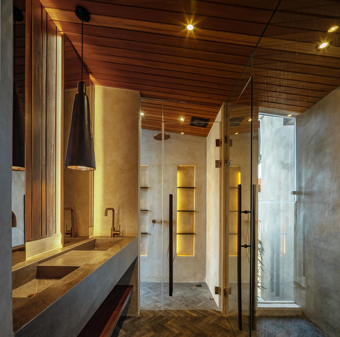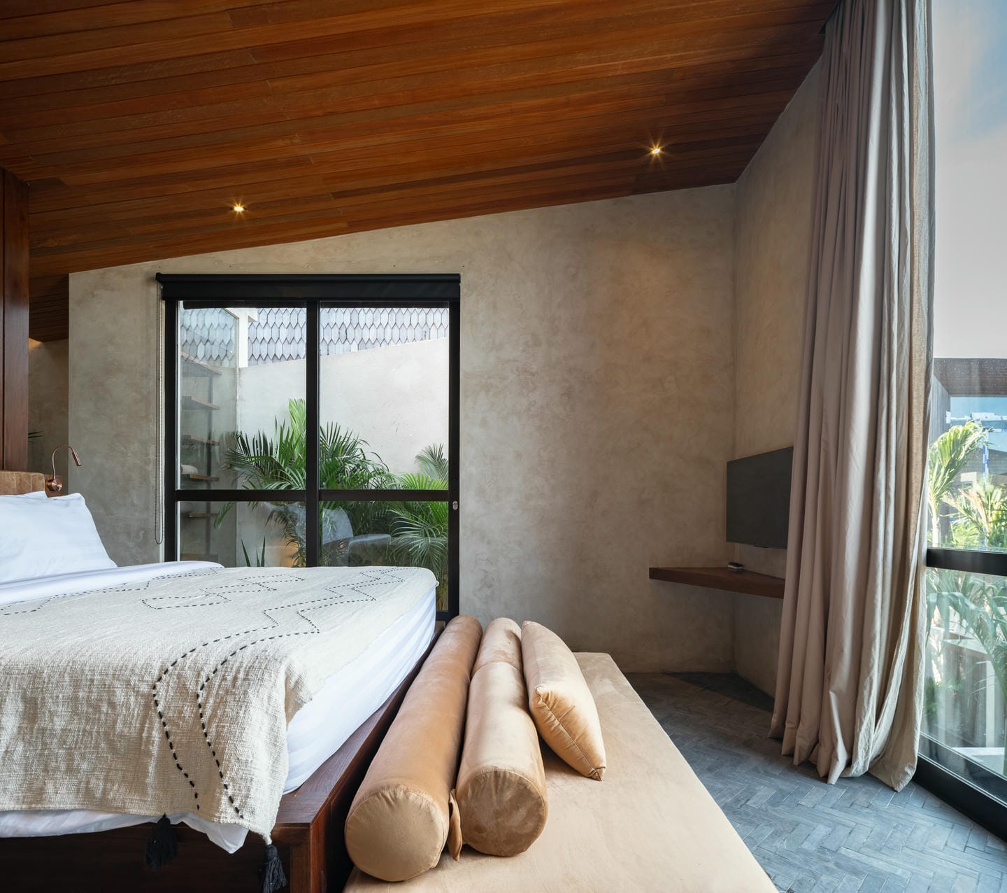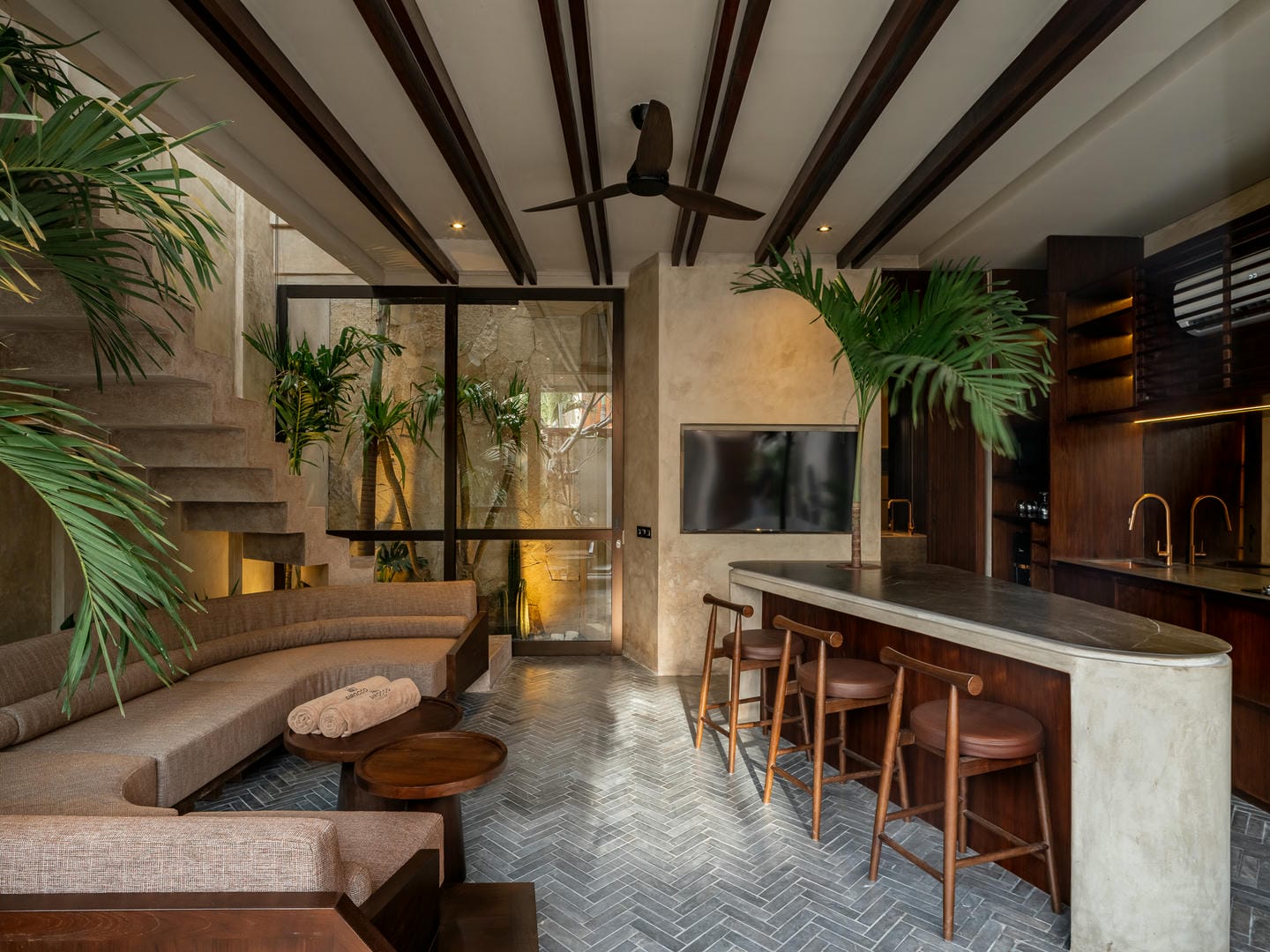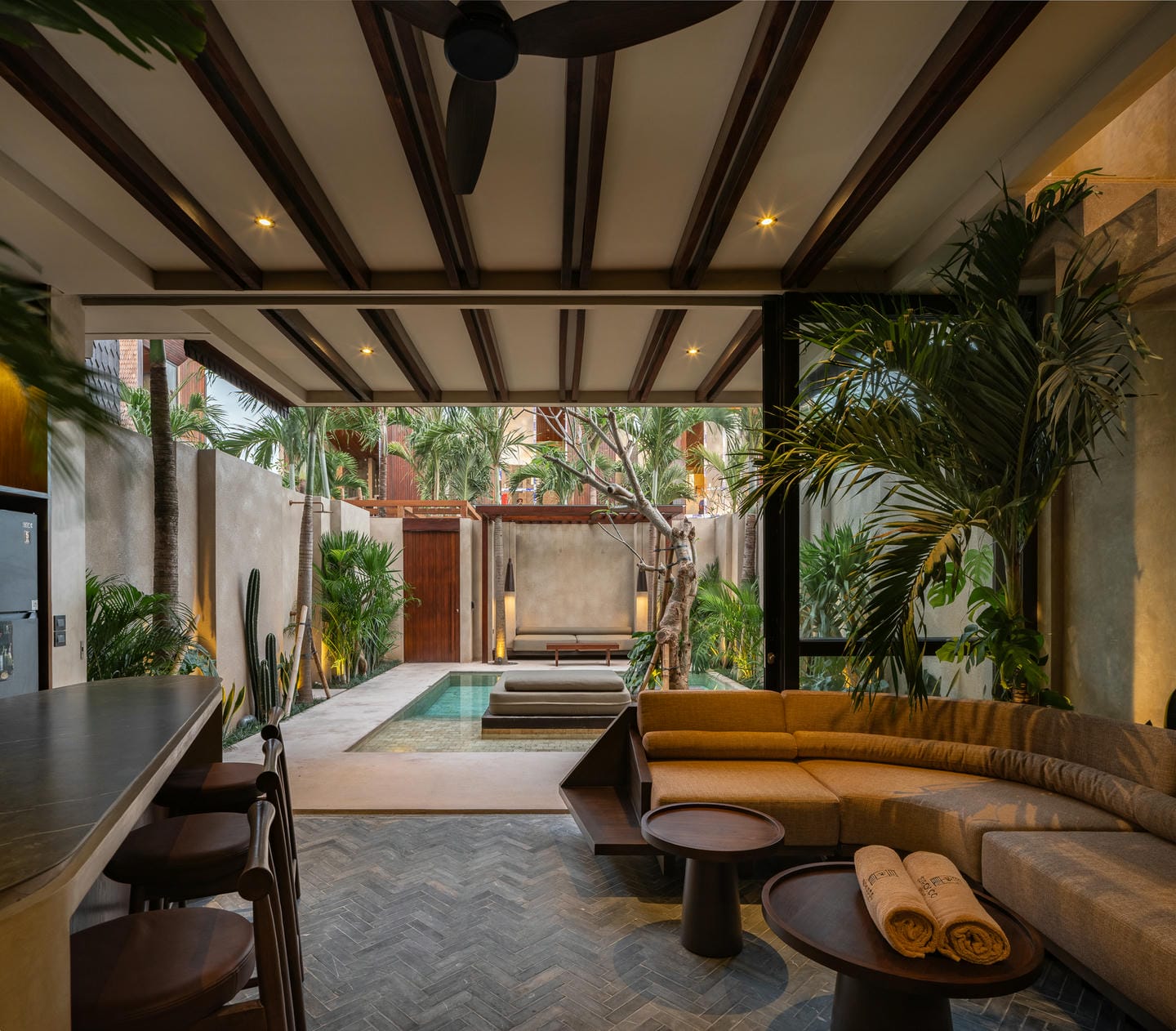 L’intérieur adopte une esthétique tropicale moderne avec des tons terreux chaleureux, des textures naturelles et des accents élégants en bois. L’espace de vie ouvert intègre harmonieusement la cuisine, la salle à manger et le salon, sublimé par la verdure luxuriante et la lumière naturelle qui créent une atmosphère rafraîchissante.