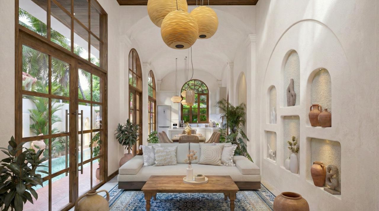 À l’intérieur, la villa met en valeur des textures de bois chaleureux, un décor artisanal et des tons naturels et apaisants. La chambre principale constitue un véritable havre de paix, tandis que la salle de bain attenante se distingue par une baignoire sculpturale, complétée par une salle de bain supplémentaire pour plus de confort. Entièrement meublée, la villa dispose d’un espace de vie ouvert qui relie harmonieusement le salon, le coin repas élégant et la cuisine entièrement équipée, le tout sublimé par de magnifiques arches et détails artisanaux.