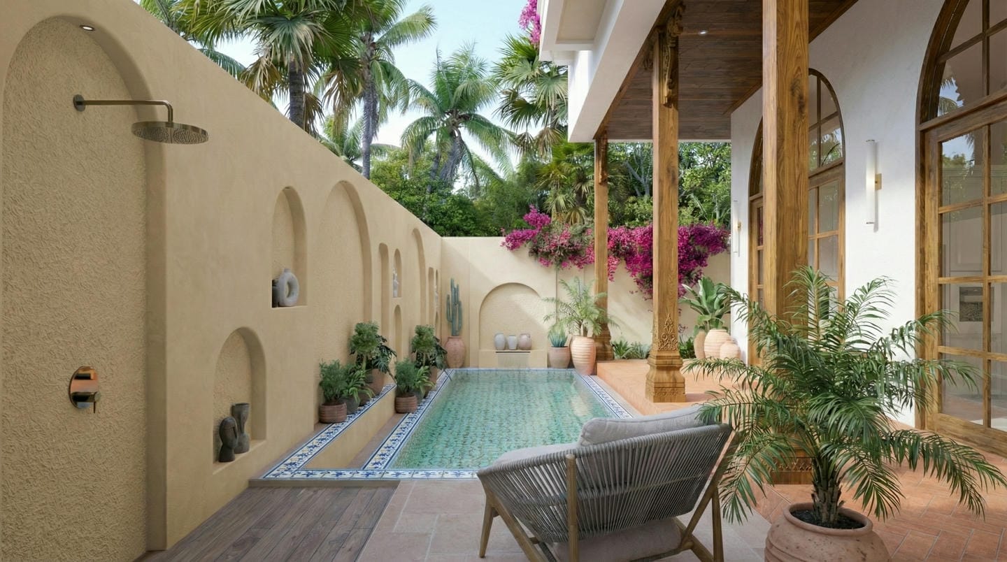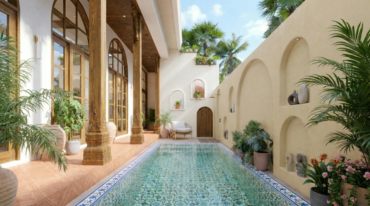 À l’extérieur, la villa offre une charmante piscine privée, encadrée de carreaux méditerranéens, de verdure luxuriante et d’espaces lounge accueillants, parfaits pour se détendre sous le soleil balinais.