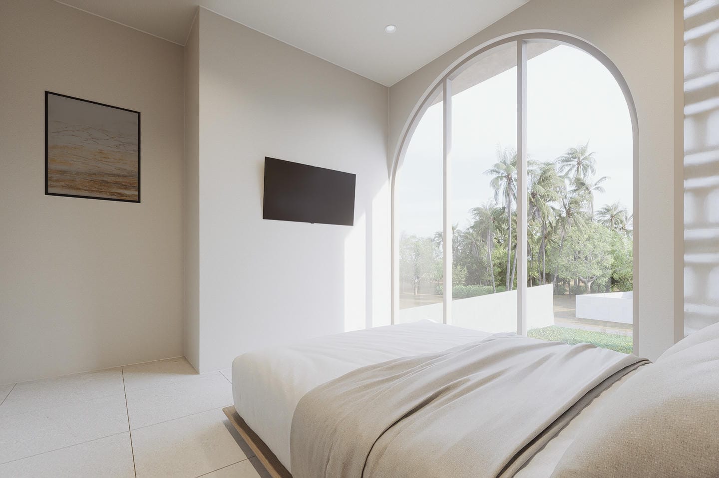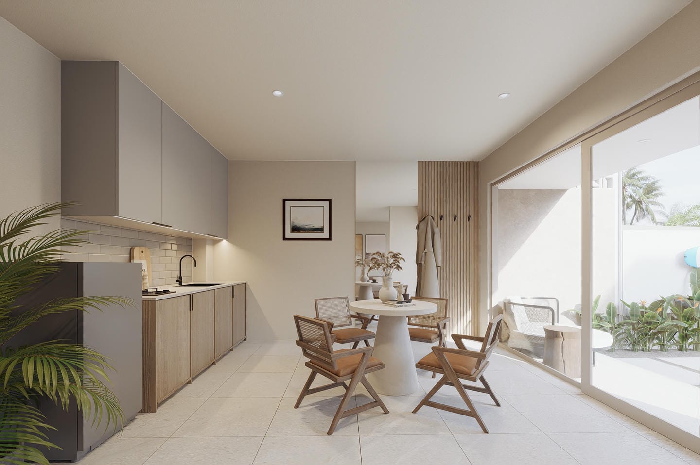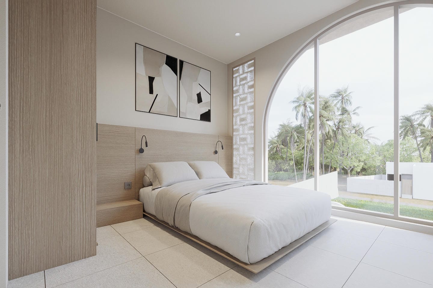 Cette villa moderne en 2 chambre comprend une salle de bain attenante et un intérieur entièrement meublé avec un salon élégant, un espace repas et une cuisine bien équipée pour une expérience de vie harmonieuse. De grandes baies vitrées inondent l’espace de lumière naturelle, créant une atmosphère lumineuse et aérée.