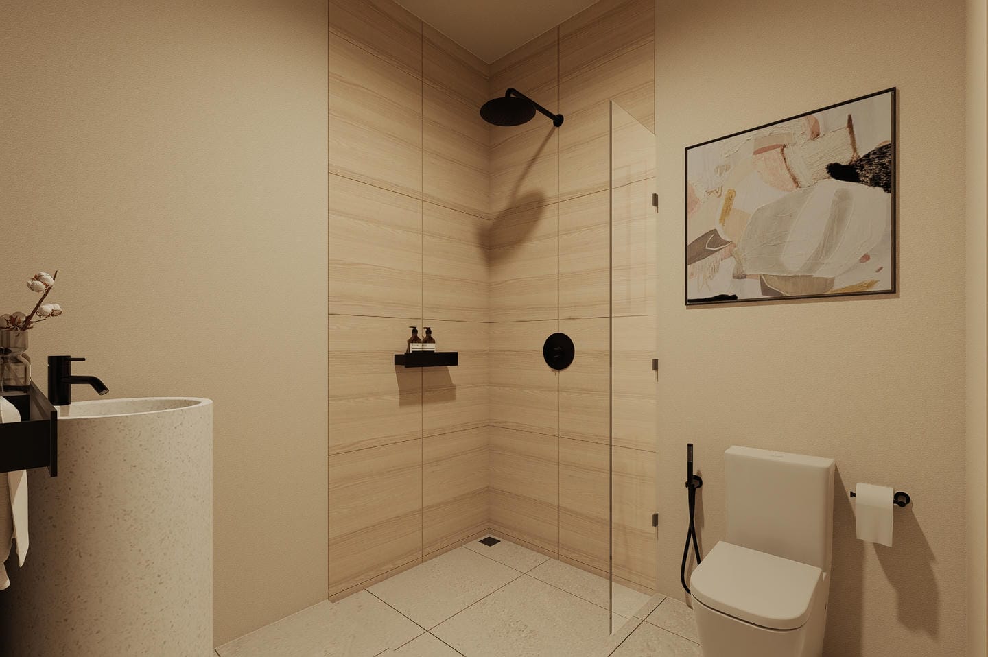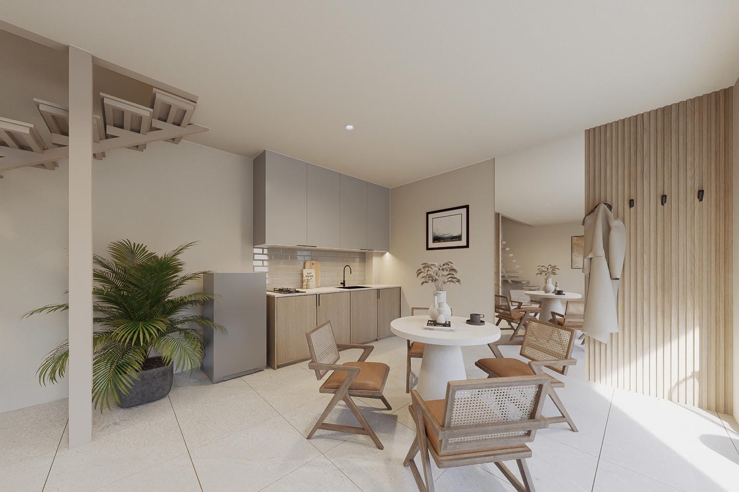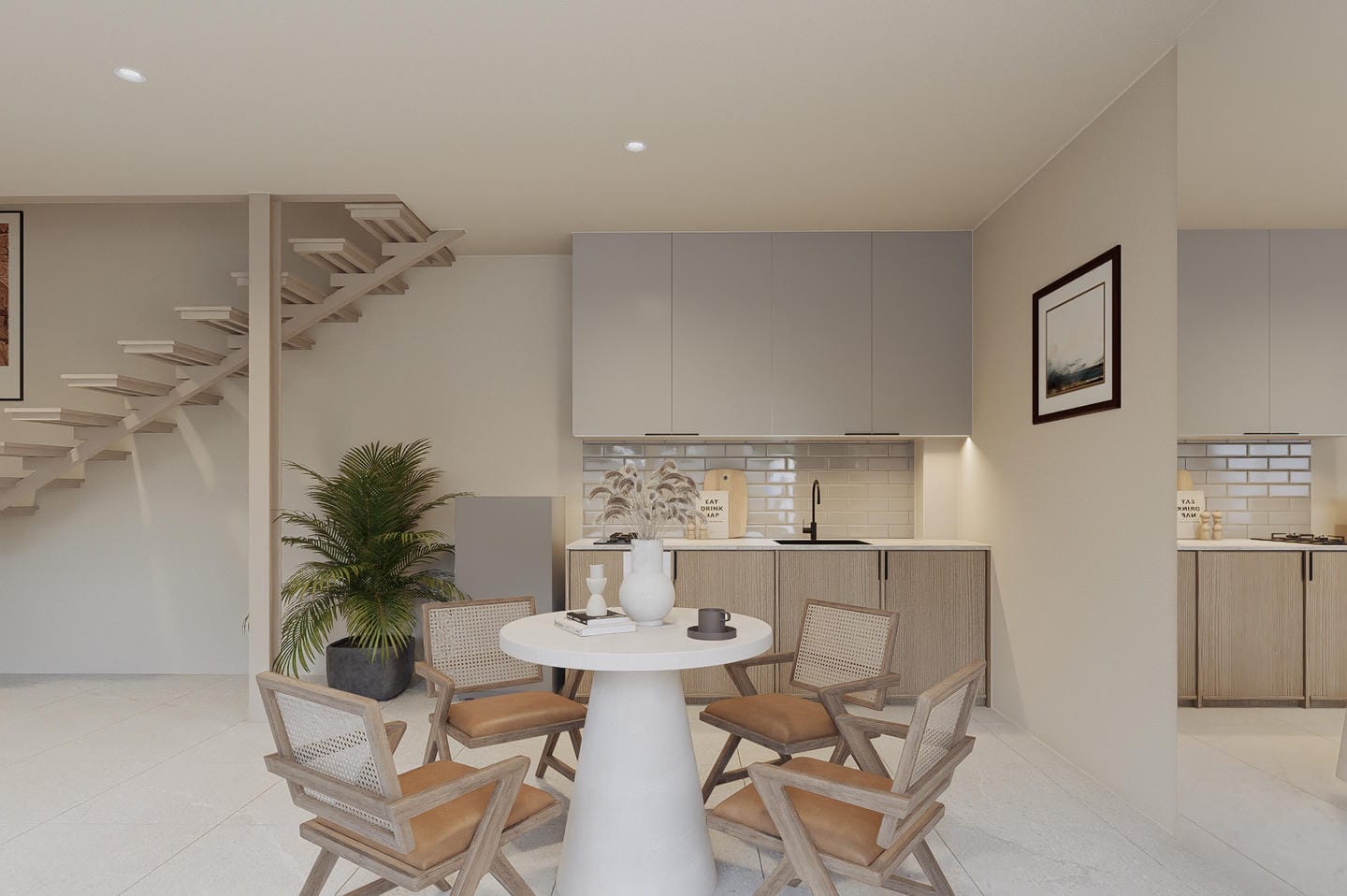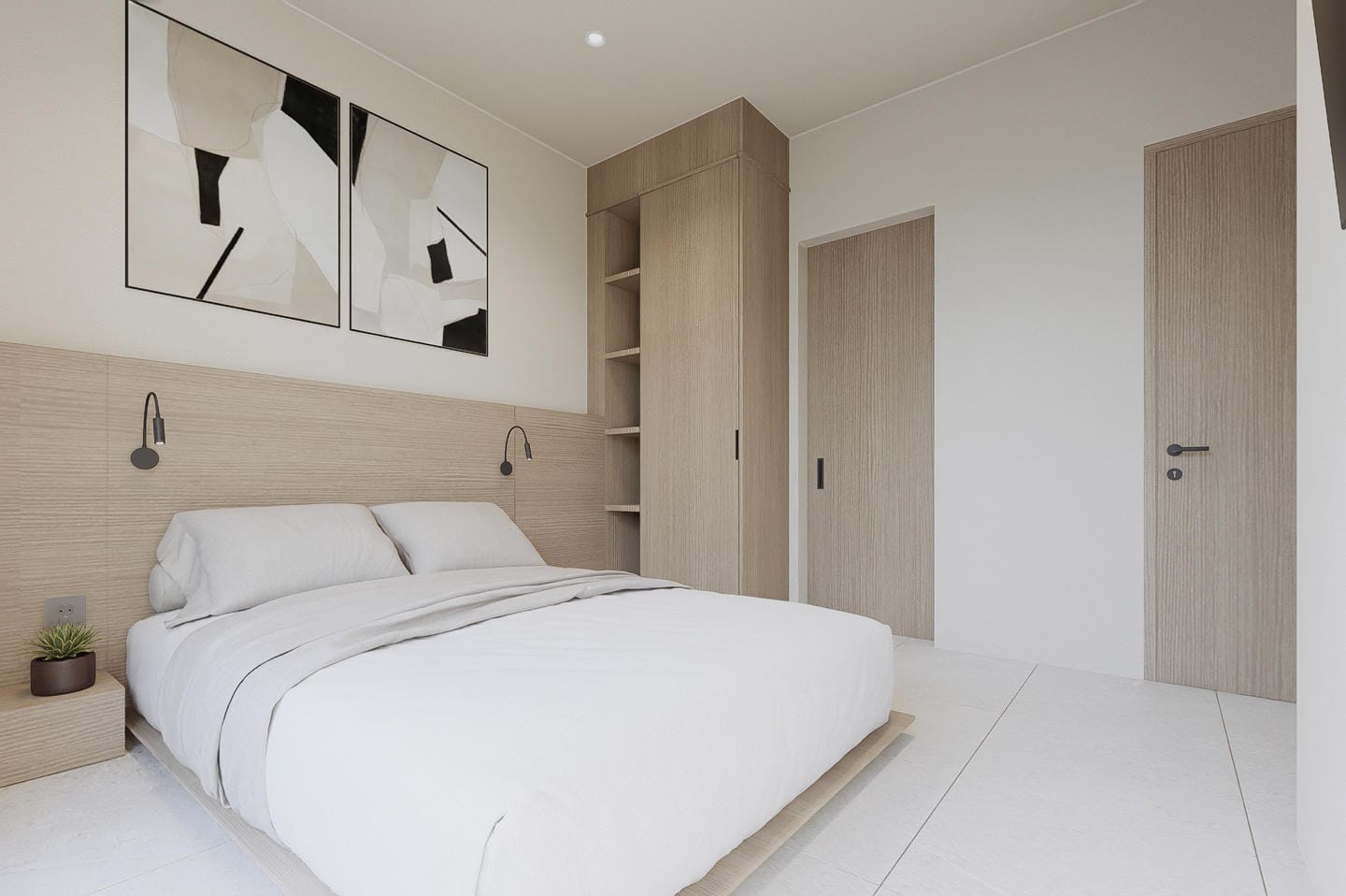 Cette villa moderne en 2 chambre comprend une salle de bain attenante et un intérieur entièrement meublé avec un salon élégant, un espace repas et une cuisine bien équipée pour une expérience de vie harmonieuse. De grandes baies vitrées inondent l’espace de lumière naturelle, créant une atmosphère lumineuse et aérée.