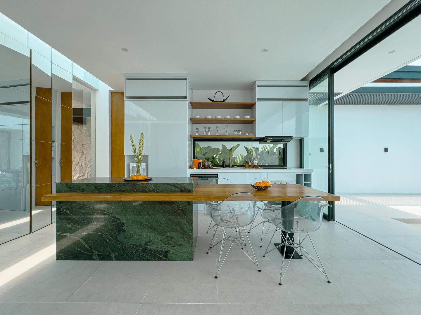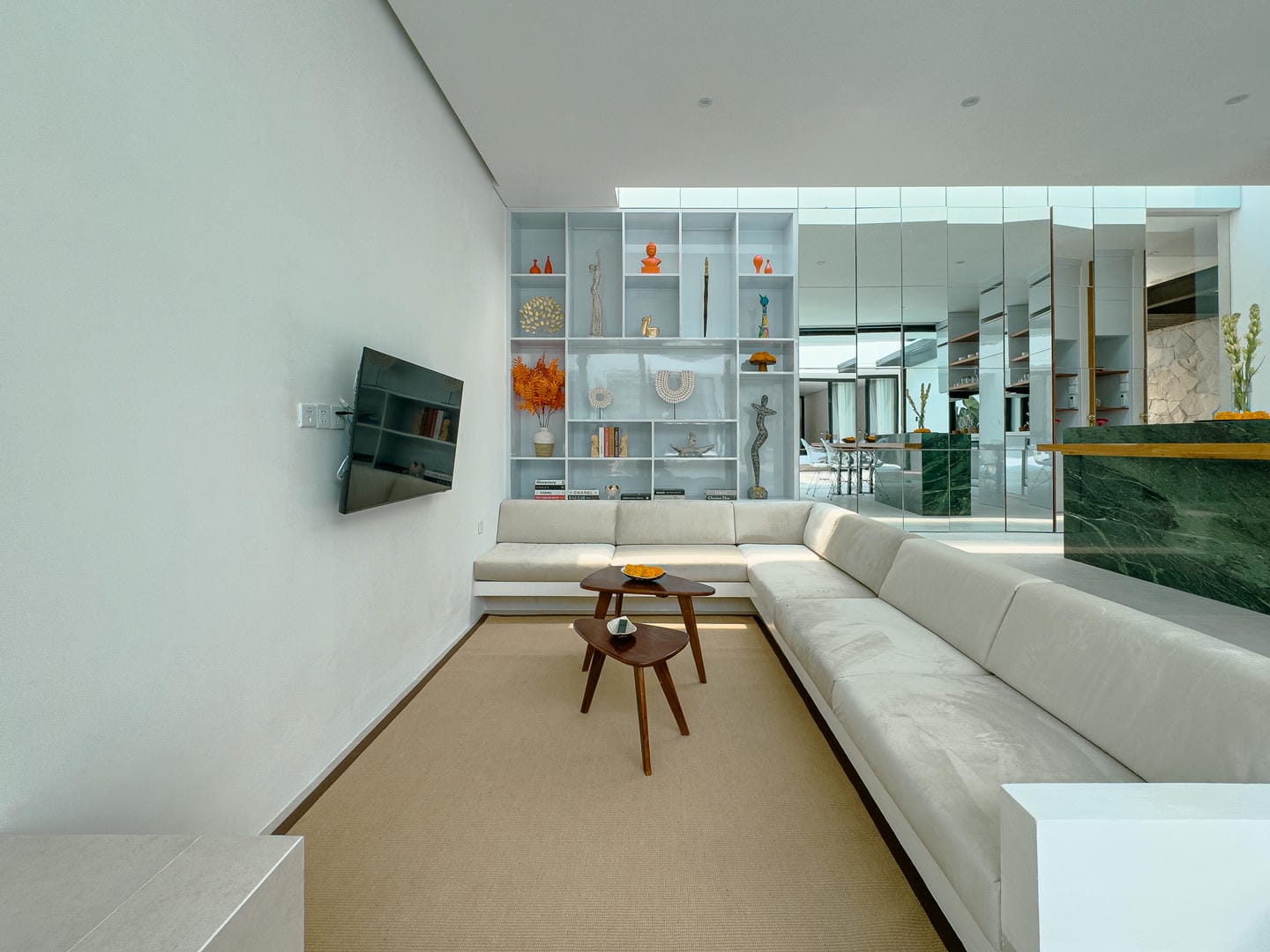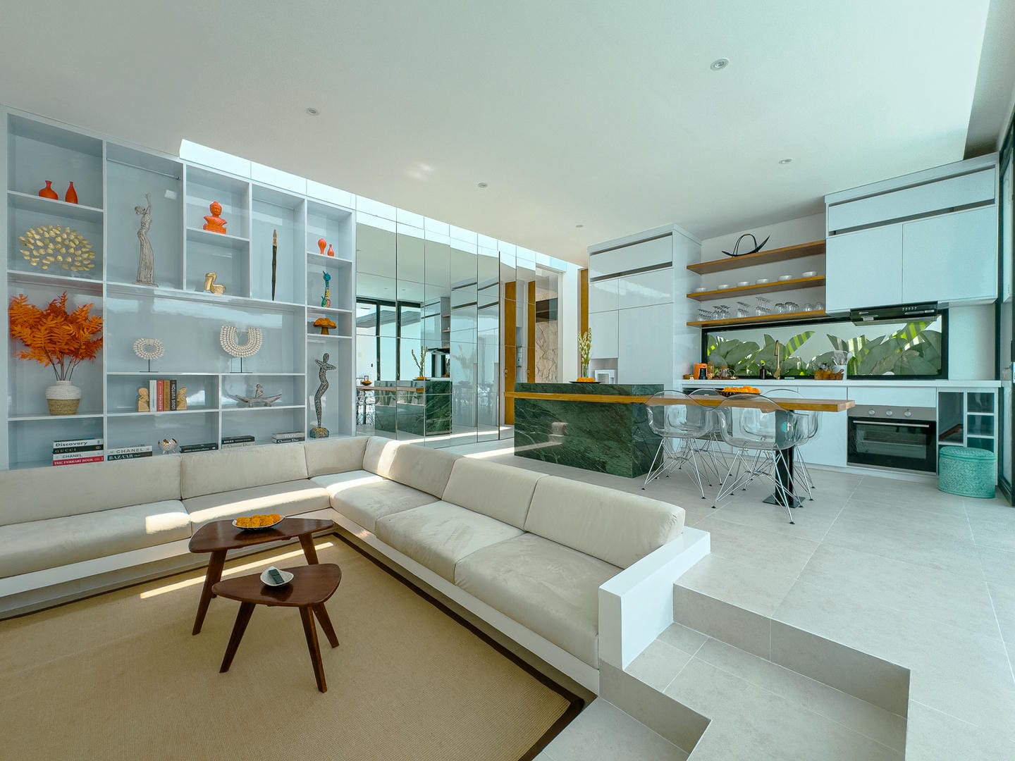 Découvrez un intérieur raffiné, alliant un style minimaliste et moderne à des éléments naturels chaleureux. L'espace de vie ouvert comprend un élégant salon en contrebas, une cuisine élégante avec îlot central en marbre et des étagères soigneusement agencées, alliant fonctionnalité et charme esthétique. La palette de couleurs neutres, les touches de bois et l'éclairage tamisé créent une atmosphère accueillante et apaisante.