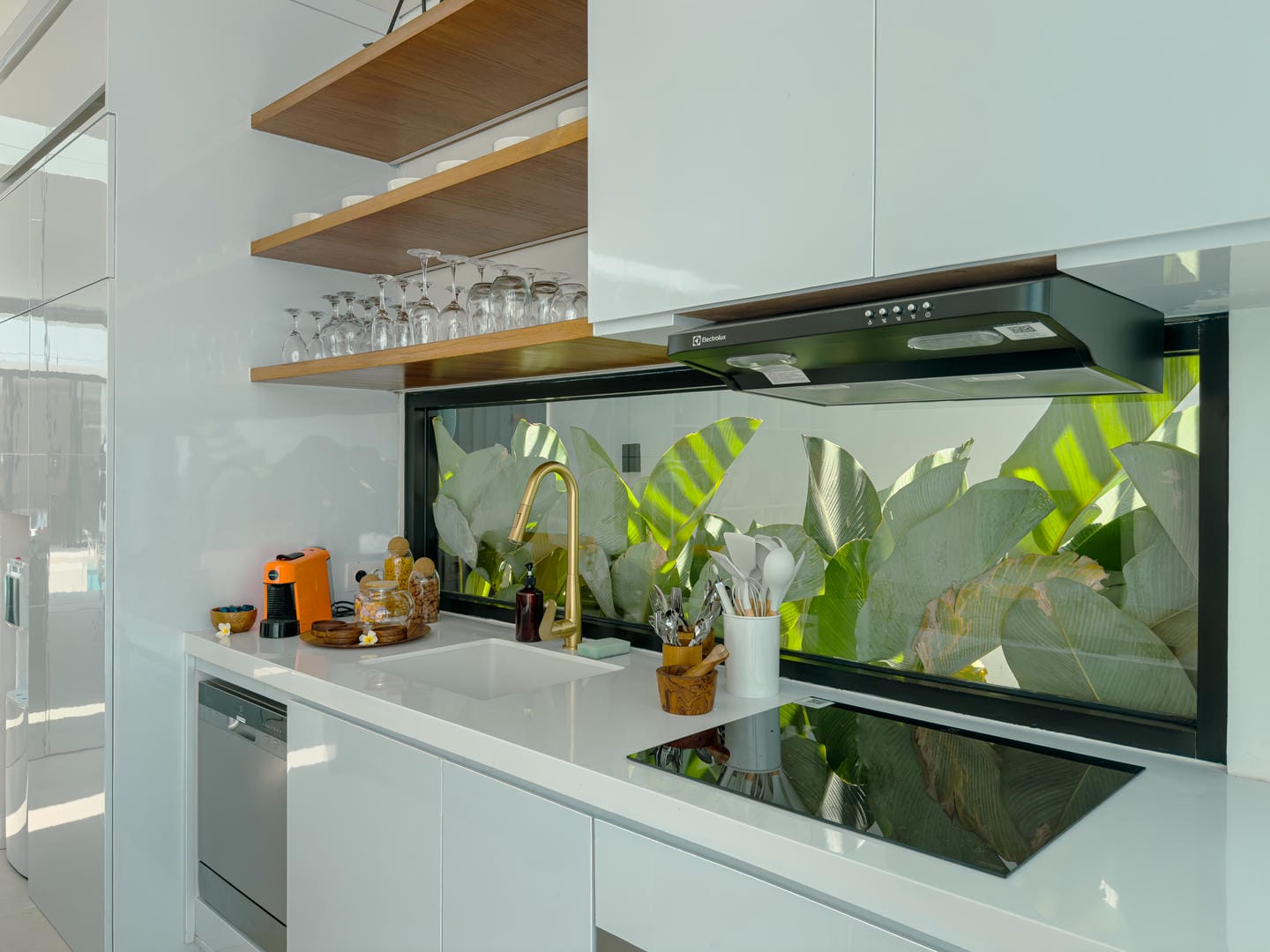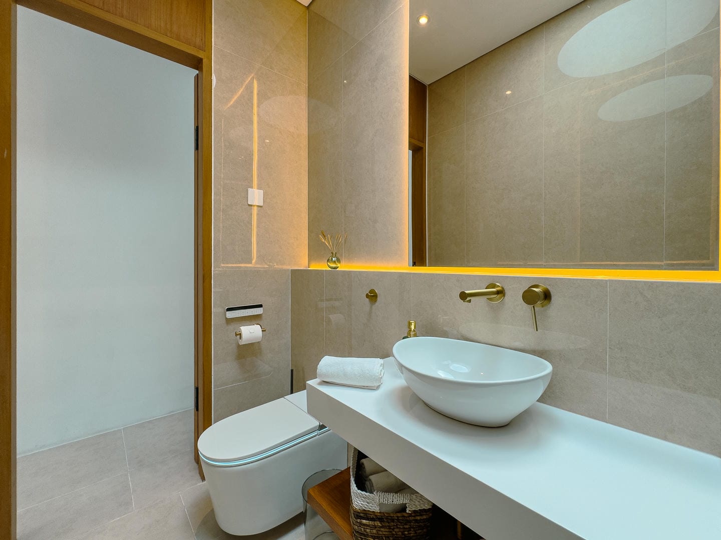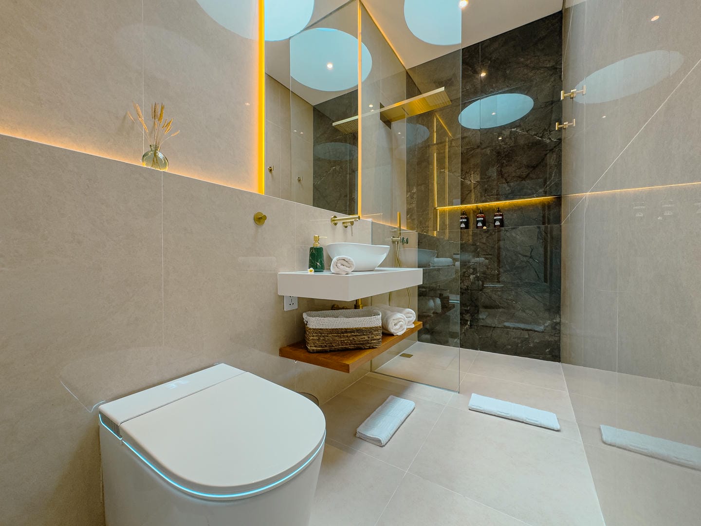 Découvrez un intérieur raffiné, alliant un style minimaliste et moderne à des éléments naturels chaleureux. L'espace de vie ouvert comprend un élégant salon en contrebas, une cuisine élégante avec îlot central en marbre et des étagères soigneusement agencées, alliant fonctionnalité et charme esthétique. La palette de couleurs neutres, les touches de bois et l'éclairage tamisé créent une atmosphère accueillante et apaisante.