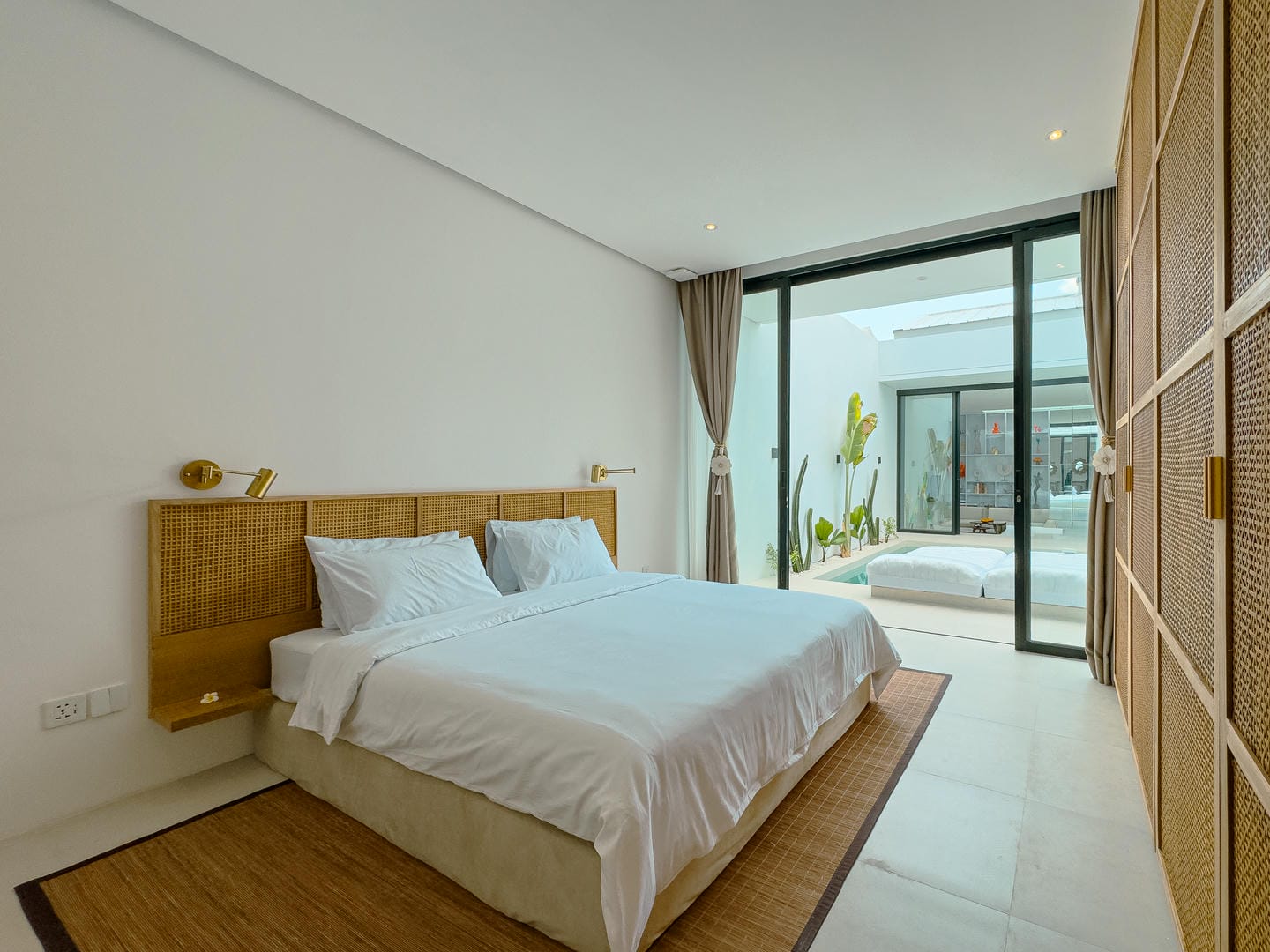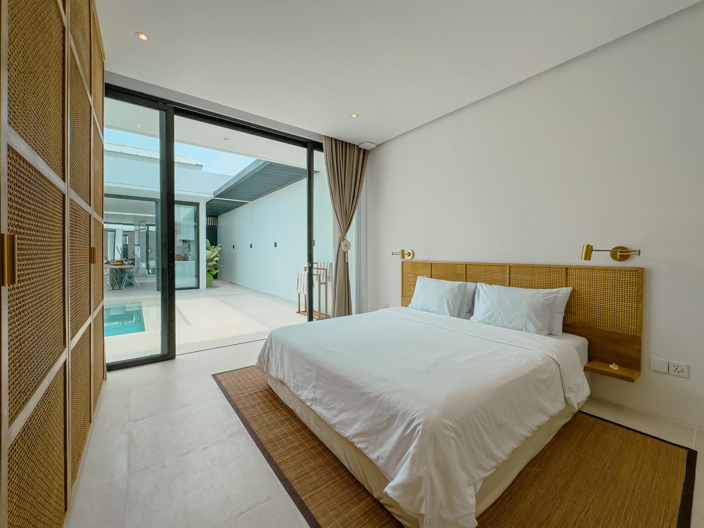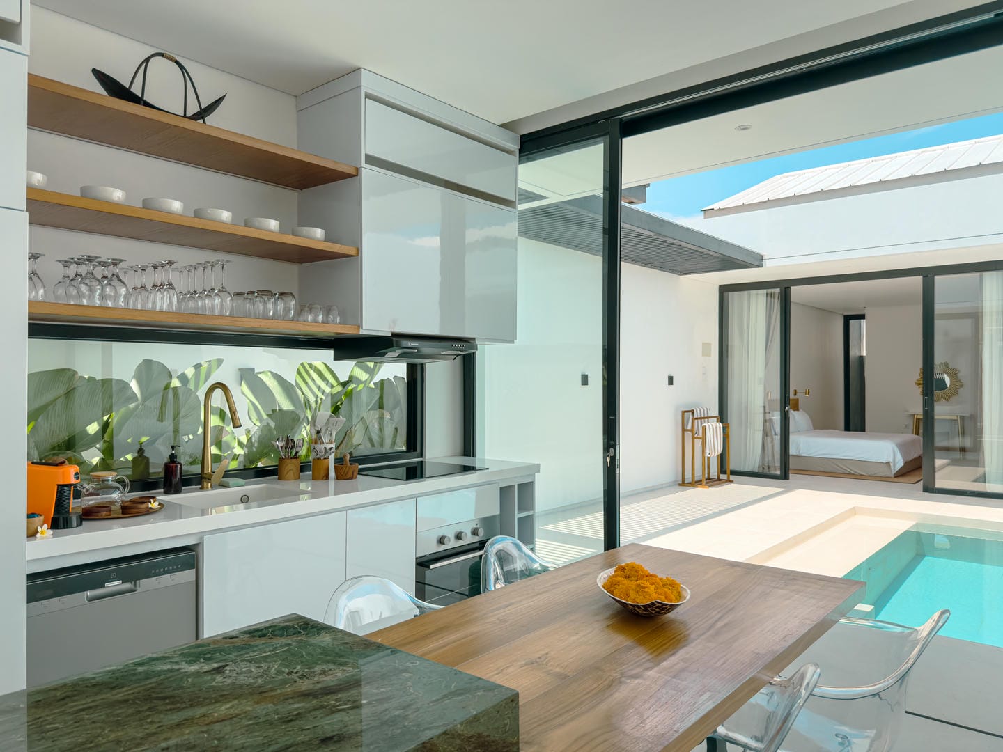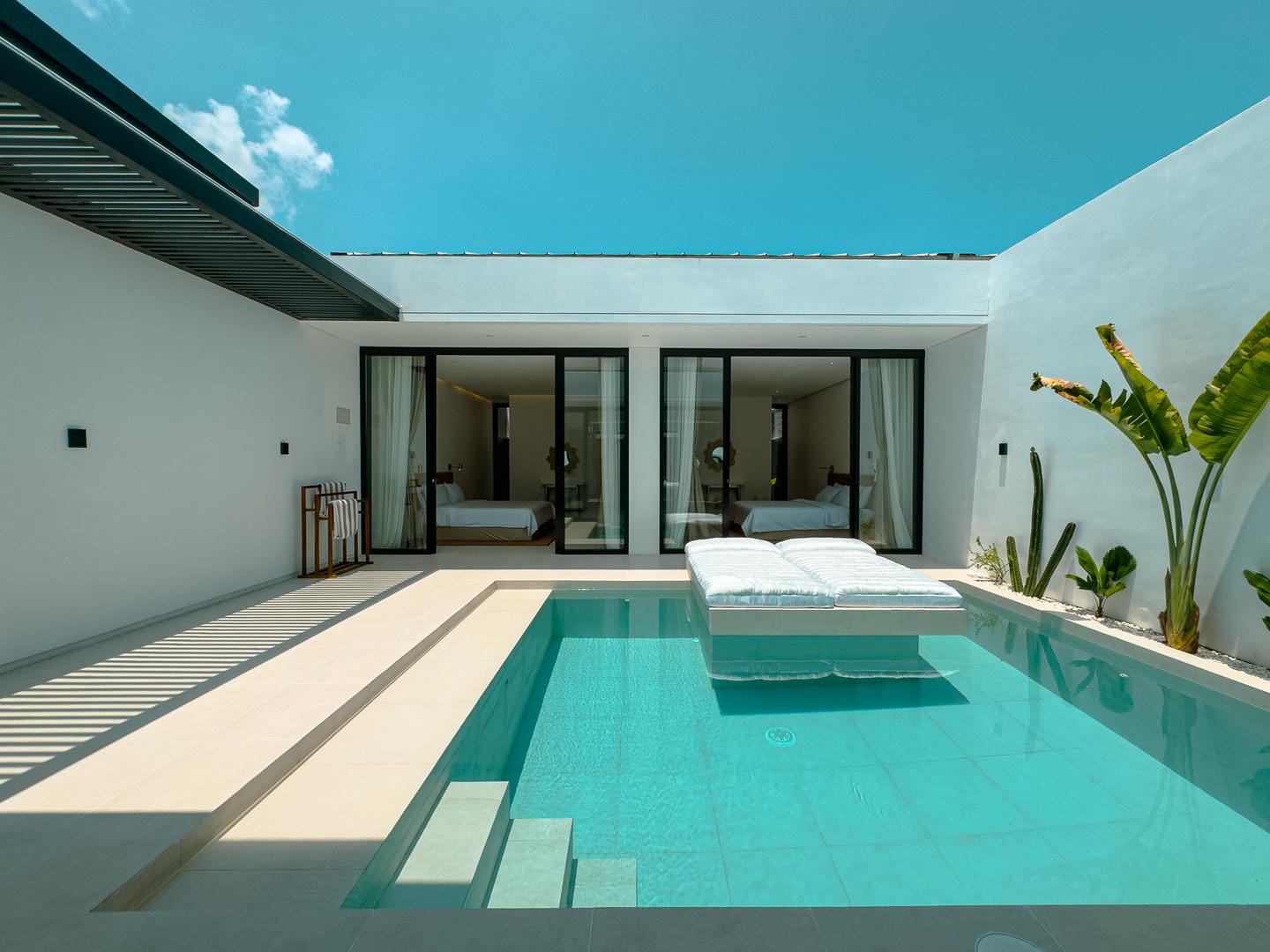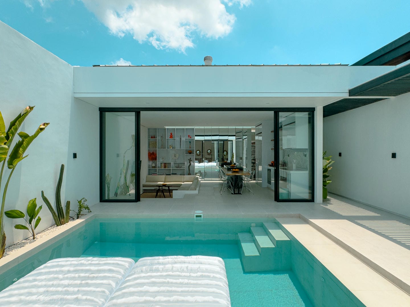 À l'extérieur, la villa offre une magnifique piscine privée entourée d'un paysage tropical et de lignes architecturales épurées. Une méridienne et un mur végétal vertical subliment l'espace, idéal pour se détendre et recevoir.