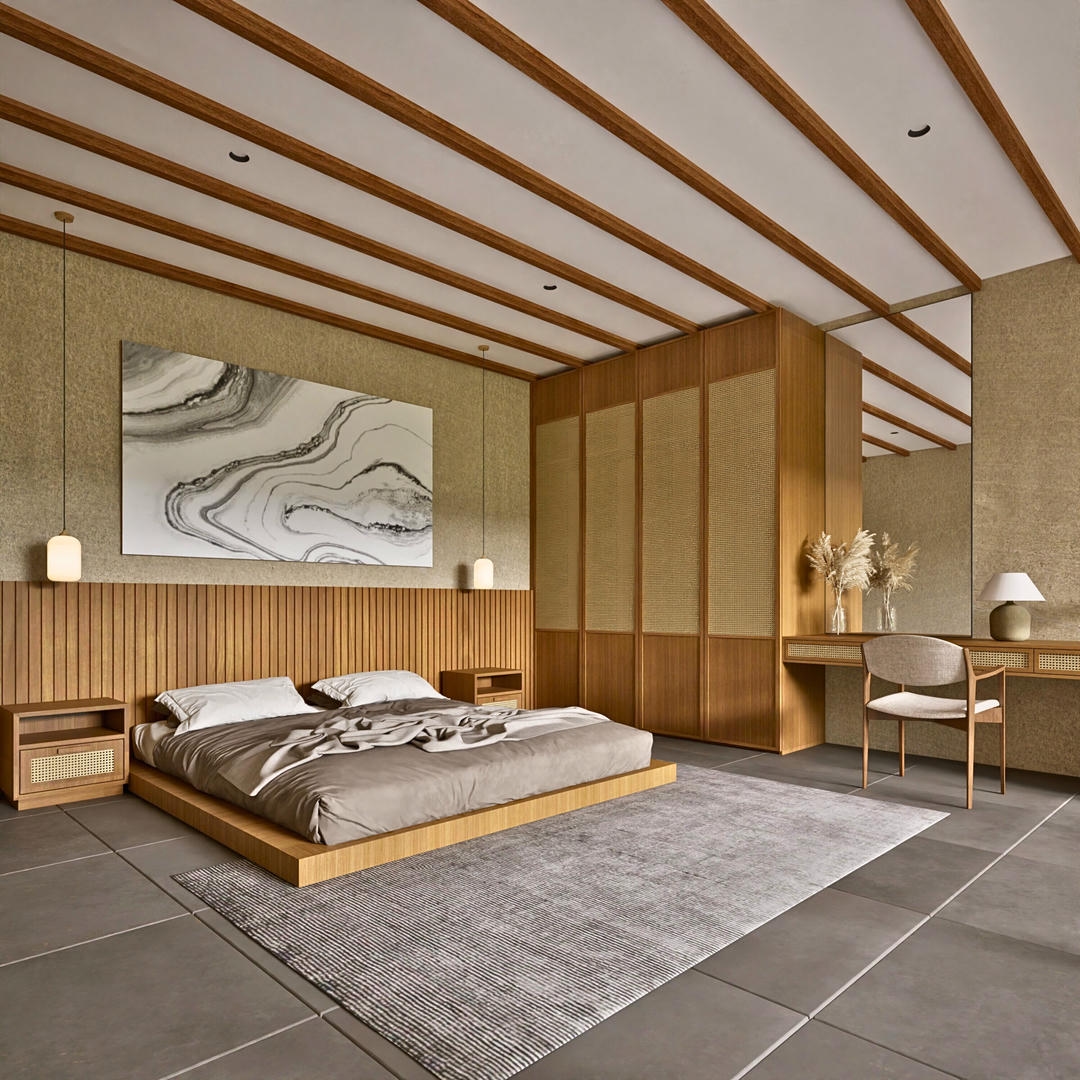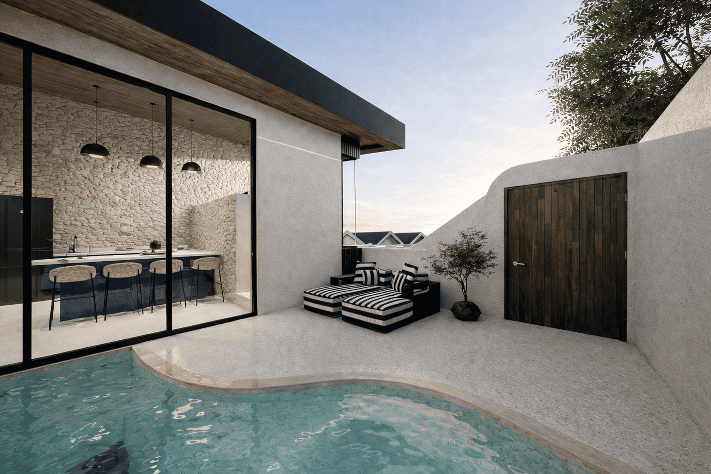 À l’extérieur, profitez de votre piscine privée accompagnée d’un espace lounge, parfait pour se détendre dans une atmosphère tropicale.