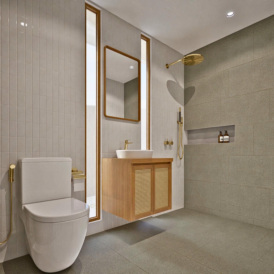 Cette villa en cours de construction, conçue dans un style mezzanine, offre 1 chambre avec salle de bain ensuite, combinant élégance et fonctionnalité. Le séjour fermé, doté de hauts plafonds et de grandes baies vitrées, crée une ambiance lumineuse et aérée. Vous y trouverez également une cuisine équipée ainsi qu’un coin repas chaleureux.