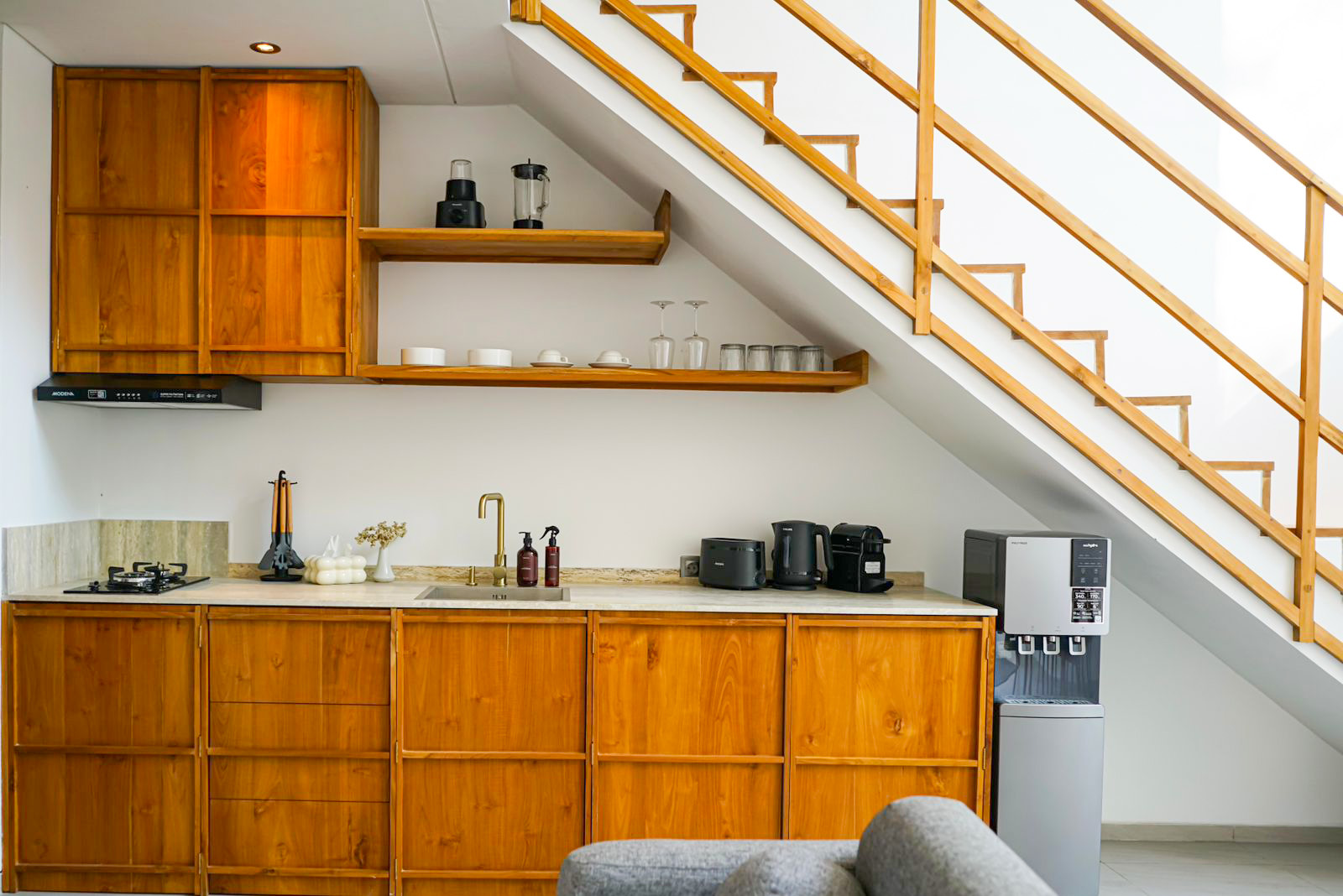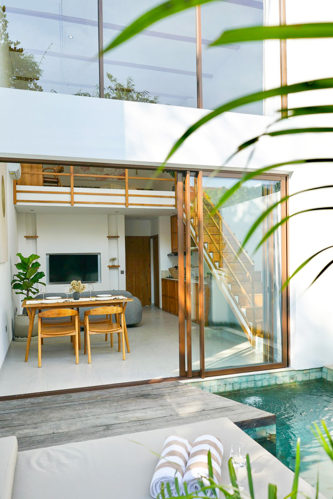 À l’extérieur, profitez de votre piscine privée accompagnée d’un espace lounge, parfait pour se détendre dans une atmosphère tropicale.