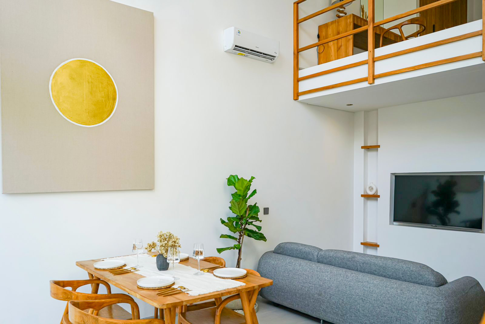 Cette villa en cours de construction, conçue dans un style mezzanine, offre 1 chambre avec salle de bain ensuite, combinant élégance et fonctionnalité. Le séjour fermé, doté de hauts plafonds et de grandes baies vitrées, crée une ambiance lumineuse et aérée. Vous y trouverez également une cuisine équipée ainsi qu’un coin repas chaleureux.