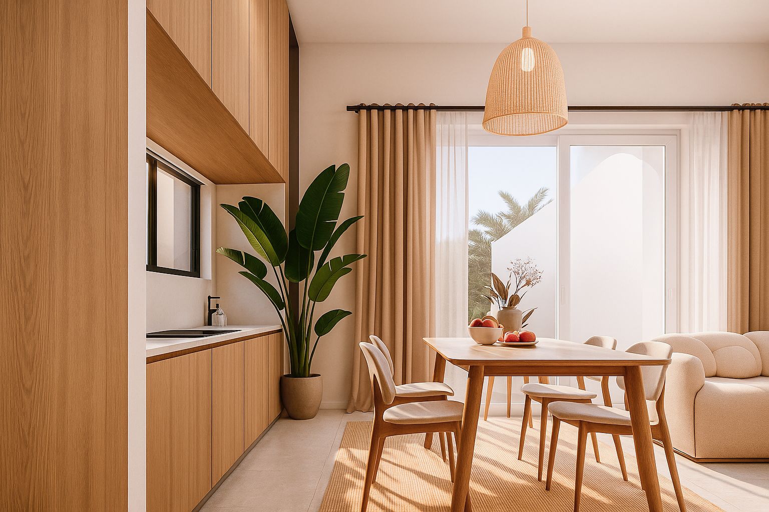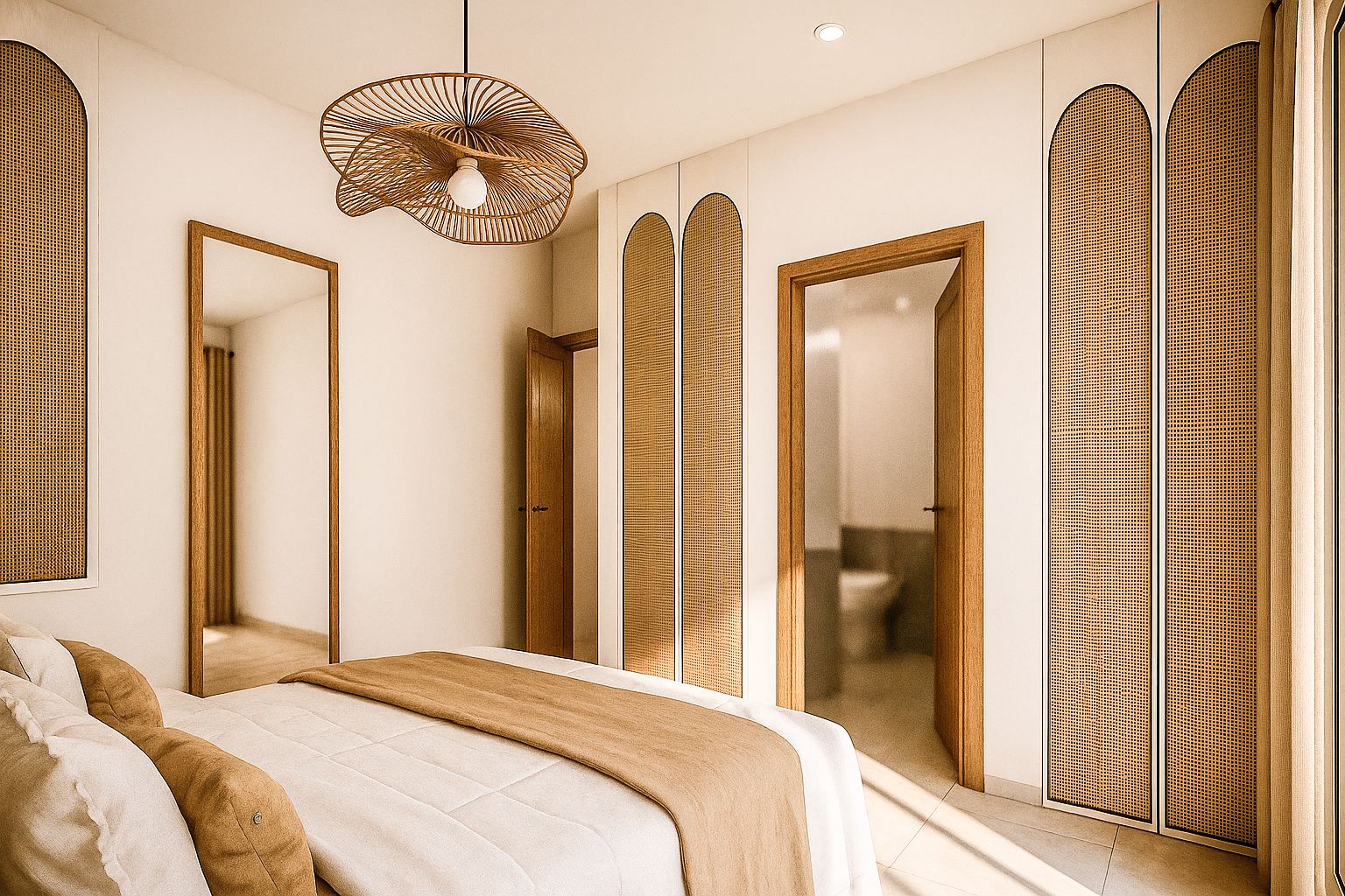 Ce projet off-plan propose des options de 1 ou 2 chambres, chacune avec sa salle de bain attenante. Le séjour fermé est doté de grandes baies vitrées et de plafonds hauts laissant entrer une belle lumière naturelle. La villa est livrée entièrement meublée, avec une cuisine moderne entièrement équipée.