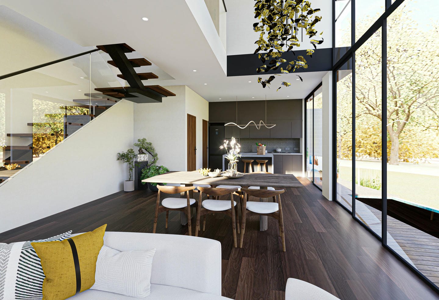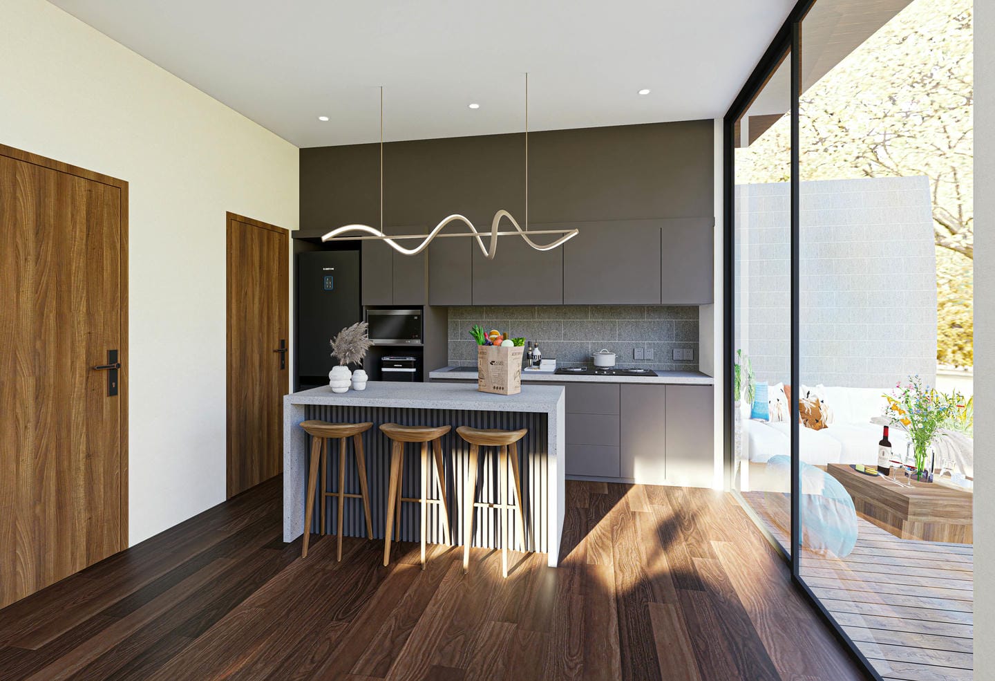Conçue semi-meublée, la villa s’étend sur deux étages et comprend deux chambres spacieuses avec salles de bain attenantes, ainsi qu’une salle d’eau supplémentaire pour les invités. Son agencement ouvert comprend de grandes baies vitrées qui inondent l’espace de lumière naturelle et créent une parfaite harmonie entre les espaces intérieurs et extérieurs. Au cœur de la maison se trouvent un salon confortable, une cuisine moderne entièrement équipée et une agréable salle à manger.