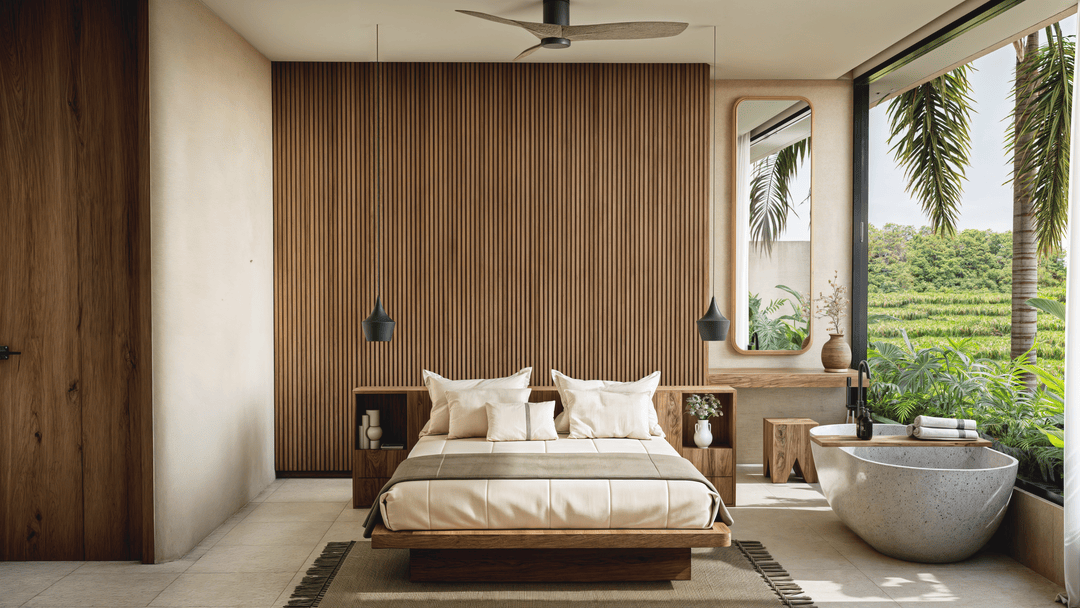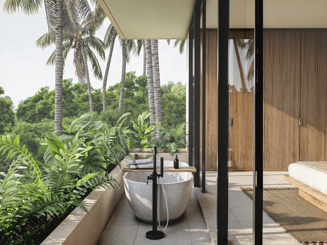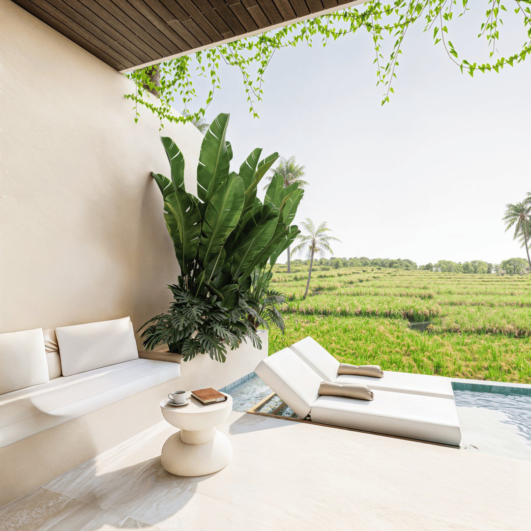 À l’extérieur, une piscine privée avec transats et espace lounge vous invite à vous détendre et à profiter de la douce brise tropicale de Bali.