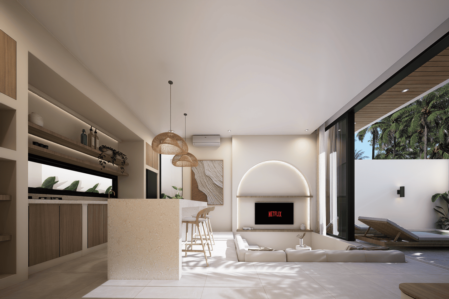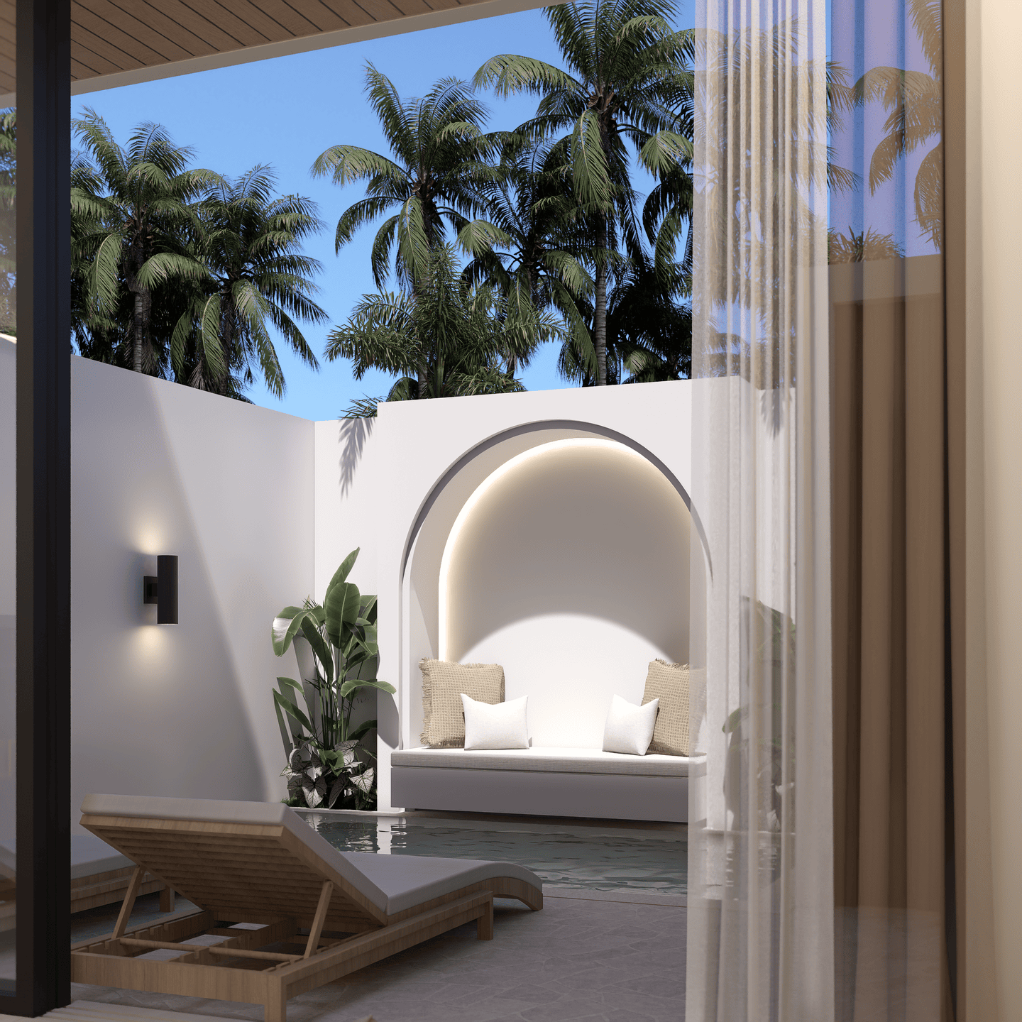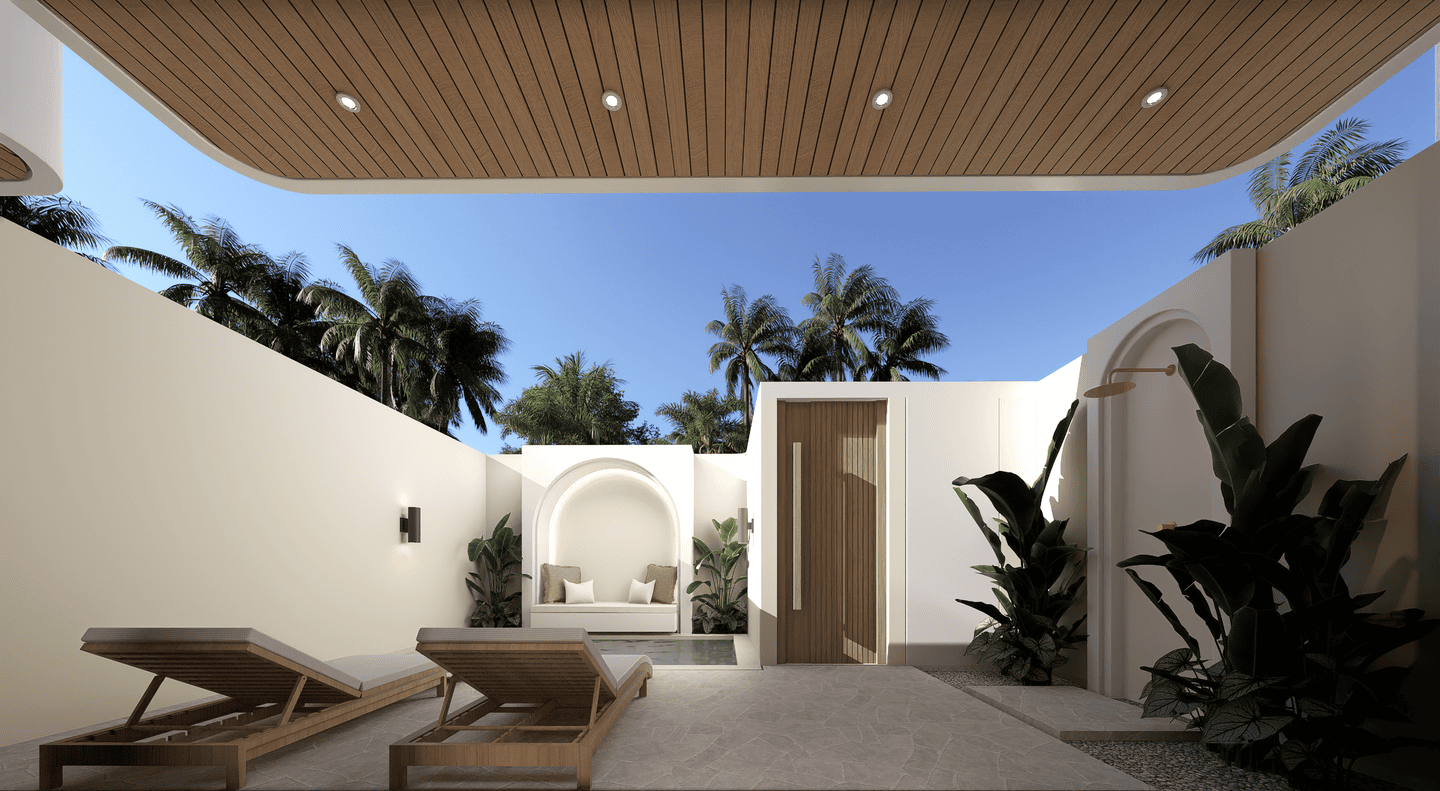 À l’extérieur, profitez d’une piscine privée entourée d’un espace lounge et de transats — un cadre idéal pour se détendre sous le soleil de Bali.