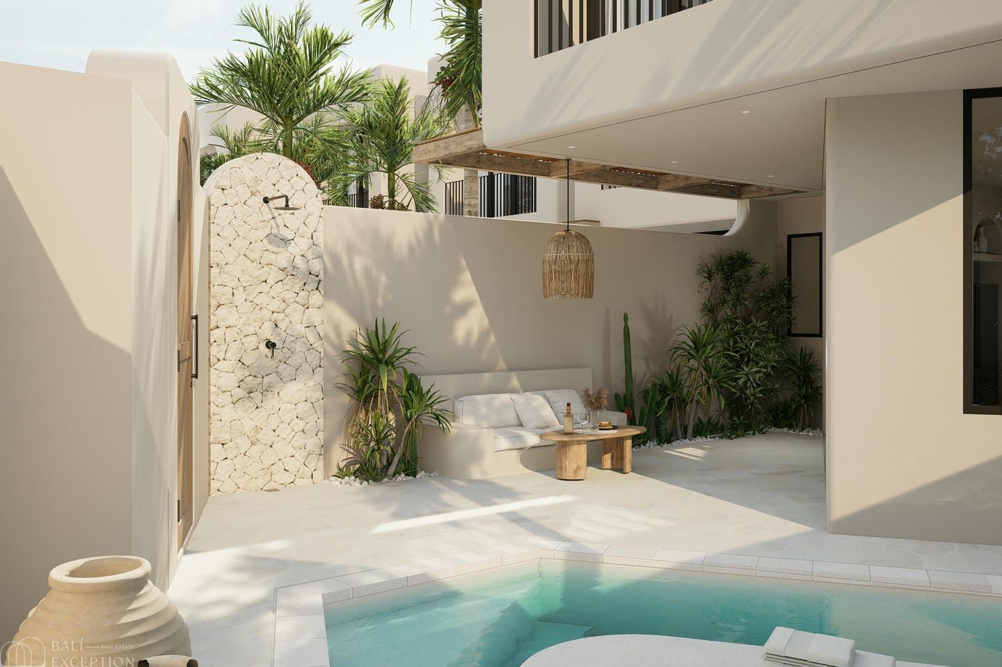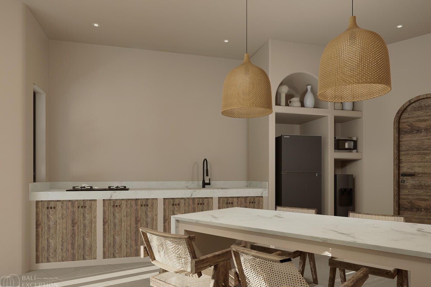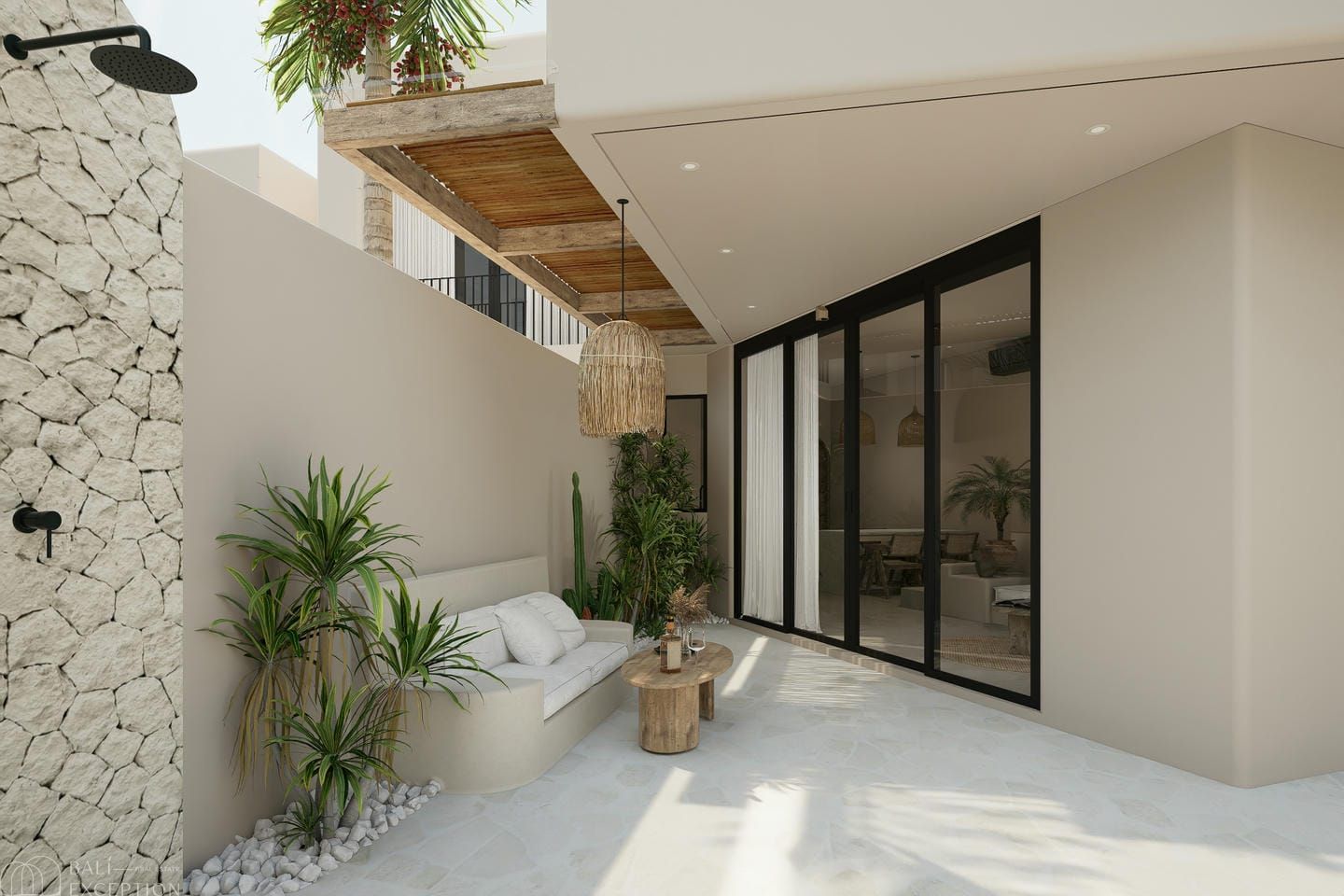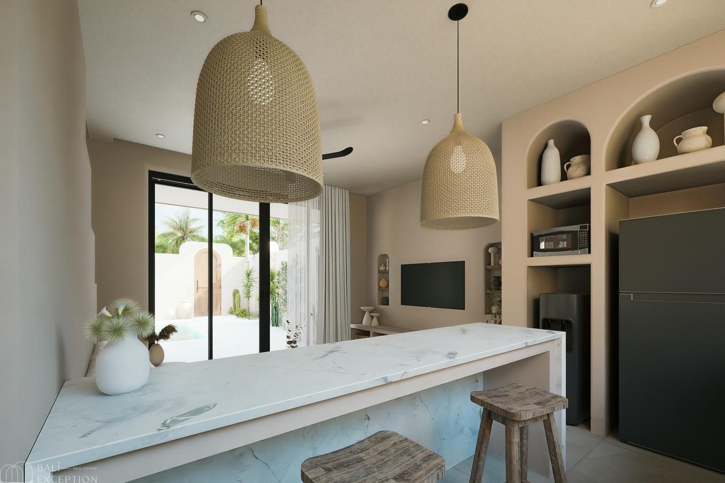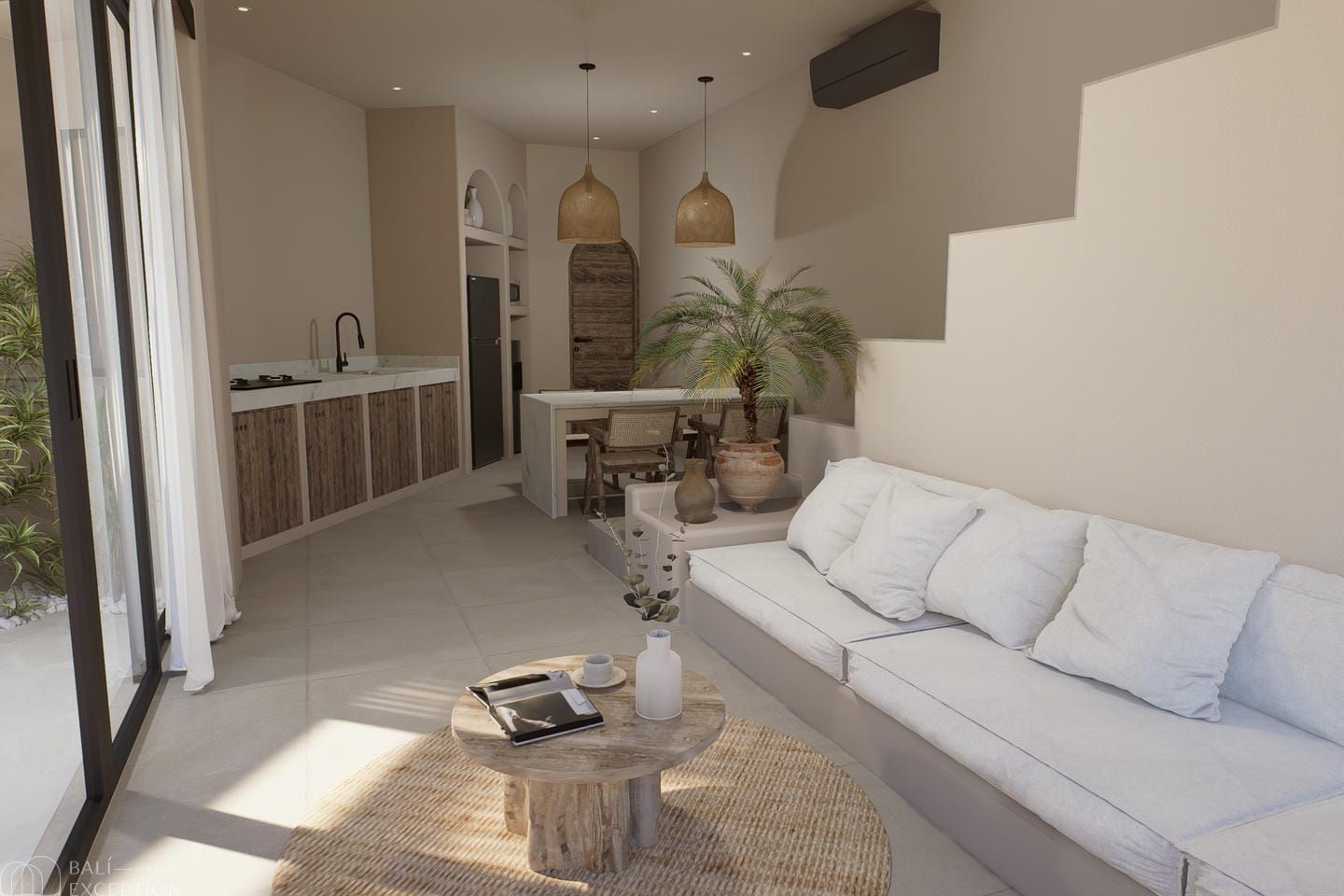 L'intérieur présente un design tropical moderne et chaleureux avec des tons terreux doux et des textures naturelles partout. Cette villa de deux étages est soigneusement conçue avec 1 chambre et 1,5 salle de bain, alliant confort et fonctionnalité. Le salon décloisonné se fond harmonieusement dans une cuisine entièrement équipée, rehaussée par de grandes fenêtres qui apportent beaucoup de lumière naturelle.