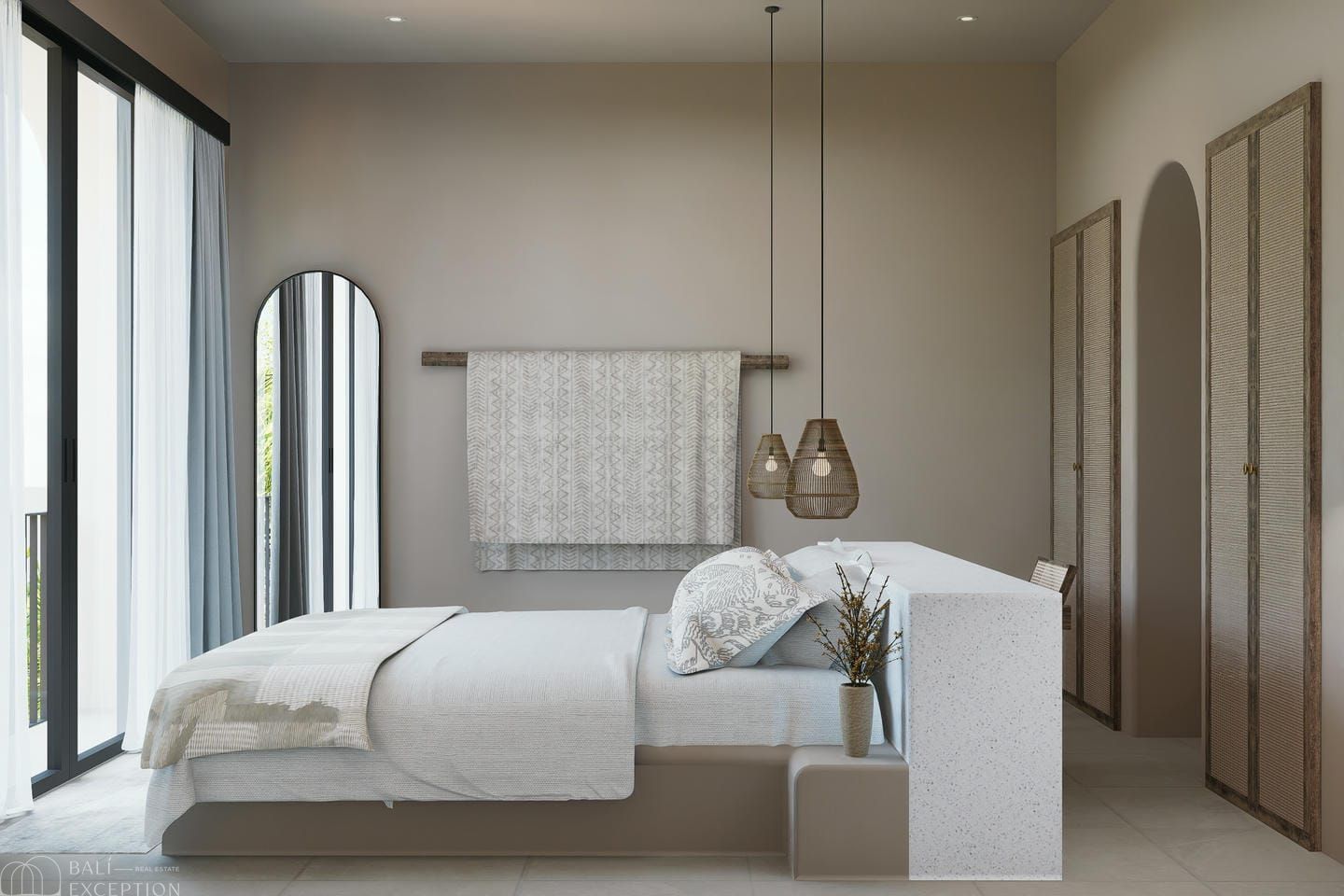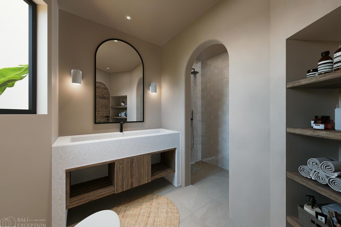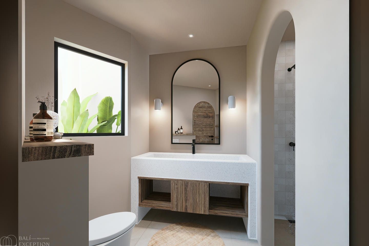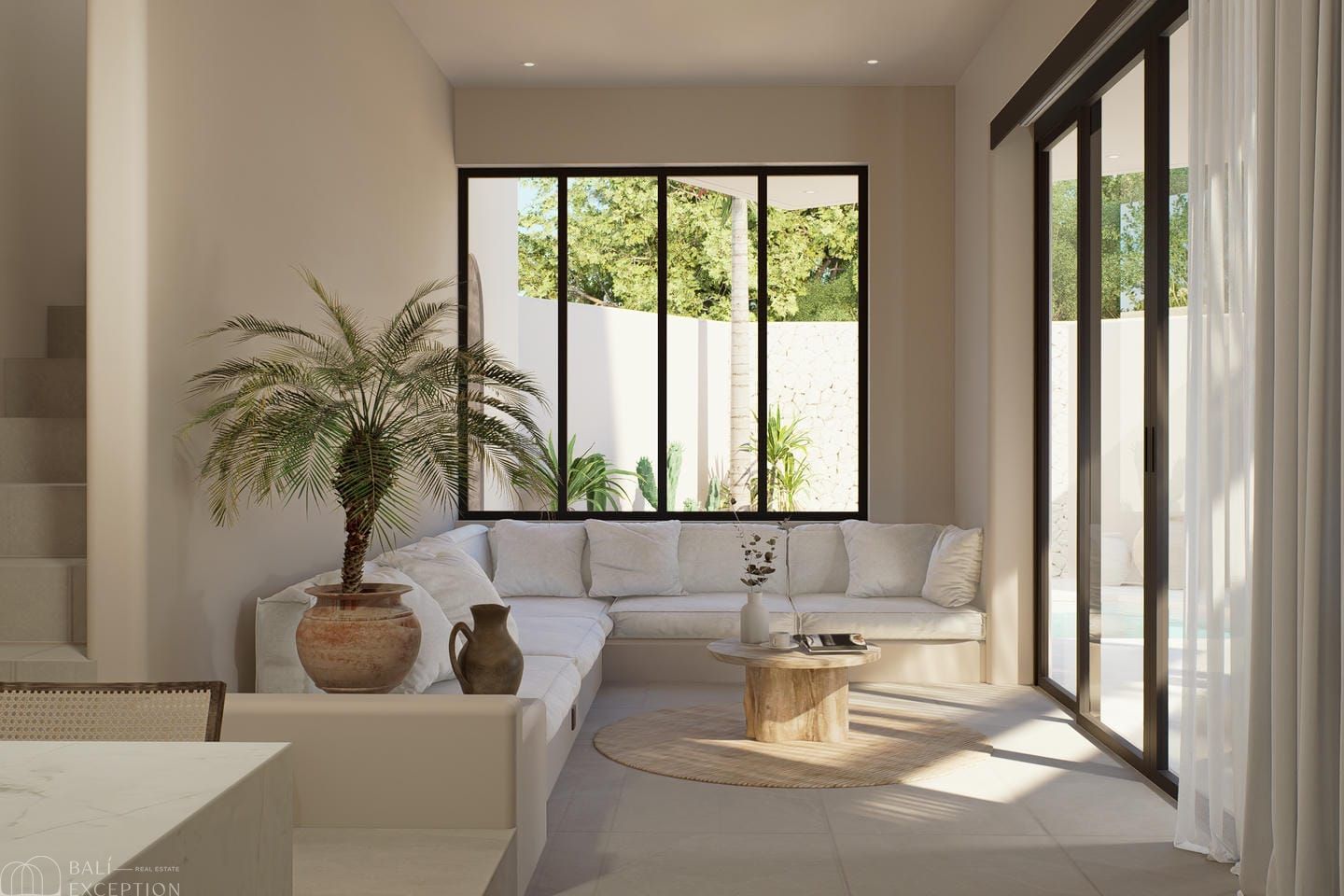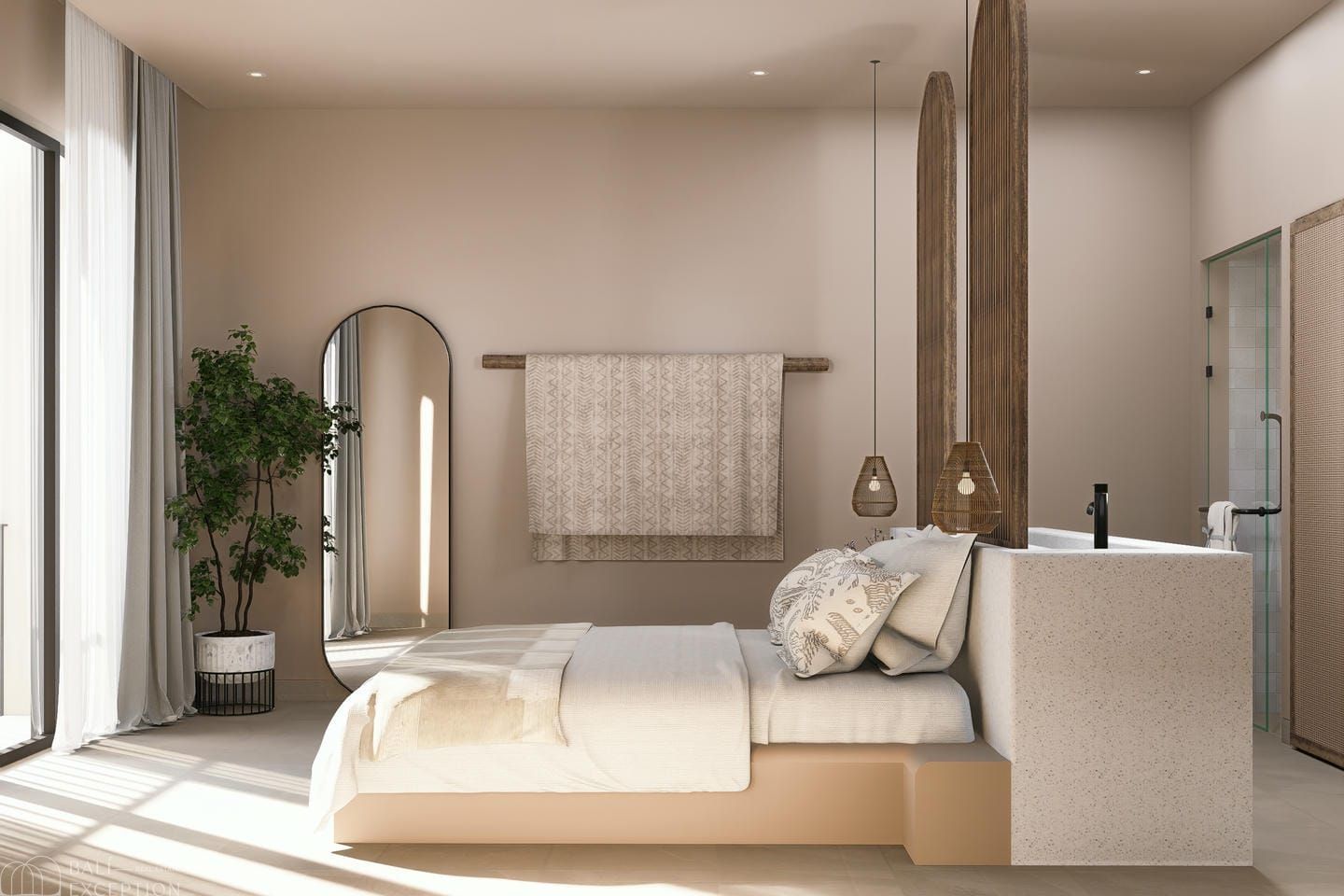 L'intérieur présente un design tropical moderne et chaleureux avec des tons terreux doux et des textures naturelles partout. Cette villa de deux étages est soigneusement conçue avec 1 chambre et 1,5 salle de bain, alliant confort et fonctionnalité. Le salon décloisonné se fond harmonieusement dans une cuisine entièrement équipée, rehaussée par de grandes fenêtres qui apportent beaucoup de lumière naturelle.