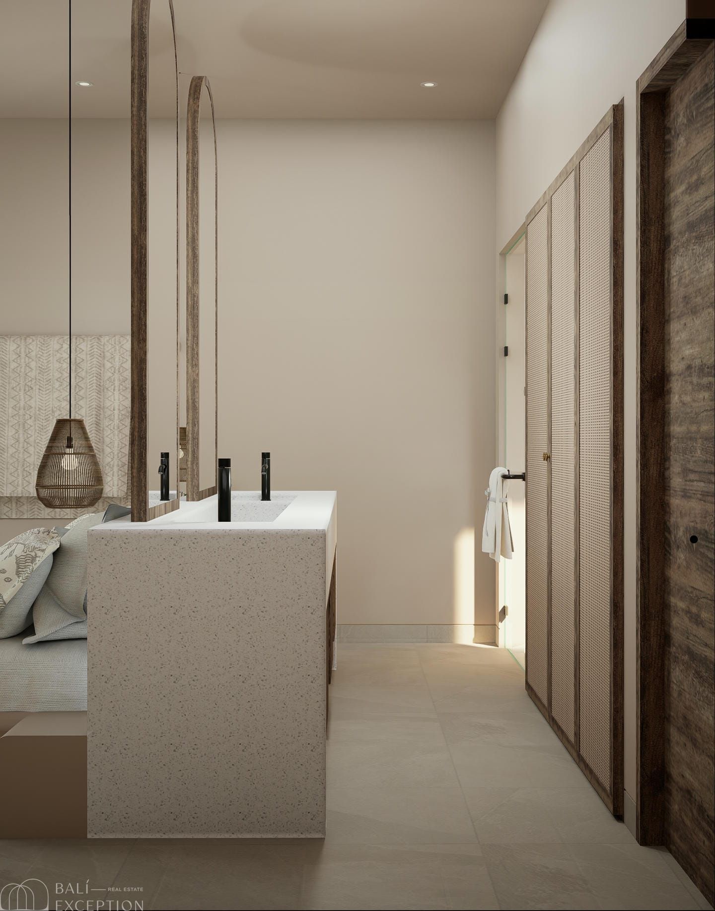 À l'extérieur, la villa présente une piscine privée entourée d'une verdure tropicale luxuriante, créant une atmosphère sereine et intime. Les lignes architecturales épurées, combinées aux accents de pierre naturelle et de bois, confèrent à l'espace une esthétique à la fois élégante et apaisante.