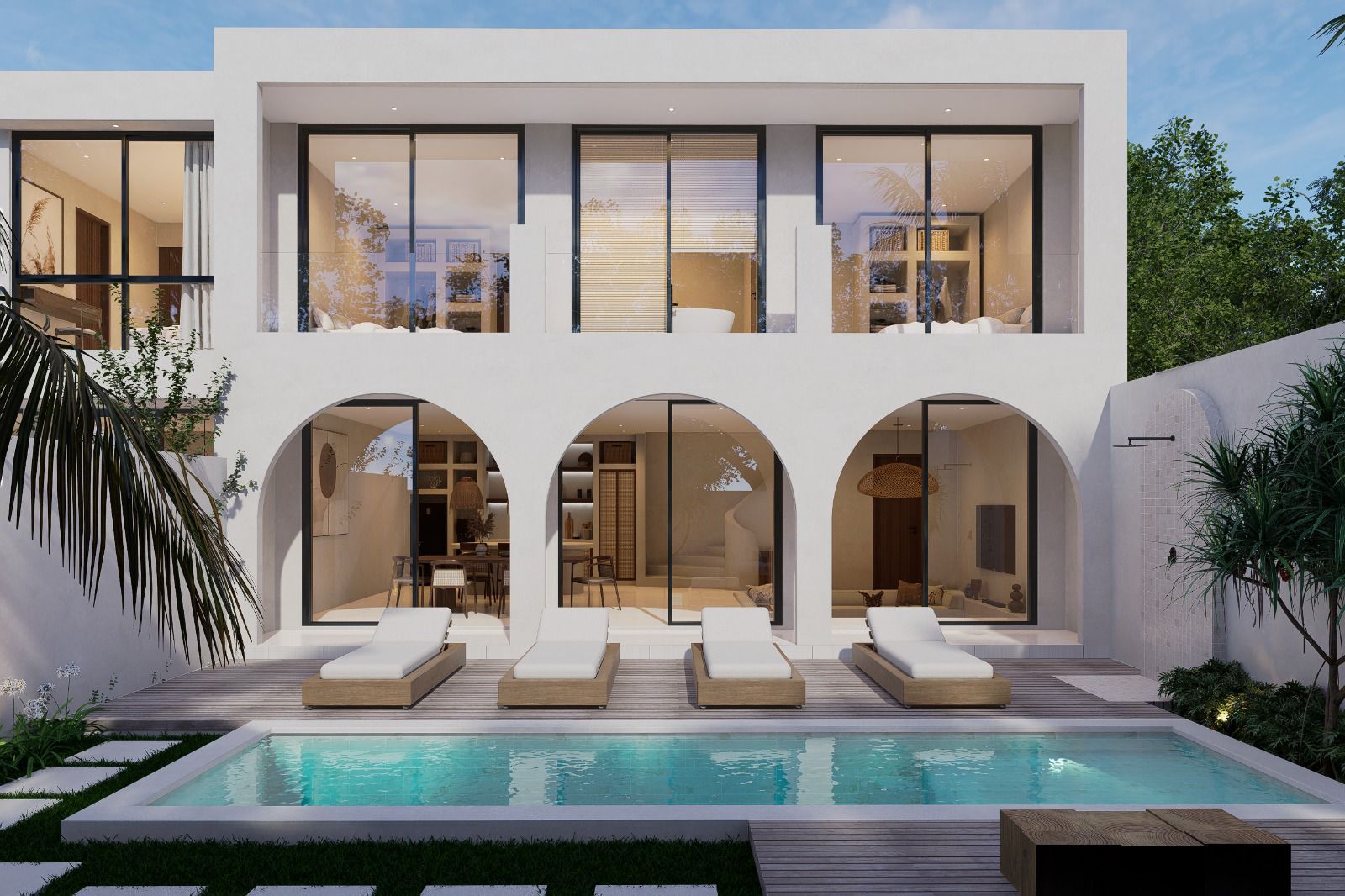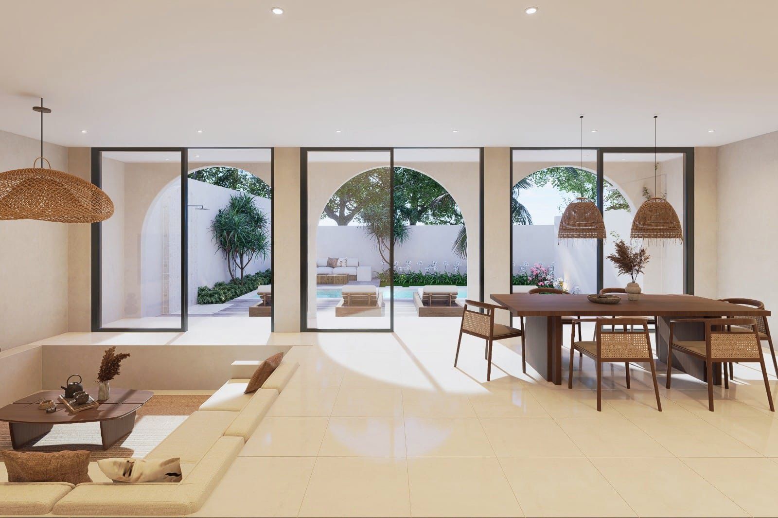 L'intérieur présente un design tropical moderne et chaleureux avec des lignes épurées et des tons naturels. Cette villa sur deux étages comprend 2 chambres et 2 salles de bains, conçues selon une approche minimaliste mais confortable. Les grandes fenêtres en verre apportent une lumière naturelle abondante, tandis que le salon, la salle à manger et la cuisine décloisonnés créent une atmosphère homogène et aérée.