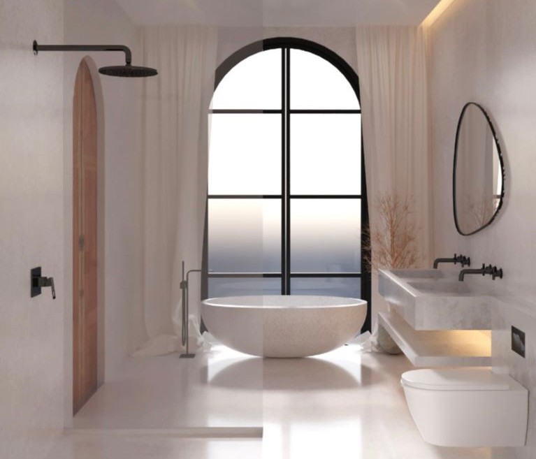 L'espace extérieur est magnifiquement conçu avec une piscine privée entourée d'une terrasse en bois et de chaises longues. Les détails architecturaux voûtés ajoutent un caractère unique, tandis que l'espace jardin offre une ambiance tropicale sereine et privée, parfaite pour se détendre ou se divertir.