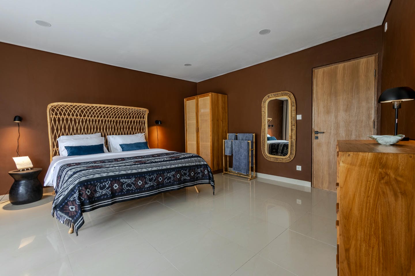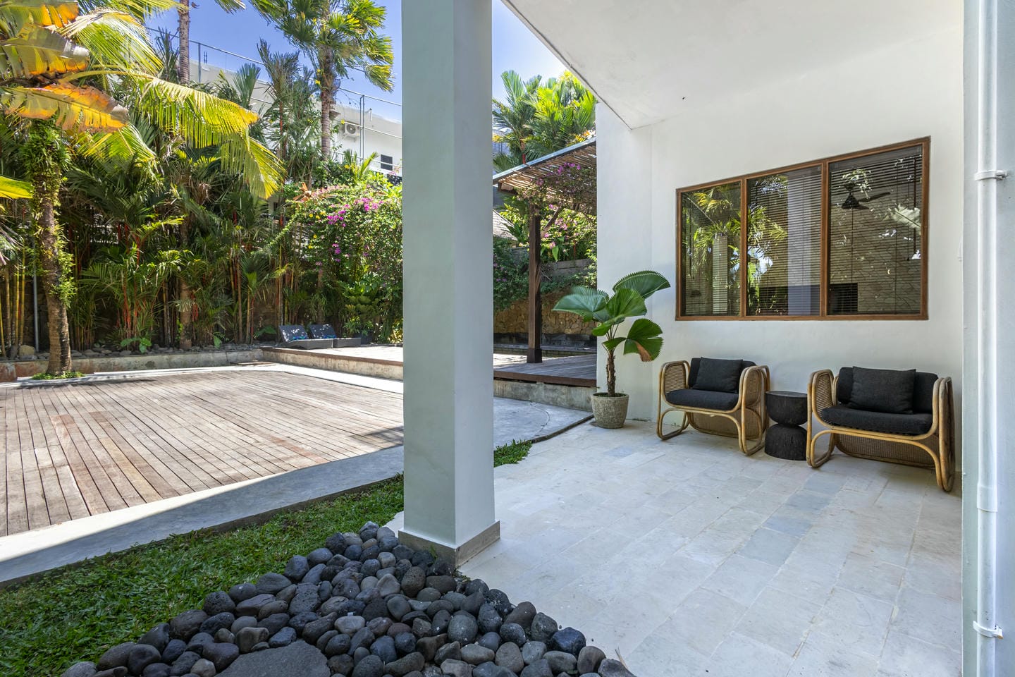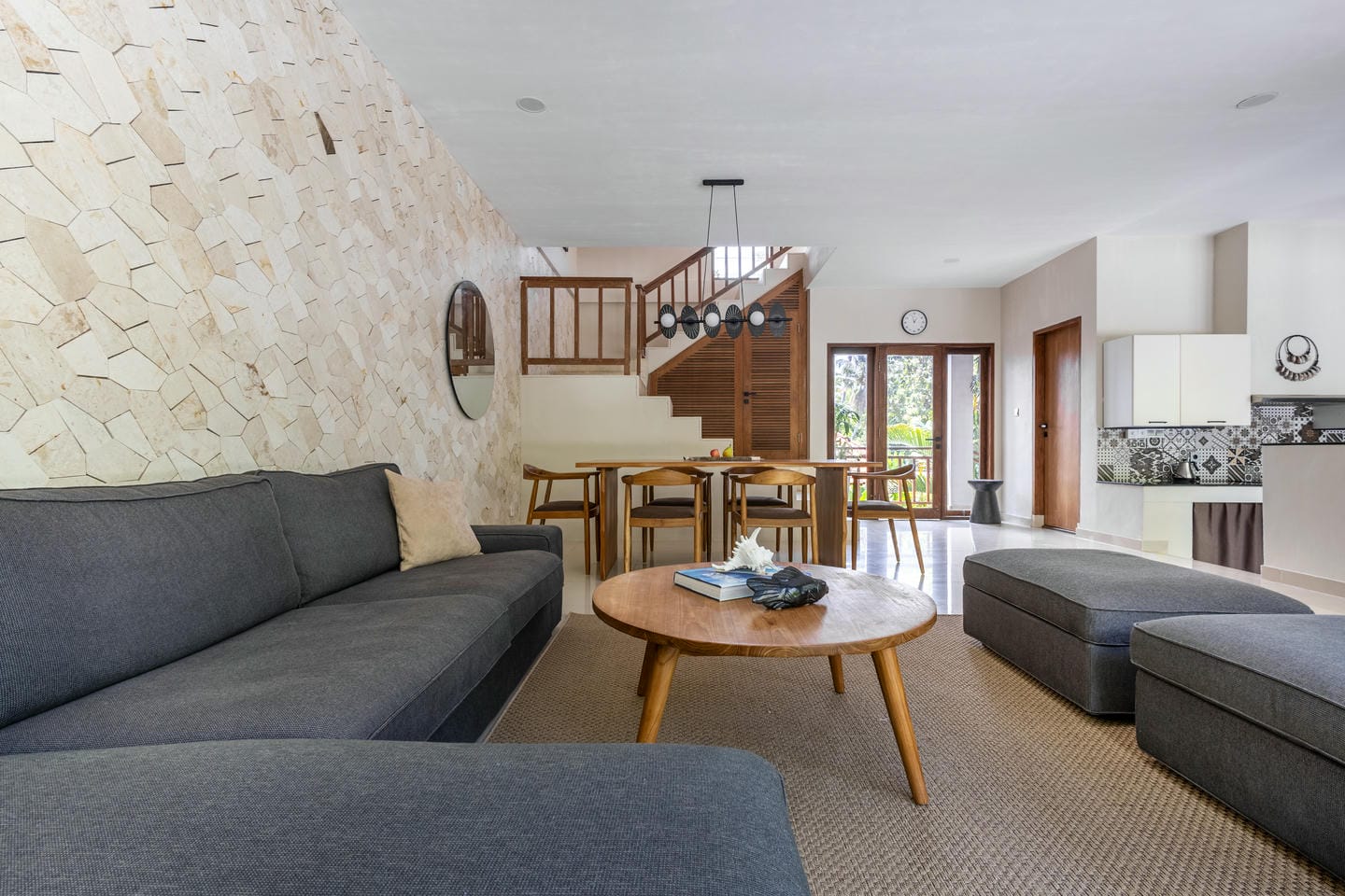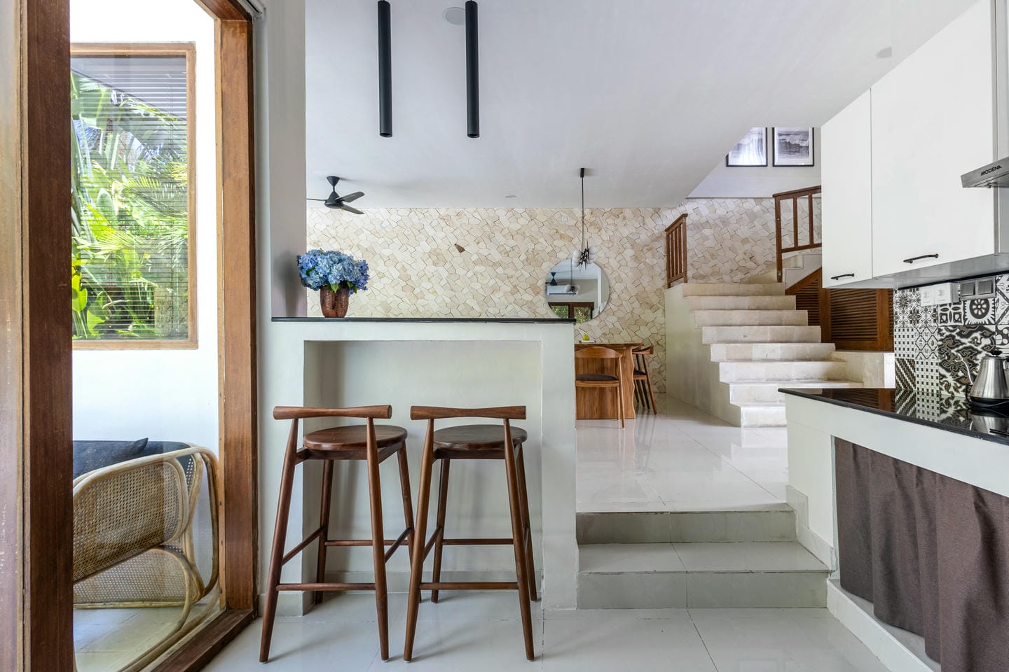 L'intérieur de la villa allie esthétique tropicale et confort moderne. Tons chauds, détails en rotin et éléments en bois naturel créent une atmosphère chaleureuse et élégante. De grandes baies vitrées coulissantes laissent entrer la lumière du soleil et connectent chaque pièce avec la nature environnante.