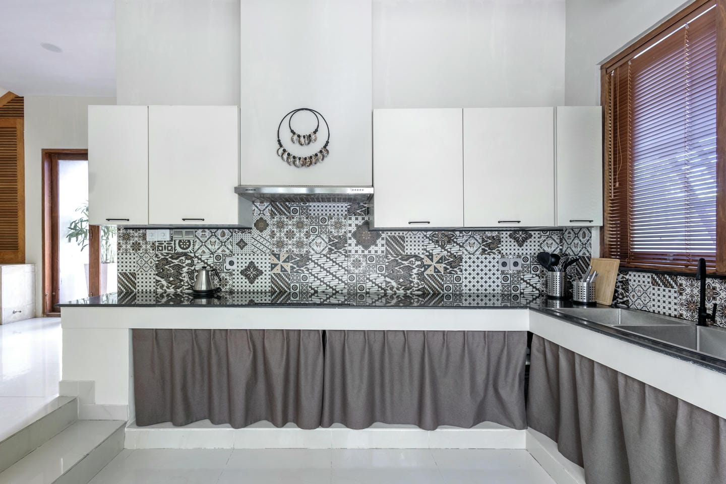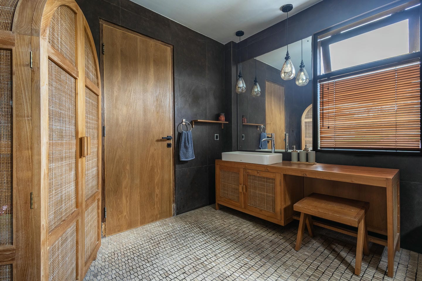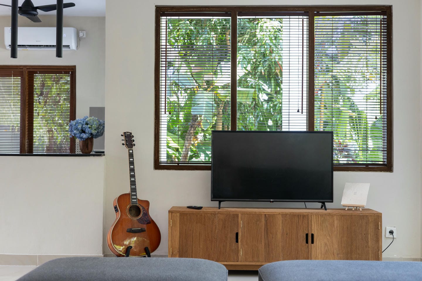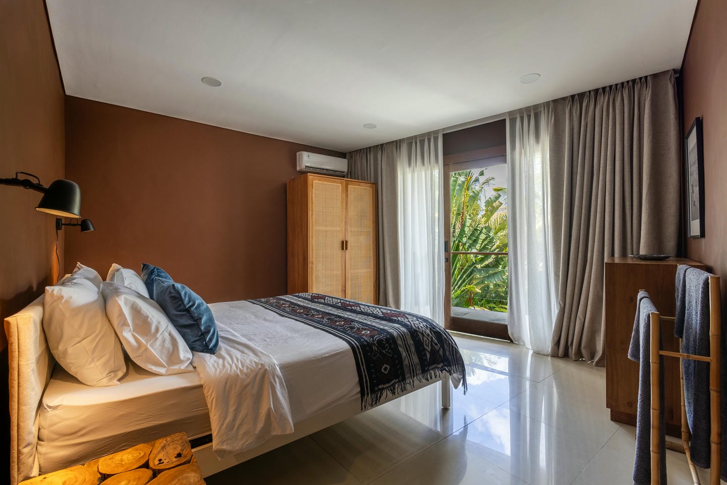 L'intérieur de la villa allie esthétique tropicale et confort moderne. Tons chauds, détails en rotin et éléments en bois naturel créent une atmosphère chaleureuse et élégante. De grandes baies vitrées coulissantes laissent entrer la lumière du soleil et connectent chaque pièce avec la nature environnante.