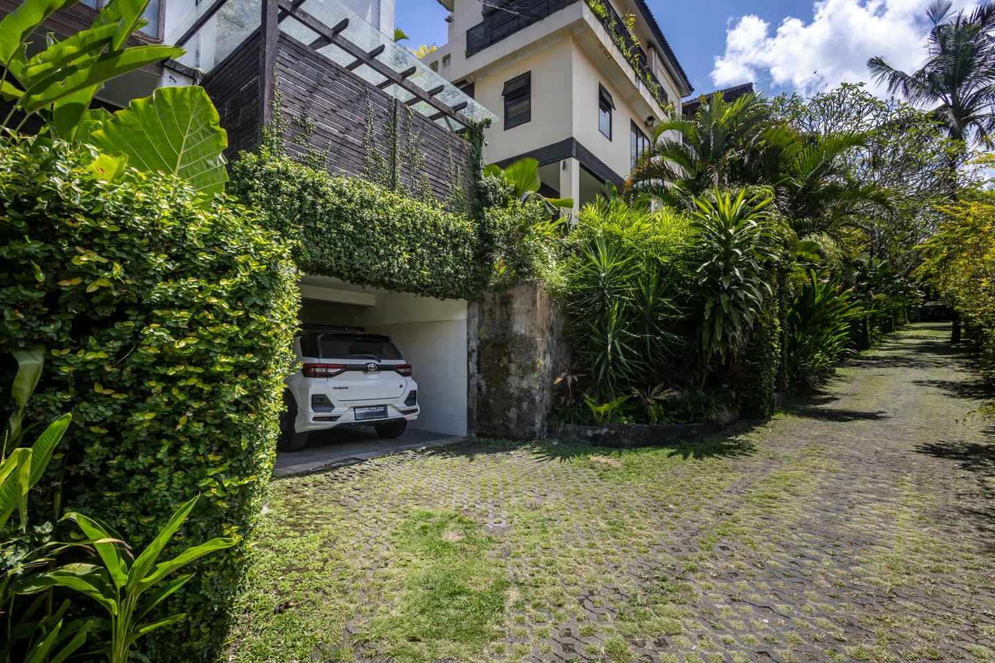 Découvrez votre paradis tropical privé. Le jardin, agrémenté de palmiers et de vignes fleuries, comprend une piscine paisible et même un mini skate bowl, offrant une touche ludique et originale à votre quotidien en plein air. La terrasse à l'étage offre un espace de détente aéré avec vue panoramique sur la végétation luxuriante.
