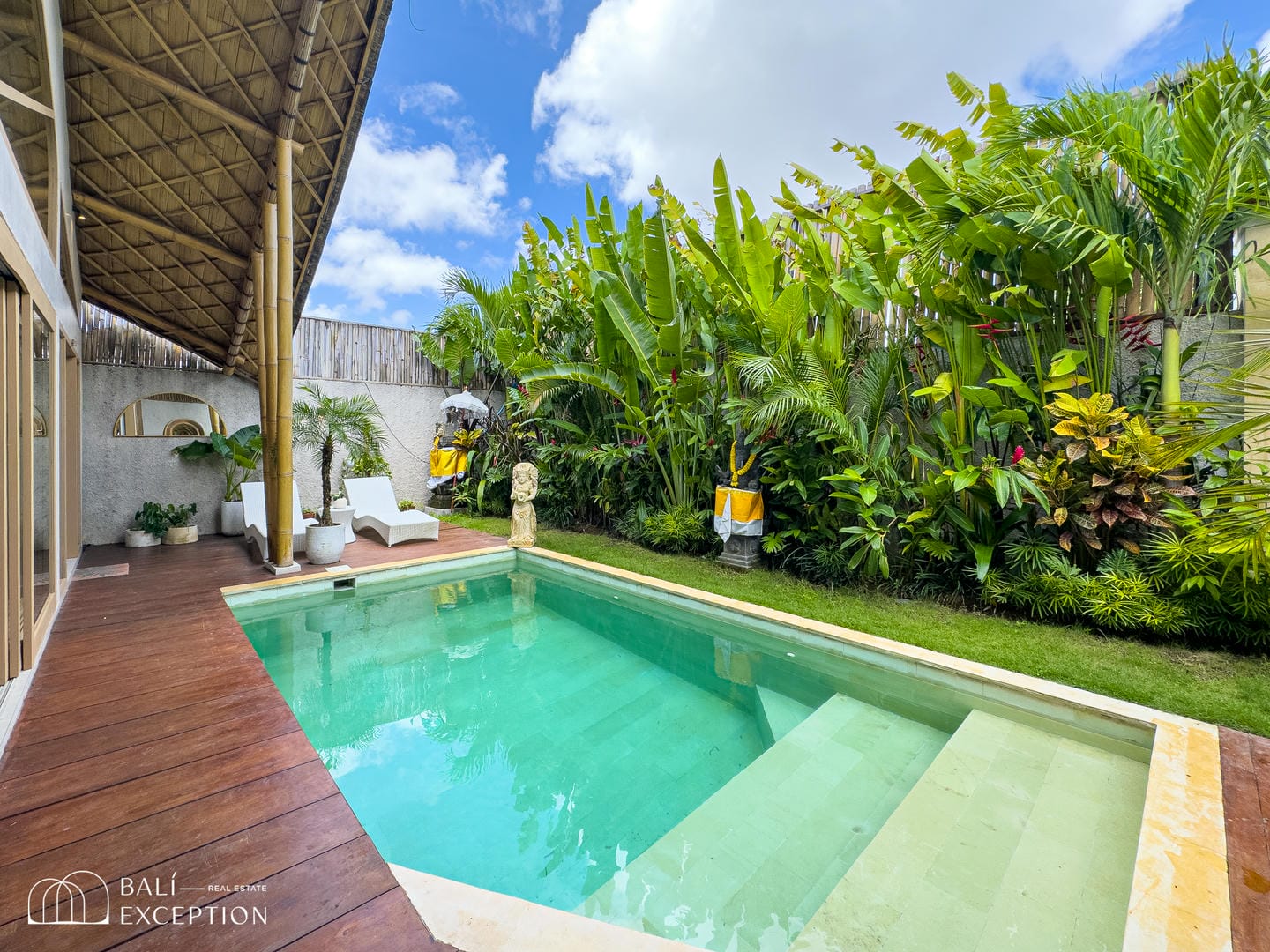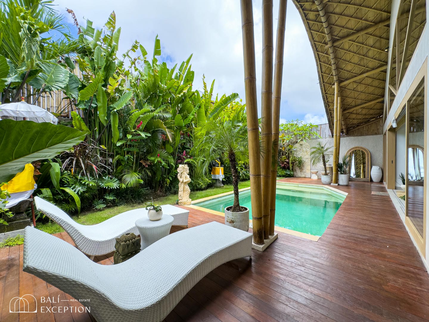 L’espace extérieur est conçu pour la détente, avec une piscine privée entourée de plantes tropicales luxuriantes et une terrasse en bois qui apporte chaleur et charme à l’ensemble.