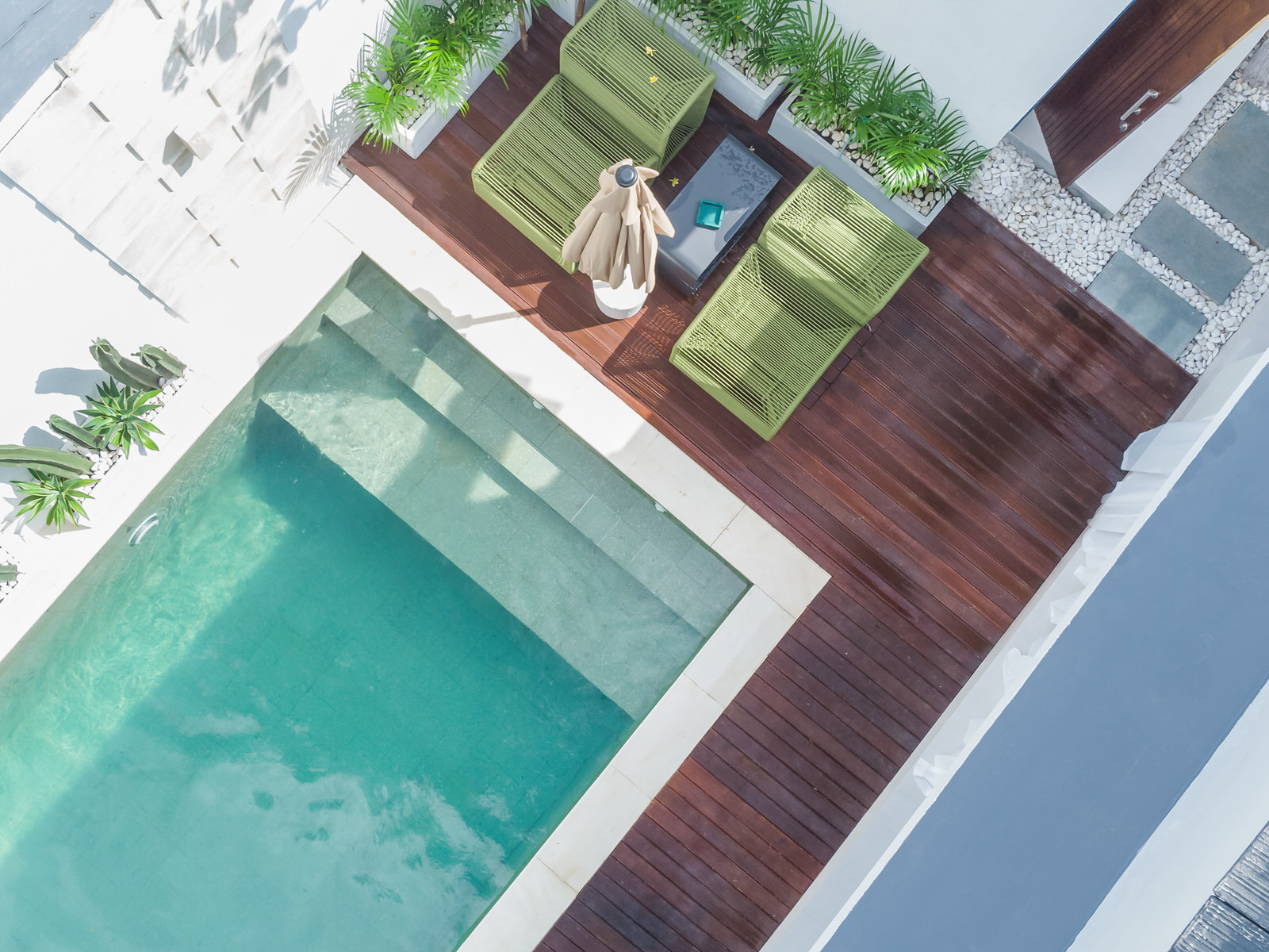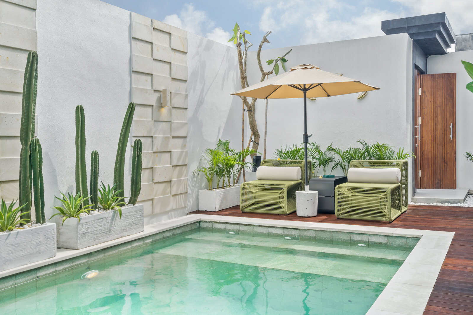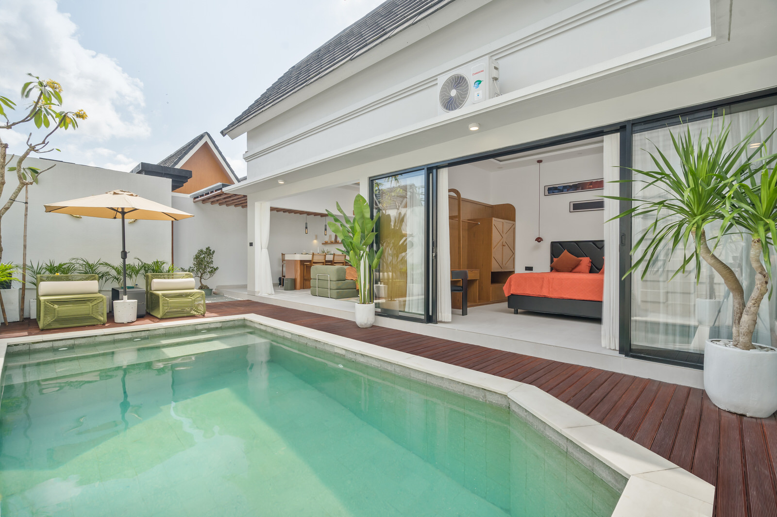 À l’extérieur, la piscine privée est entourée d’une terrasse en bois, d’une végétation tropicale et d’un accès direct aux chambres, créant une oasis de tranquillité idéale pour les baignades matinales ou la détente au coucher du soleil. Sa conception favorise une alternance harmonieuse entre confort intérieur et loisirs extérieurs.