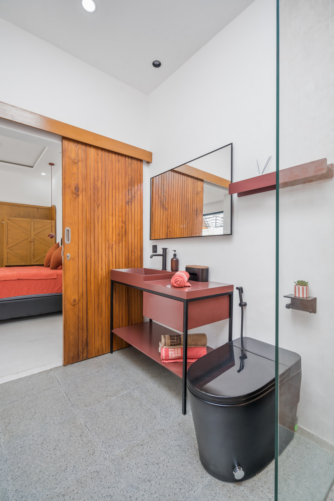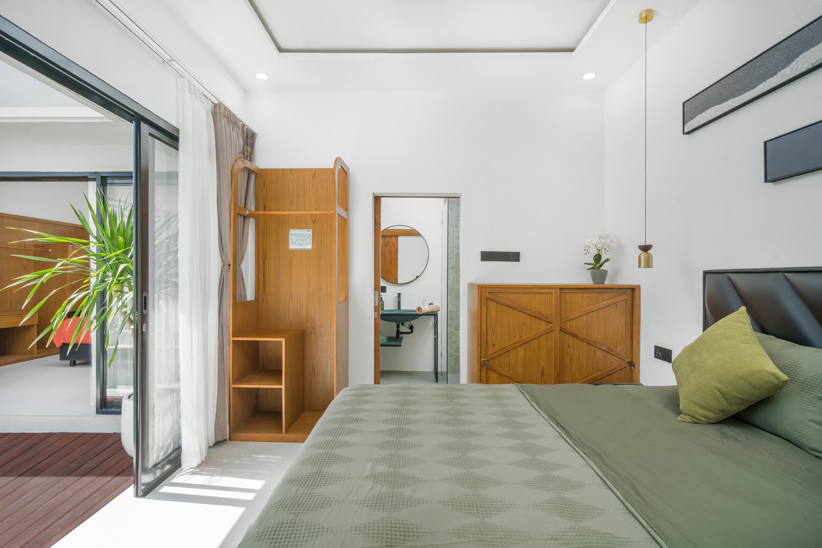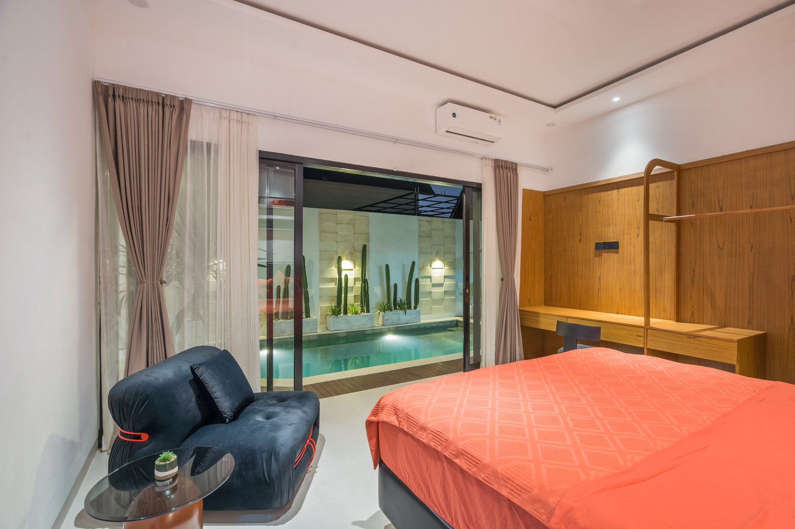 À l’extérieur, la piscine privée est entourée d’une terrasse en bois, d’une végétation tropicale et d’un accès direct aux chambres, créant une oasis de tranquillité idéale pour les baignades matinales ou la détente au coucher du soleil. Sa conception favorise une alternance harmonieuse entre confort intérieur et loisirs extérieurs.
