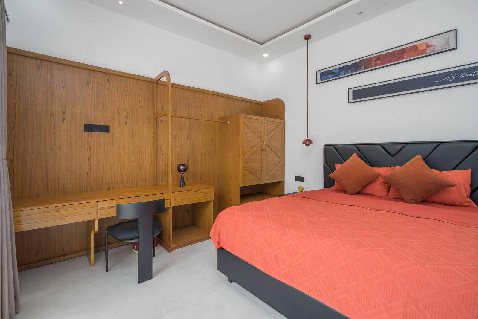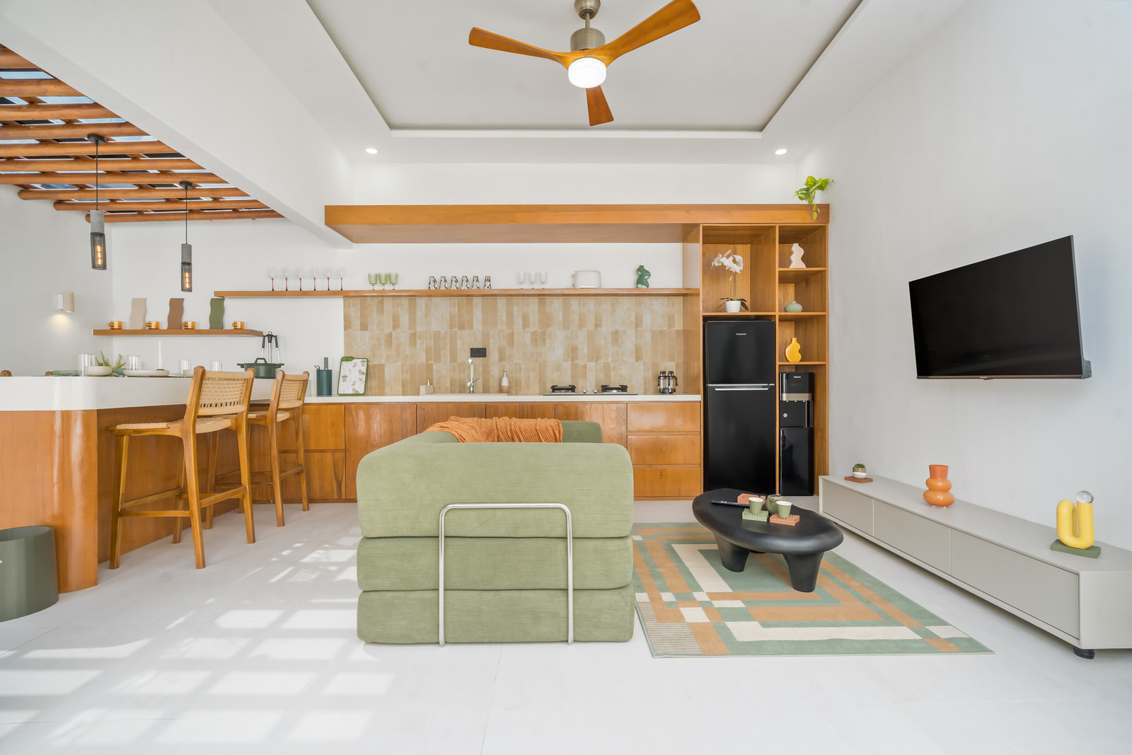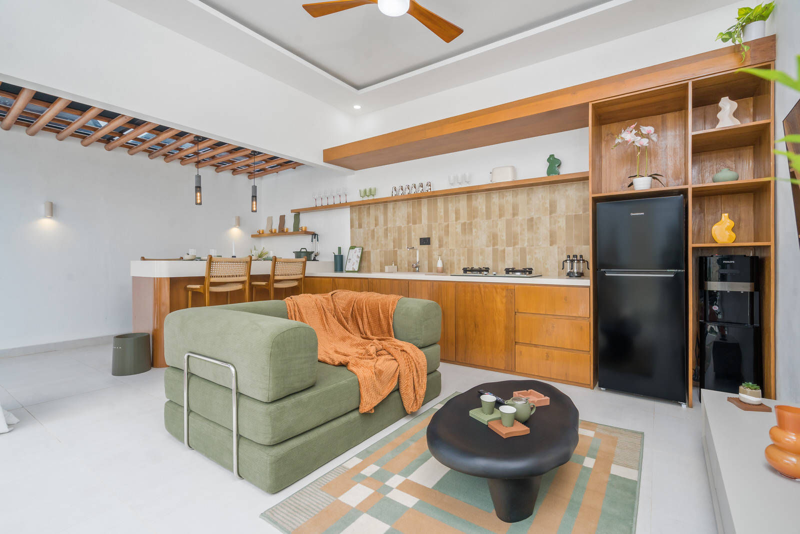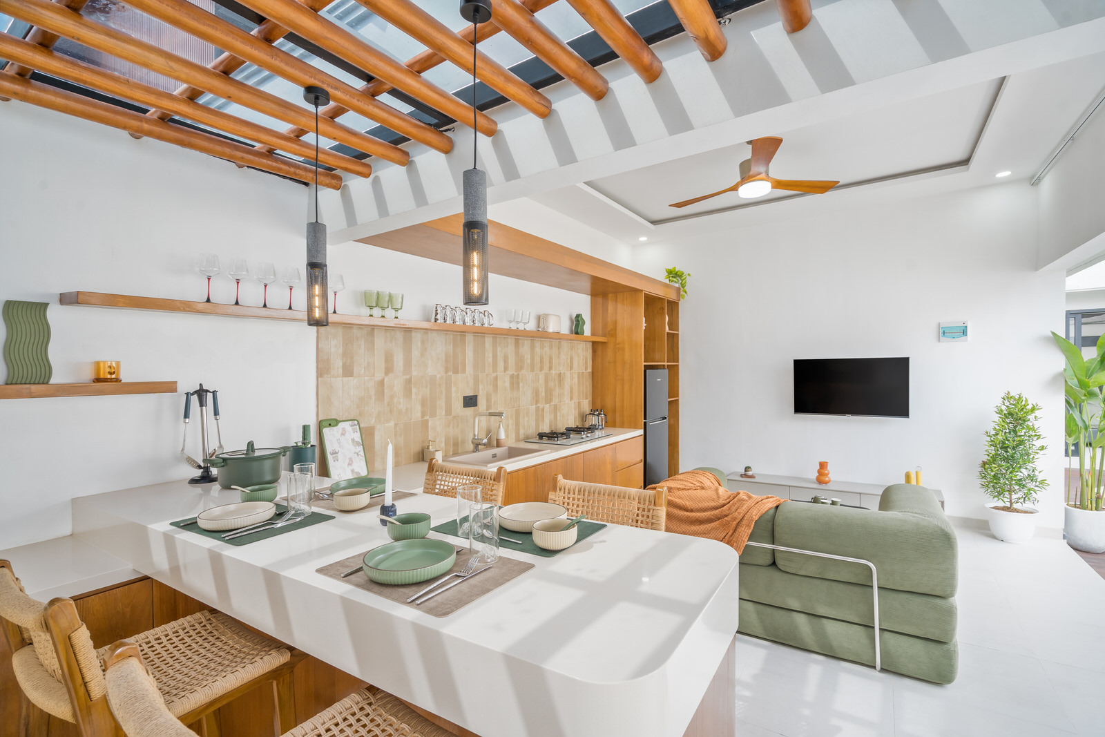 À l’intérieur, la villa arbore un style tropical moderne avec des touches de bois chaleureux, des lignes épurées et une décoration soignée dans des tons naturels. L’espace de vie ouvert relie harmonieusement la cuisine, la salle à manger et le salon, créant une ambiance chaleureuse et aérée.