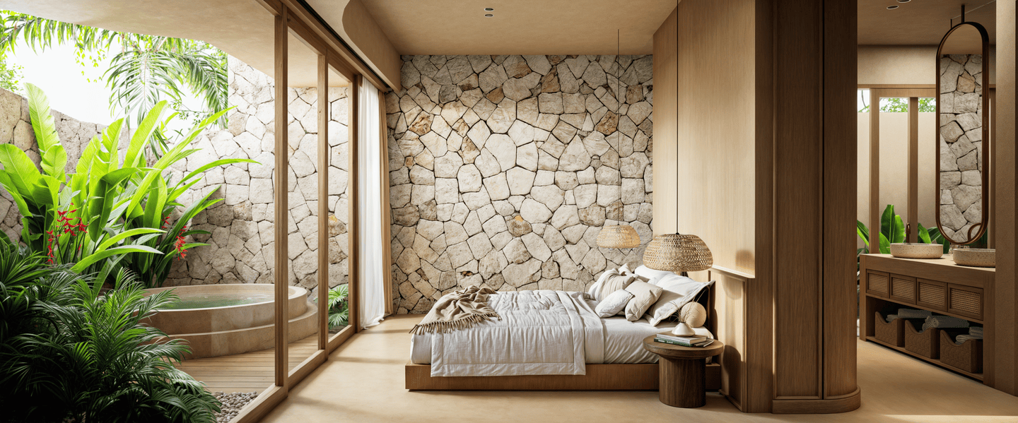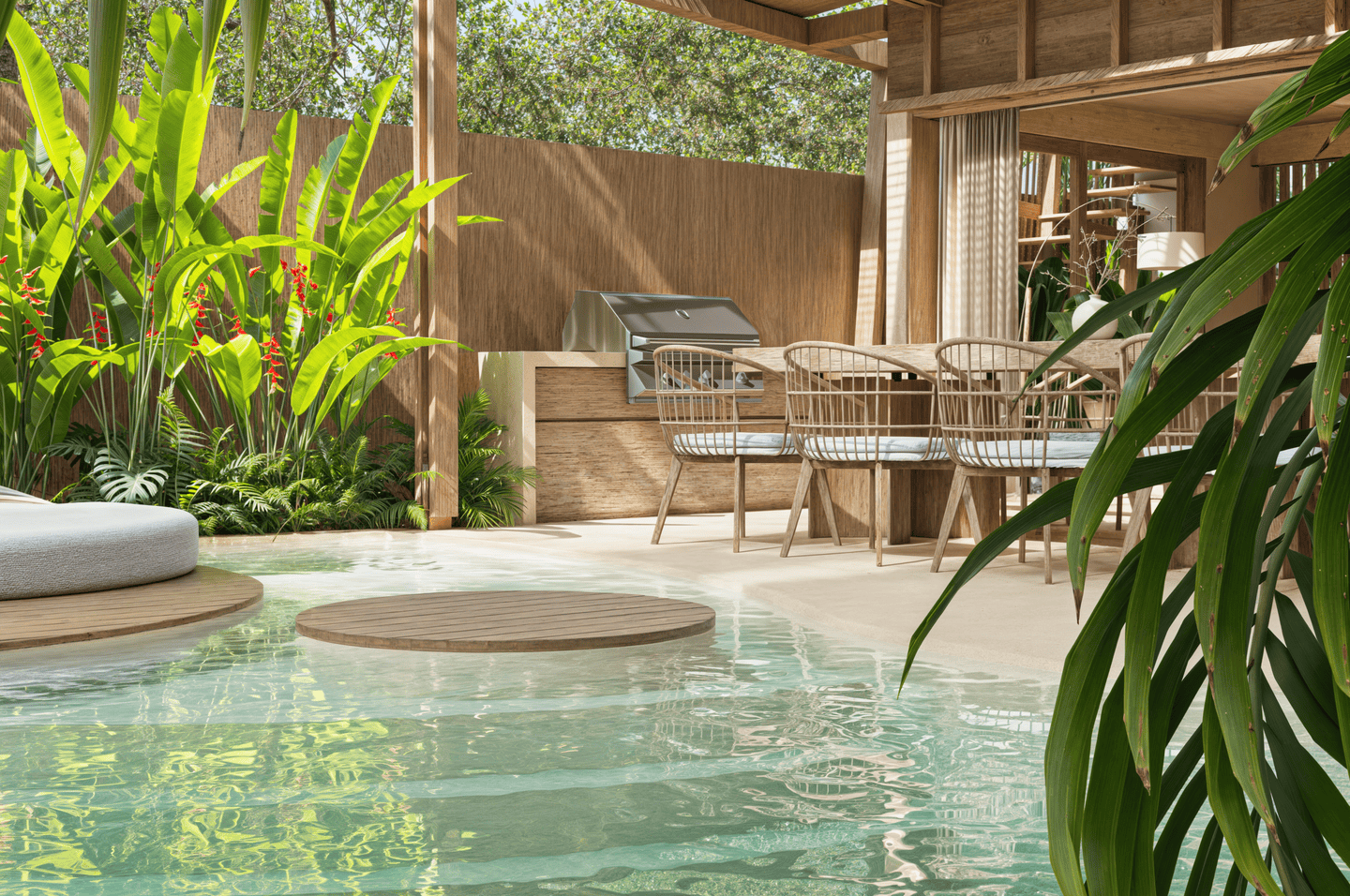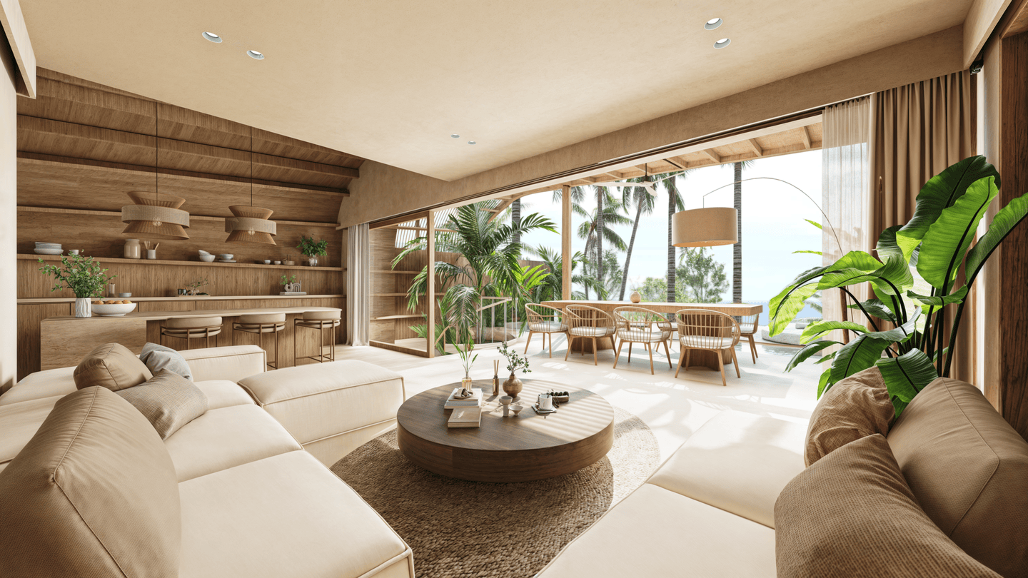 L’espace de vie ouvert est agencé avec soin, une table à manger séparant la cuisine moderne de la zone de détente. L’utilisation de matériaux naturels et de finitions texturées confère à l’ensemble une atmosphère chaleureuse, sophistiquée et résolument tropicale.