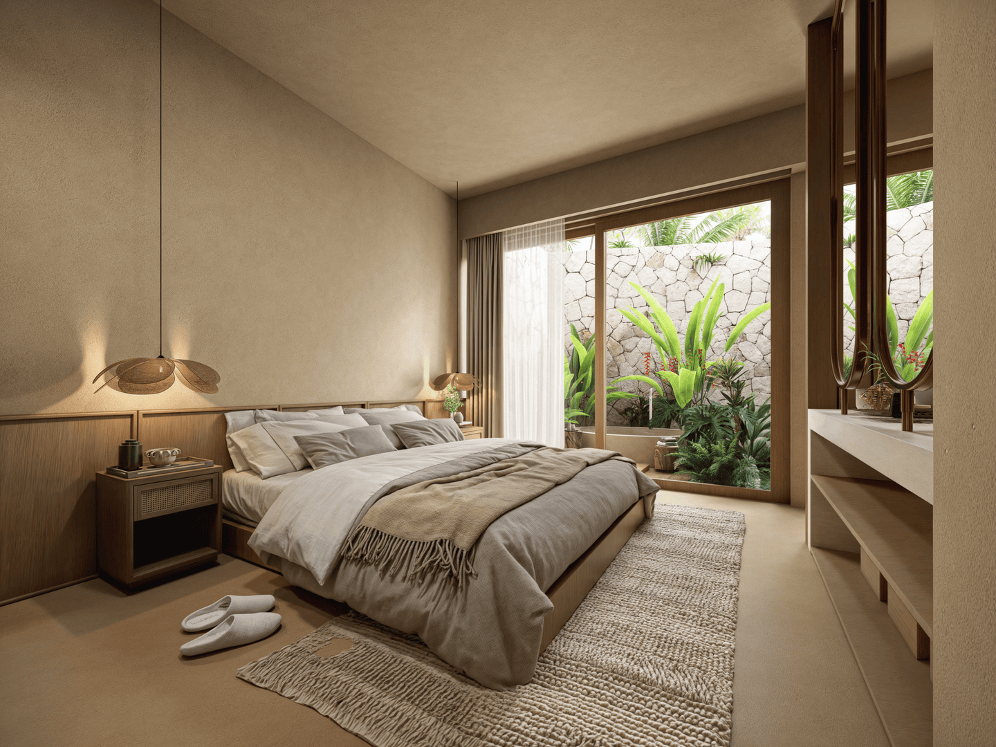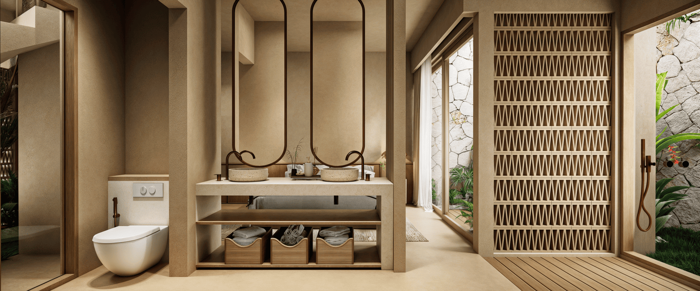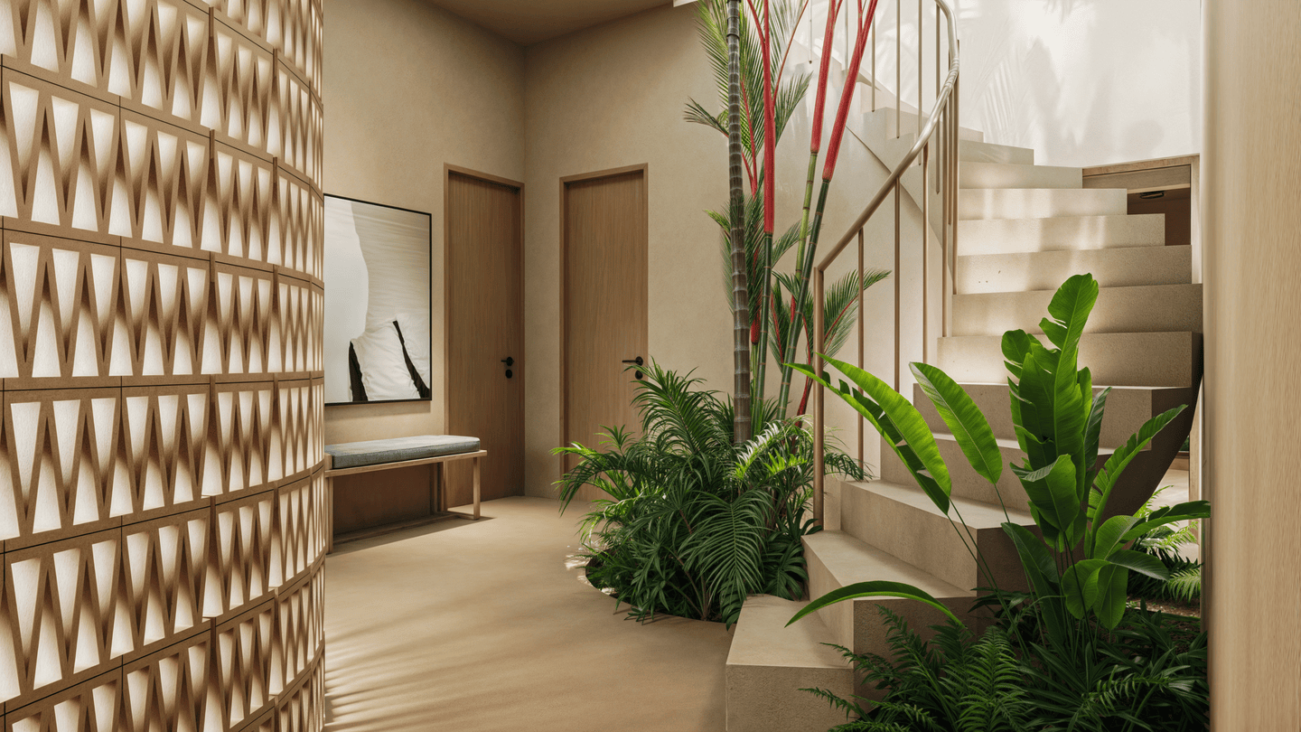 L’espace de vie ouvert est agencé avec soin, une table à manger séparant la cuisine moderne de la zone de détente. L’utilisation de matériaux naturels et de finitions texturées confère à l’ensemble une atmosphère chaleureuse, sophistiquée et résolument tropicale.
