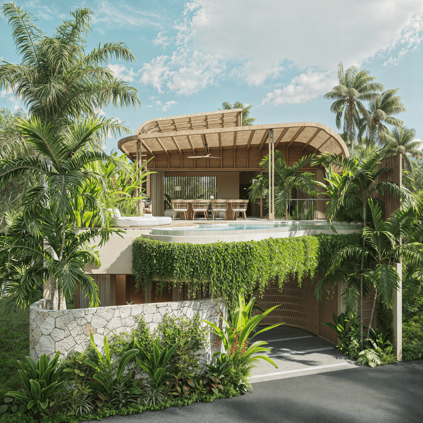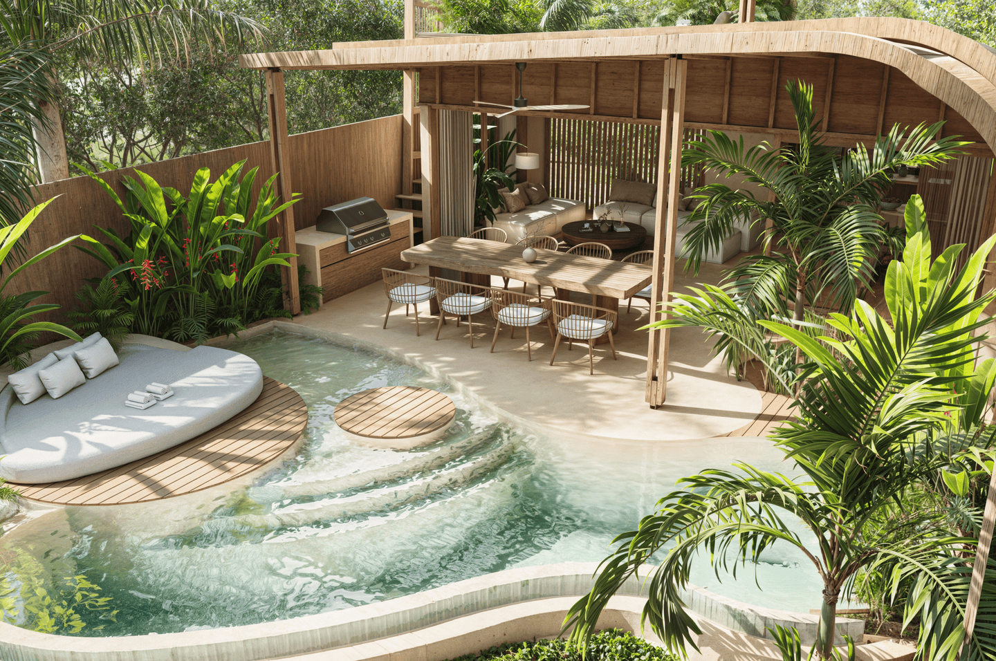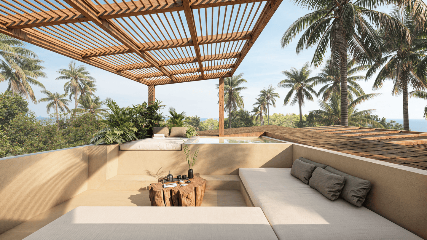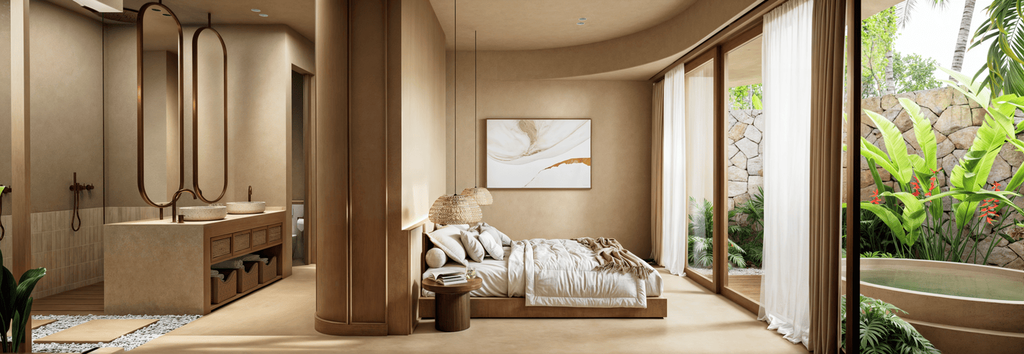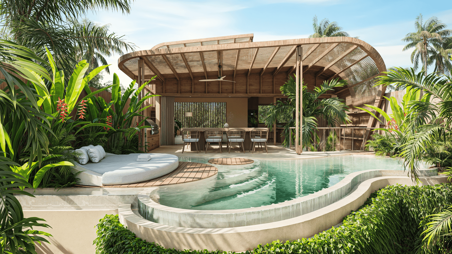 Cette villa de trois chambres présente un havre tropical serein avec un design unique qui allie harmonieusement confort intérieur et vie en plein air. L’architecture adopte des formes douces et arrondies, évoquant la sensation d’une oasis tropicale. En son centre se trouve un magnifique salon en contrebas entouré de la piscine et d’une pergola ombragée — l’endroit idéal pour se détendre ou partager des moments conviviaux entre amis et en famille.