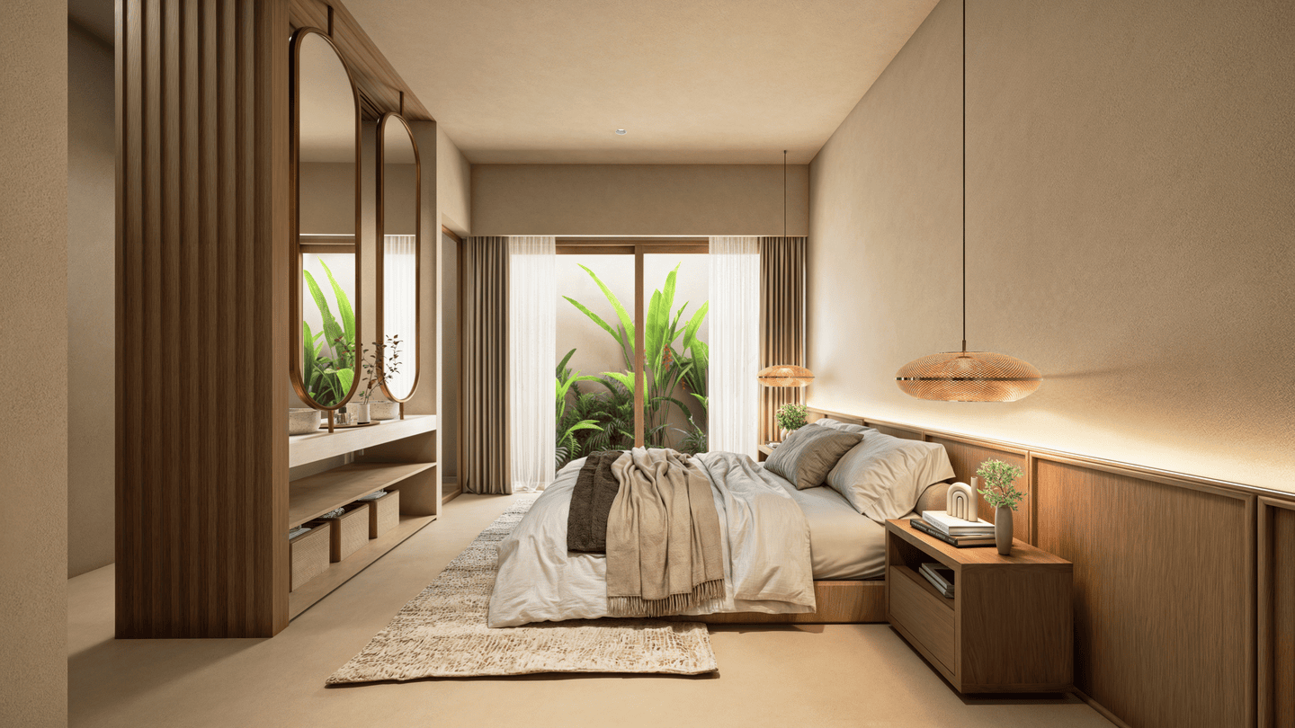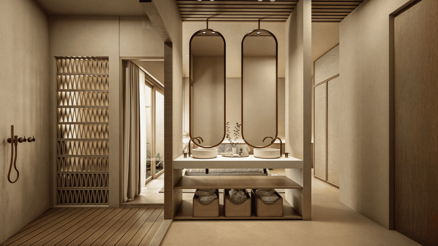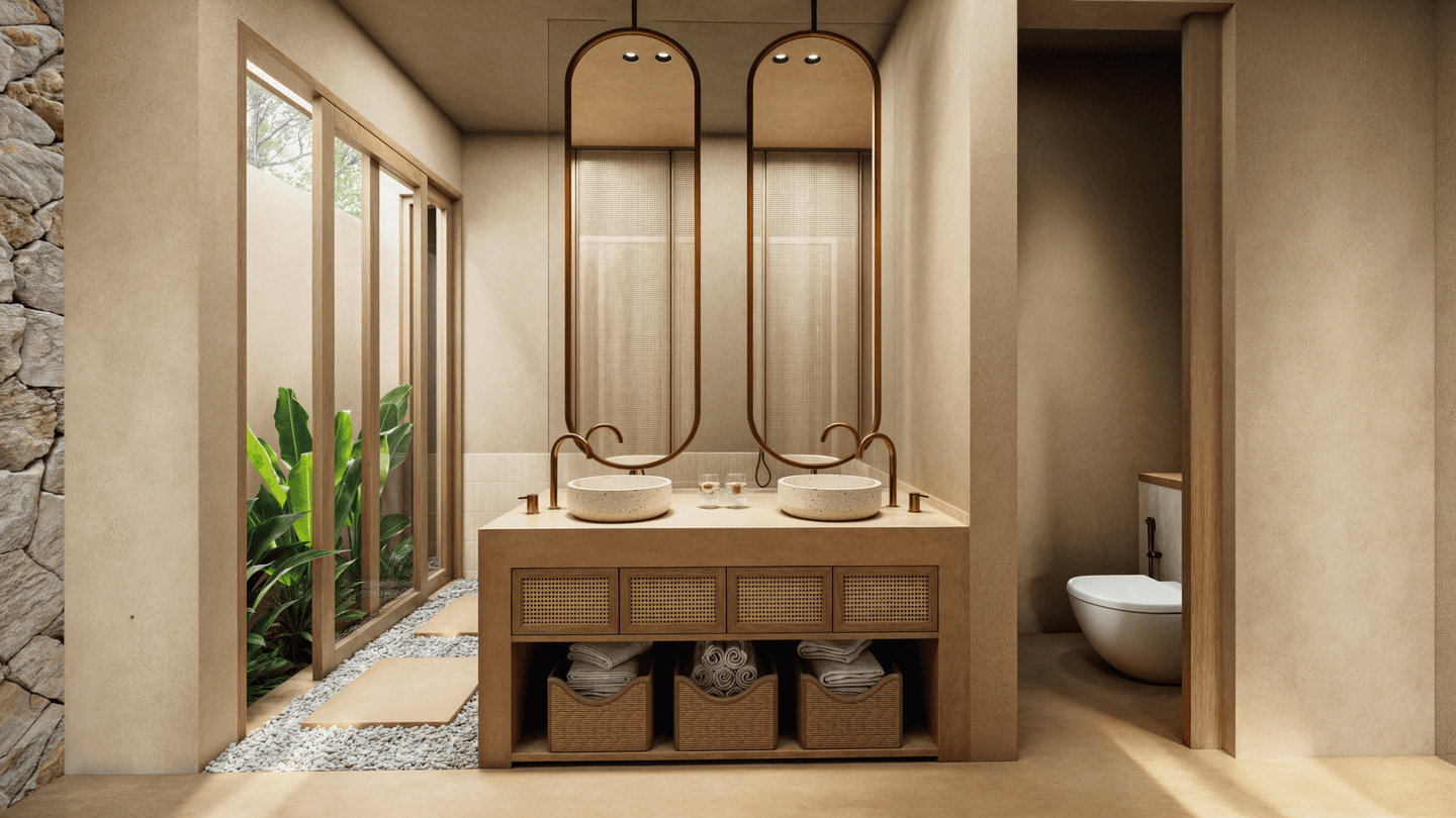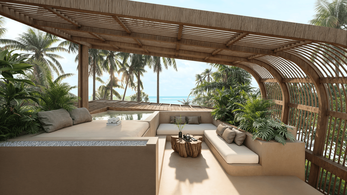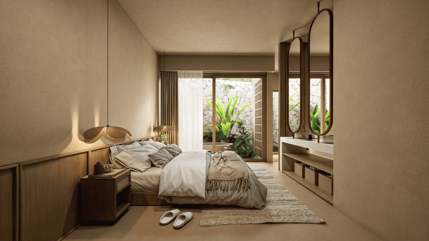 Cette villa de trois chambres présente un havre tropical serein avec un design unique qui allie harmonieusement confort intérieur et vie en plein air. L’architecture adopte des formes douces et arrondies, évoquant la sensation d’une oasis tropicale. En son centre se trouve un magnifique salon en contrebas entouré de la piscine et d’une pergola ombragée — l’endroit idéal pour se détendre ou partager des moments conviviaux entre amis et en famille.