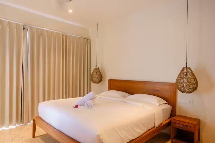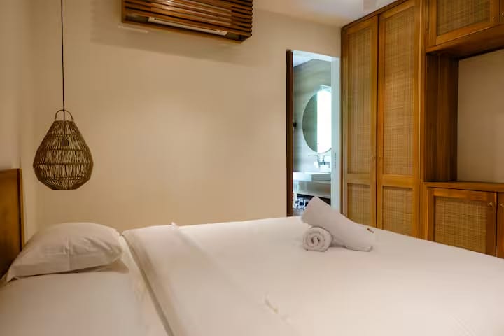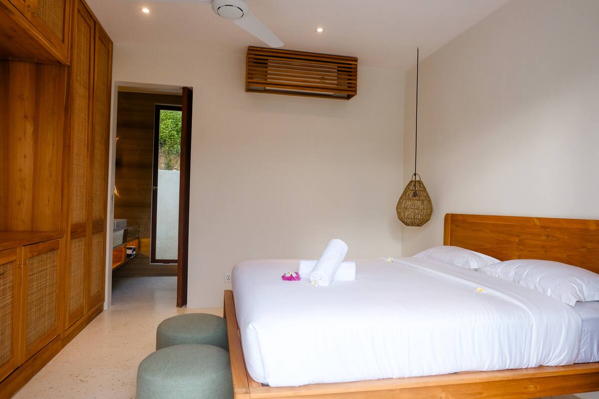 Cette villa de plain-pied présente une conception symétrique, avec les deux chambres situées de part et d’autre d’un espace de vie central ouvert. Cette disposition crée une harmonie parfaite tout en assurant intimité et fonctionnalité. Le salon s’ouvre sur un jardin tropical luxuriant, offrant une transition fluide entre intérieur et extérieur et mettant en valeur la beauté naturelle environnante.