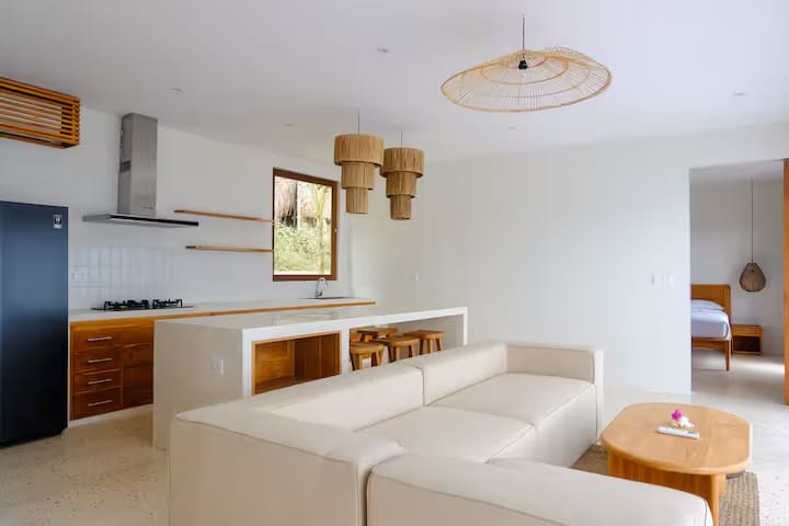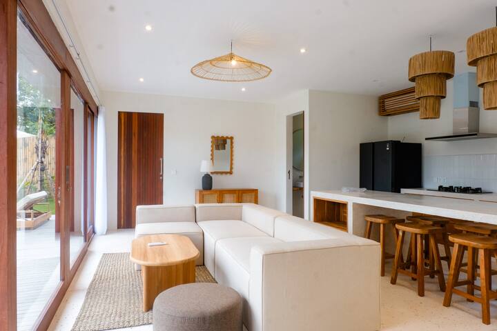 La cuisine entièrement équipée, avec son îlot central, se trouve au cœur de la villa — idéale pour cuisiner ou recevoir. Le spacieux séjour donne directement sur le jardin, permettant aux résidents de profiter d’une vue imprenable sur la jungle tout en se relaxant dans un cadre confortable.