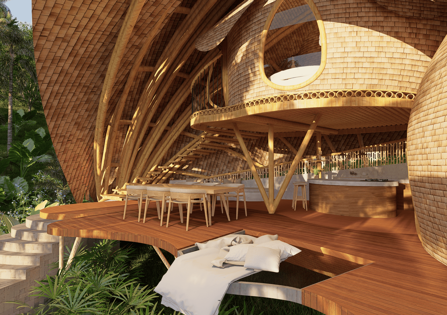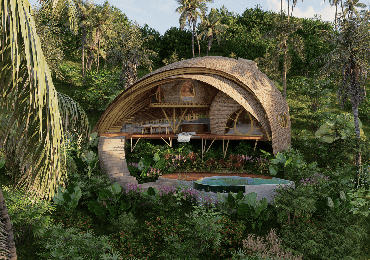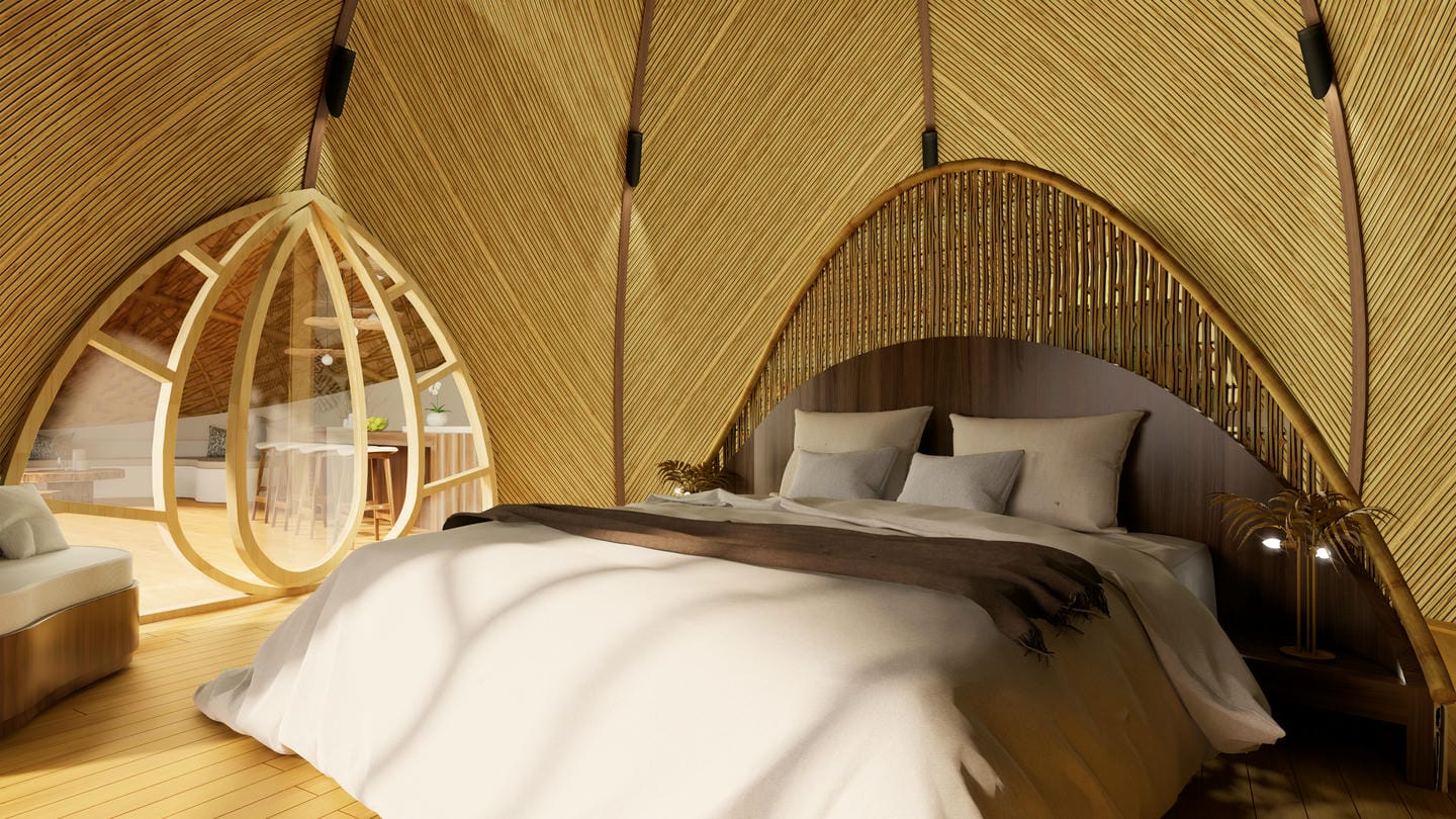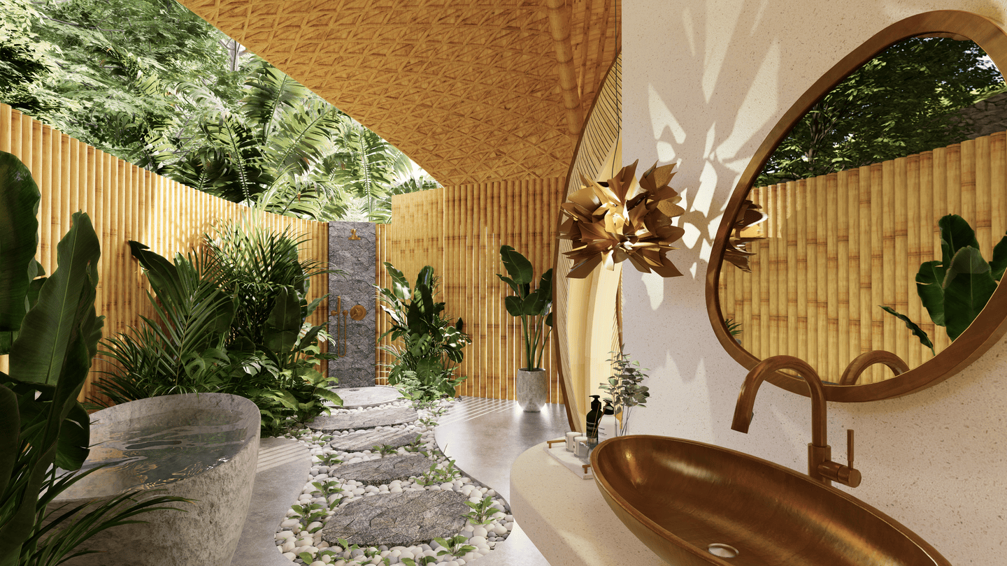 Véritable chef-d’œuvre de design durable, la villa marie des courbes fluides et des matériaux naturels avec le paysage environnant. La lumière du soleil inonde les intérieurs aérés, tandis que les brises légères circulent librement, créant une atmosphère calme et régénérante. La terrasse s’ouvre sur une vue spectaculaire sur la vallée, avec un filet suspendu pour se détendre, et la cuisine ouverte transforme chaque repas en une expérience sensorielle au cœur de la verdure luxuriante. La chambre principale, nichée sous une arche en bambou, et sa salle de bain au style jardin offrent un équilibre parfait entre intimité et ouverture, tandis que la chambre en mezzanine au-dessus constitue un refuge cosy et surélevé.