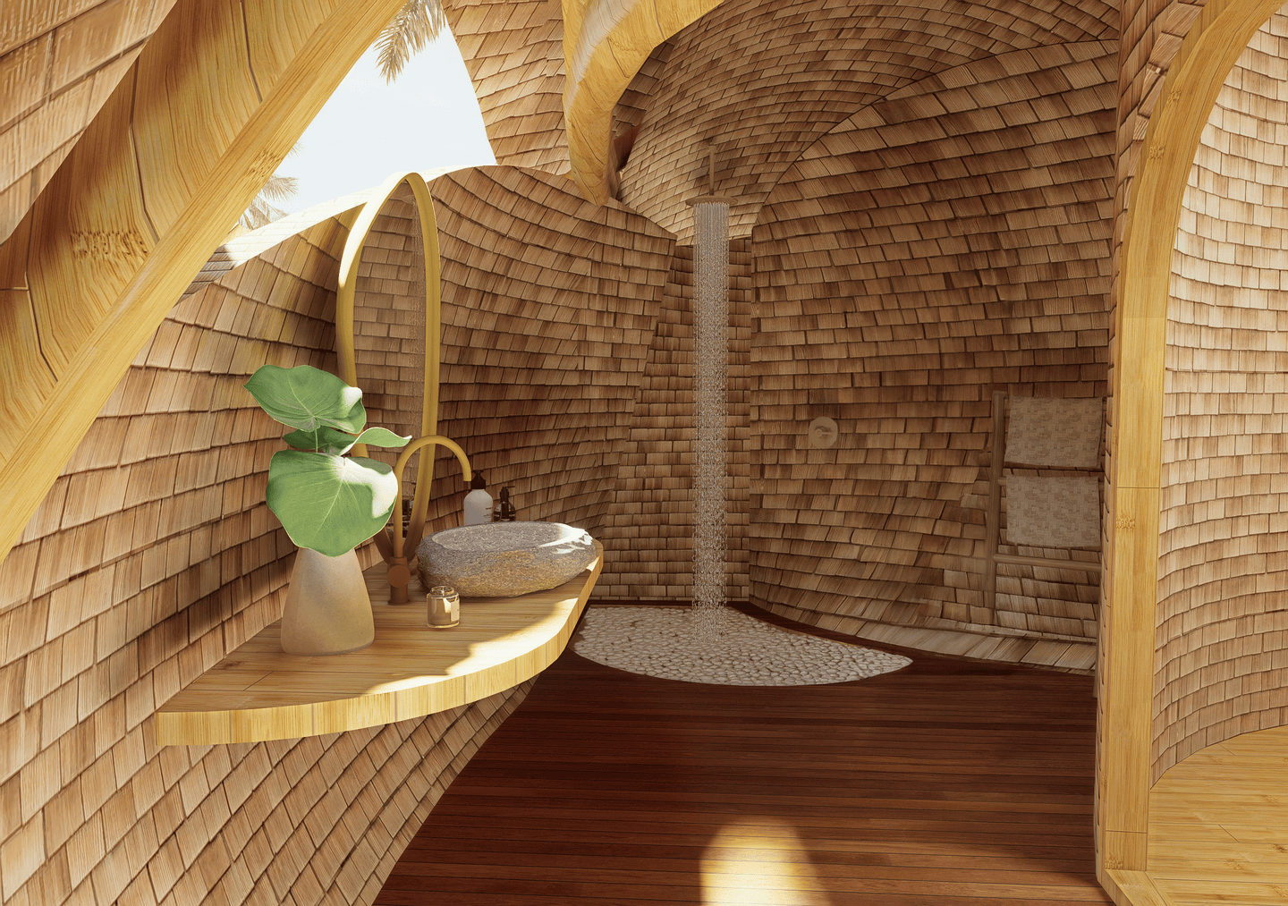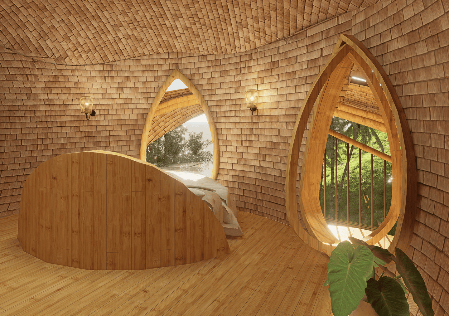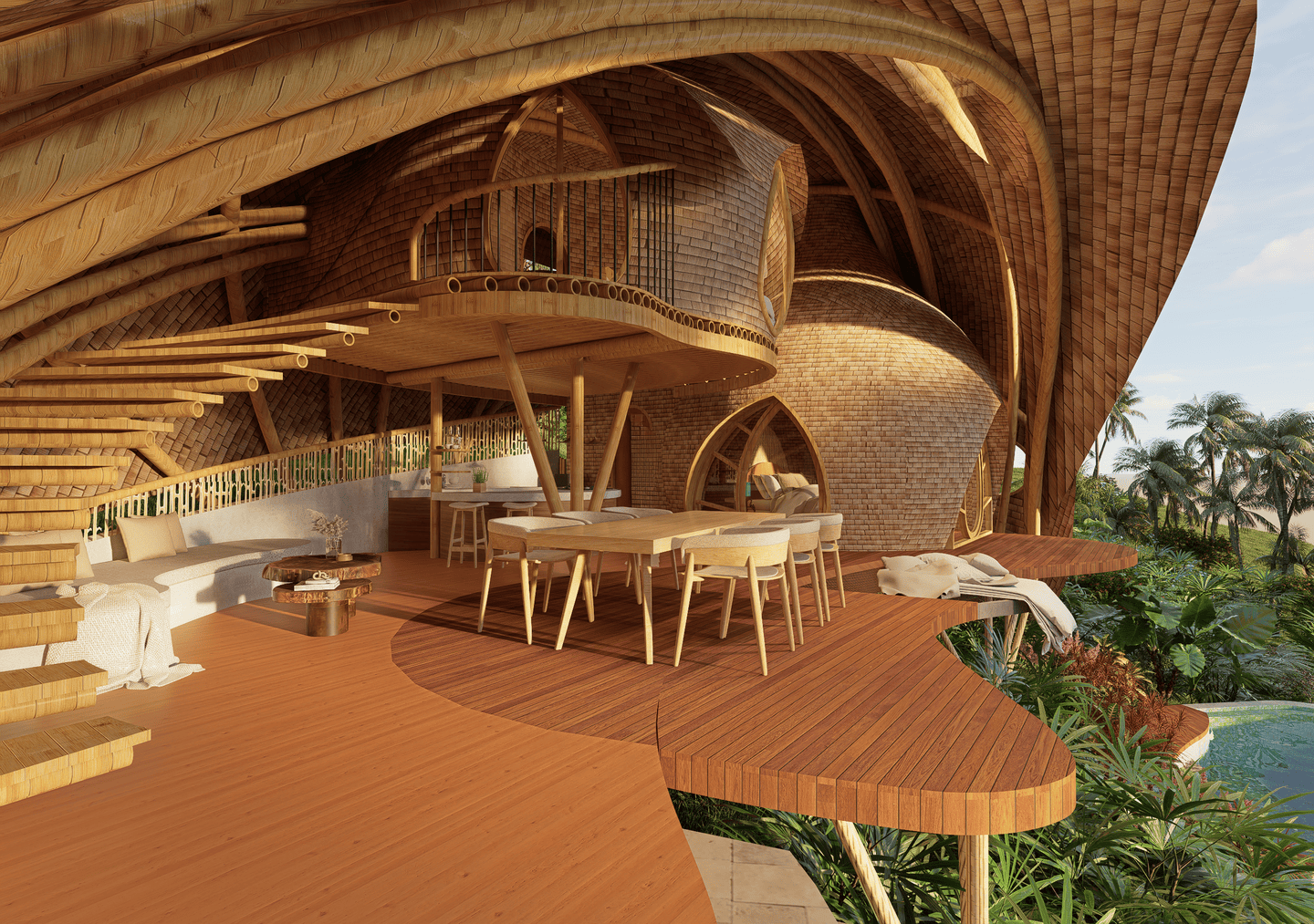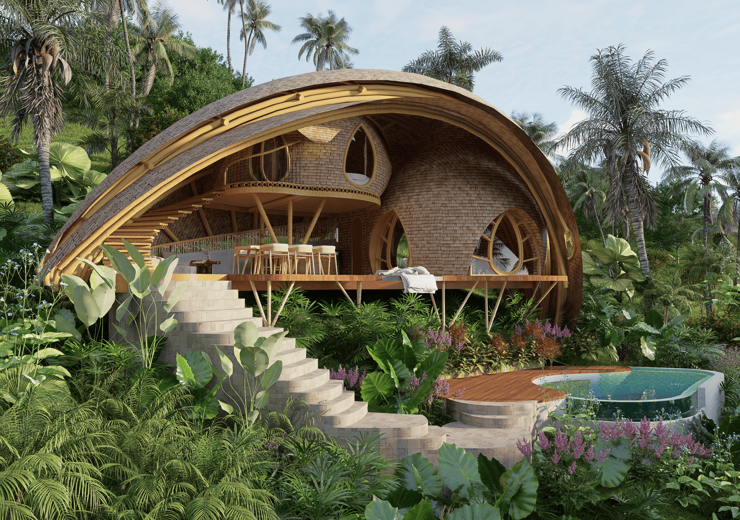Véritable chef-d’œuvre de design durable, la villa marie des courbes fluides et des matériaux naturels avec le paysage environnant. La lumière du soleil inonde les intérieurs aérés, tandis que les brises légères circulent librement, créant une atmosphère calme et régénérante. La terrasse s’ouvre sur une vue spectaculaire sur la vallée, avec un filet suspendu pour se détendre, et la cuisine ouverte transforme chaque repas en une expérience sensorielle au cœur de la verdure luxuriante. La chambre principale, nichée sous une arche en bambou, et sa salle de bain au style jardin offrent un équilibre parfait entre intimité et ouverture, tandis que la chambre en mezzanine au-dessus constitue un refuge cosy et surélevé.