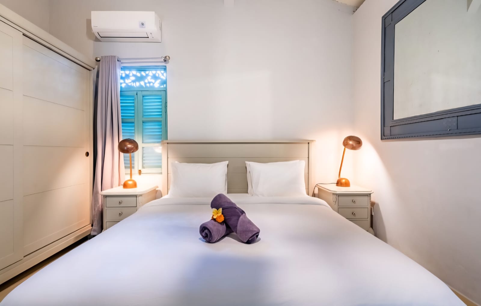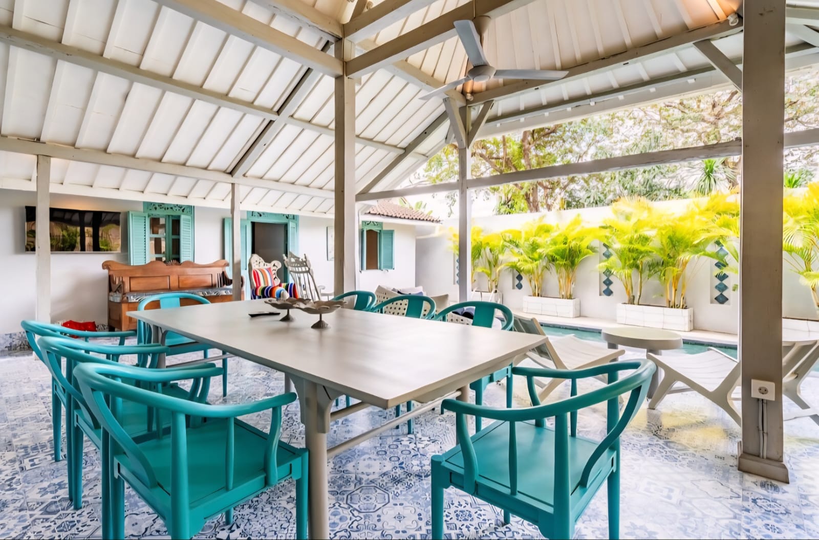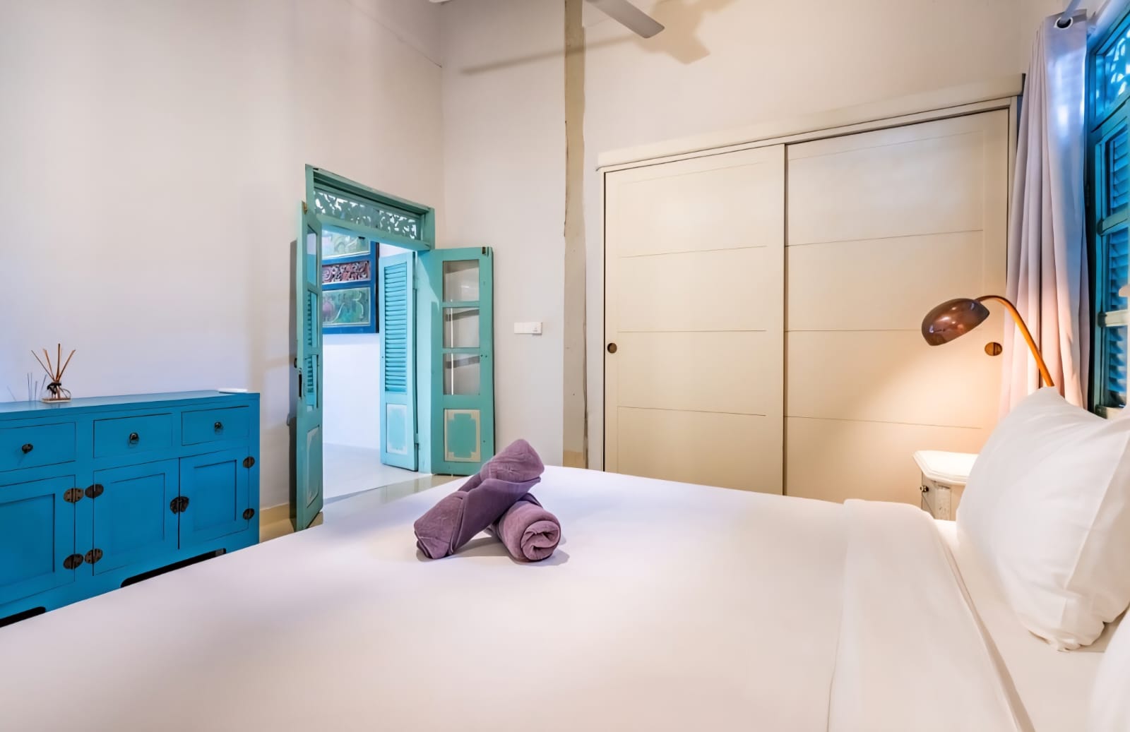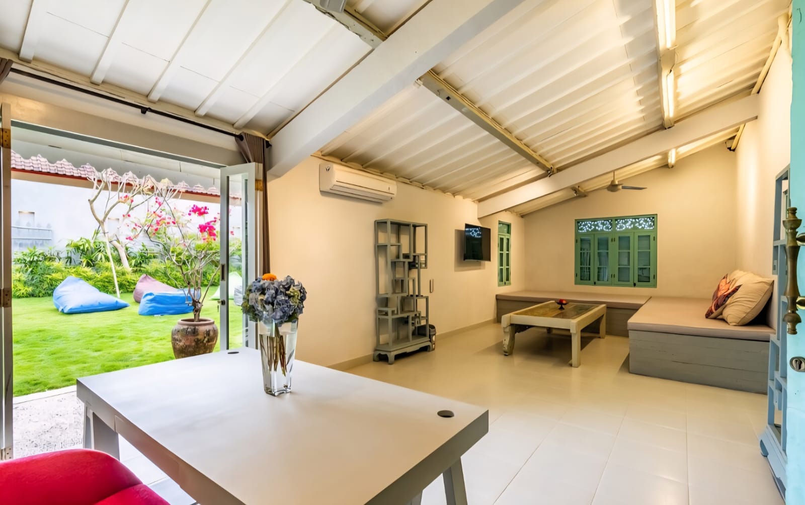 Sise sur un terrain généreux de 500 m², la villa présente un design traditionnel et aéré qui allie le charme d’antan au confort tropical. Des tons pastel doux, des carreaux à motifs et des détails en bois rustique créent une atmosphère à la fois chaleureuse et élégante dans l’espace de vie ouvert et la cuisine entièrement équipée.