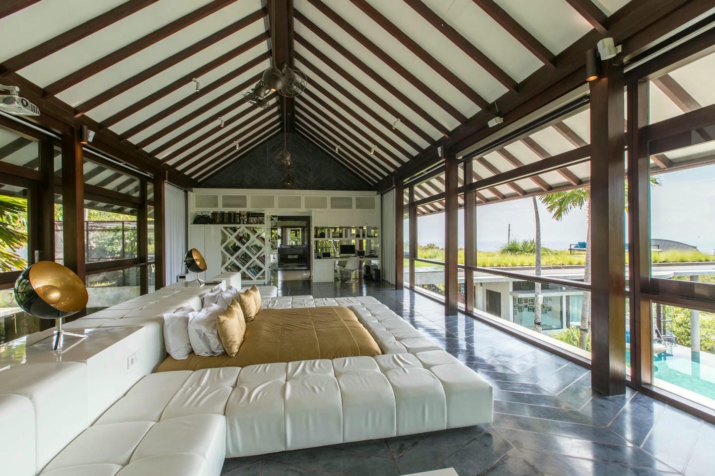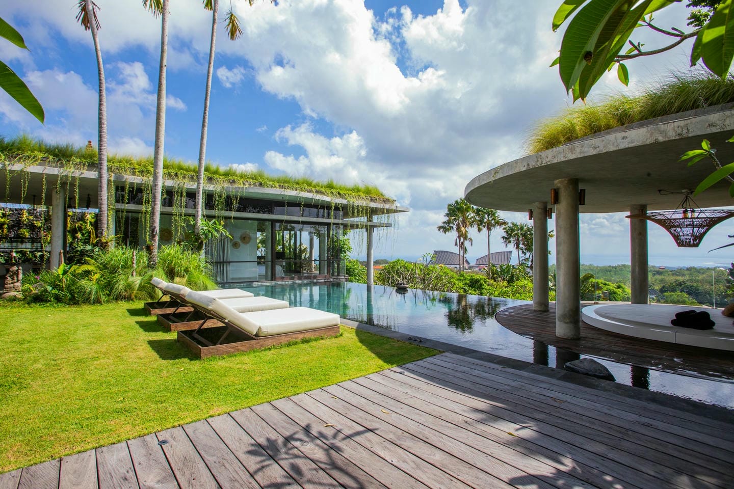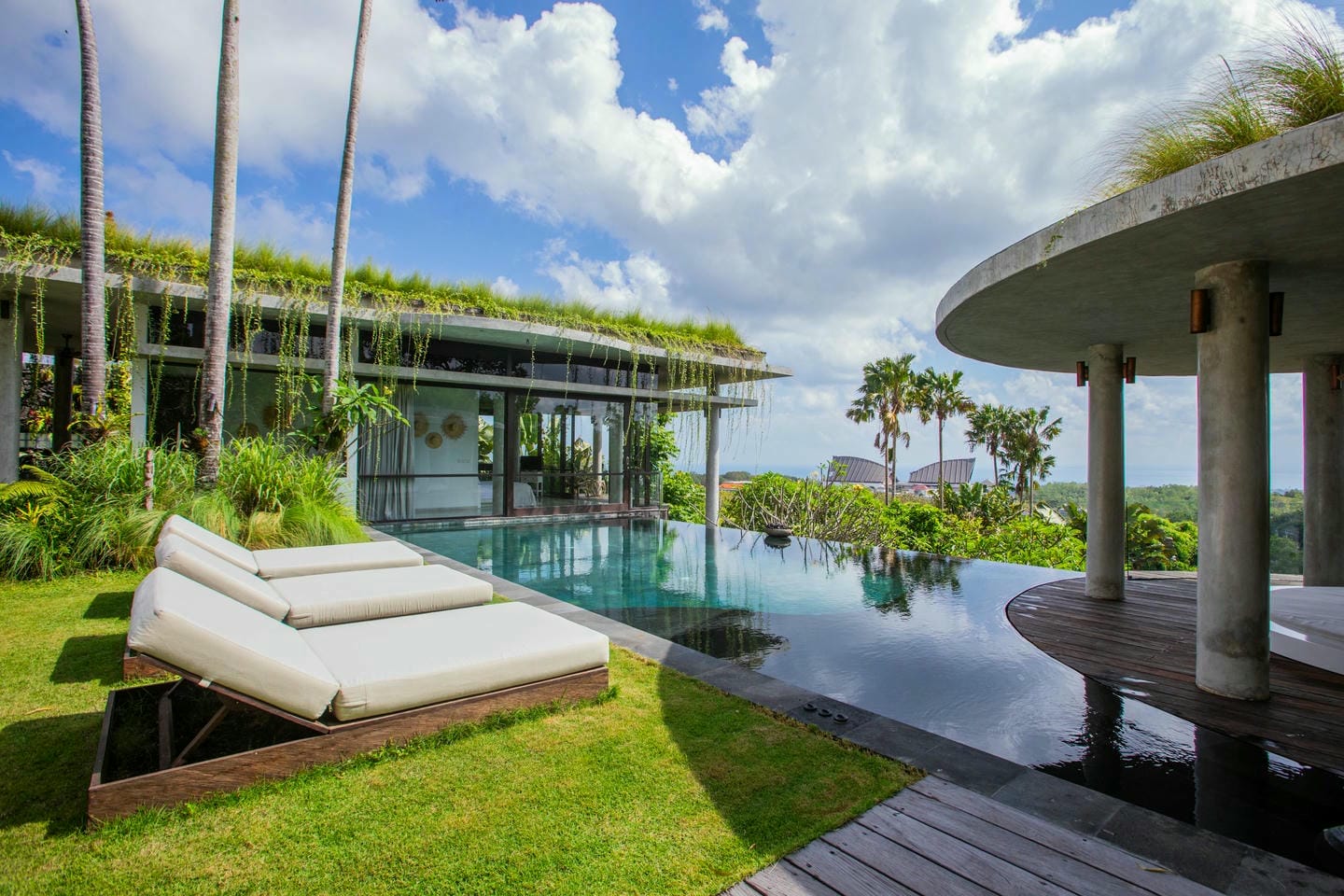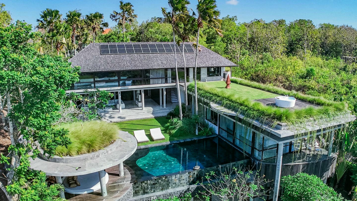 L’espace extérieur comprend une terrasse ensoleillée et une piscine à débordement directement accessibles depuis le séjour principal, offrant une vue panoramique spectaculaire sur la péninsule de Bukit. Cette villa dispose également d’équipements haut de gamme, notamment un second salon, une table de billard, une salle de sport et un sauna, réunissant tous les éléments d’un art de vivre premium.