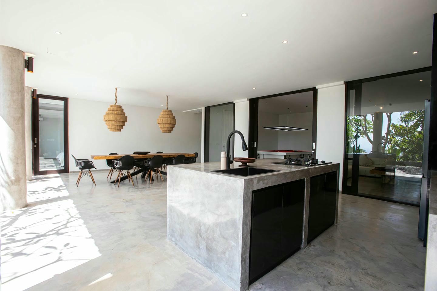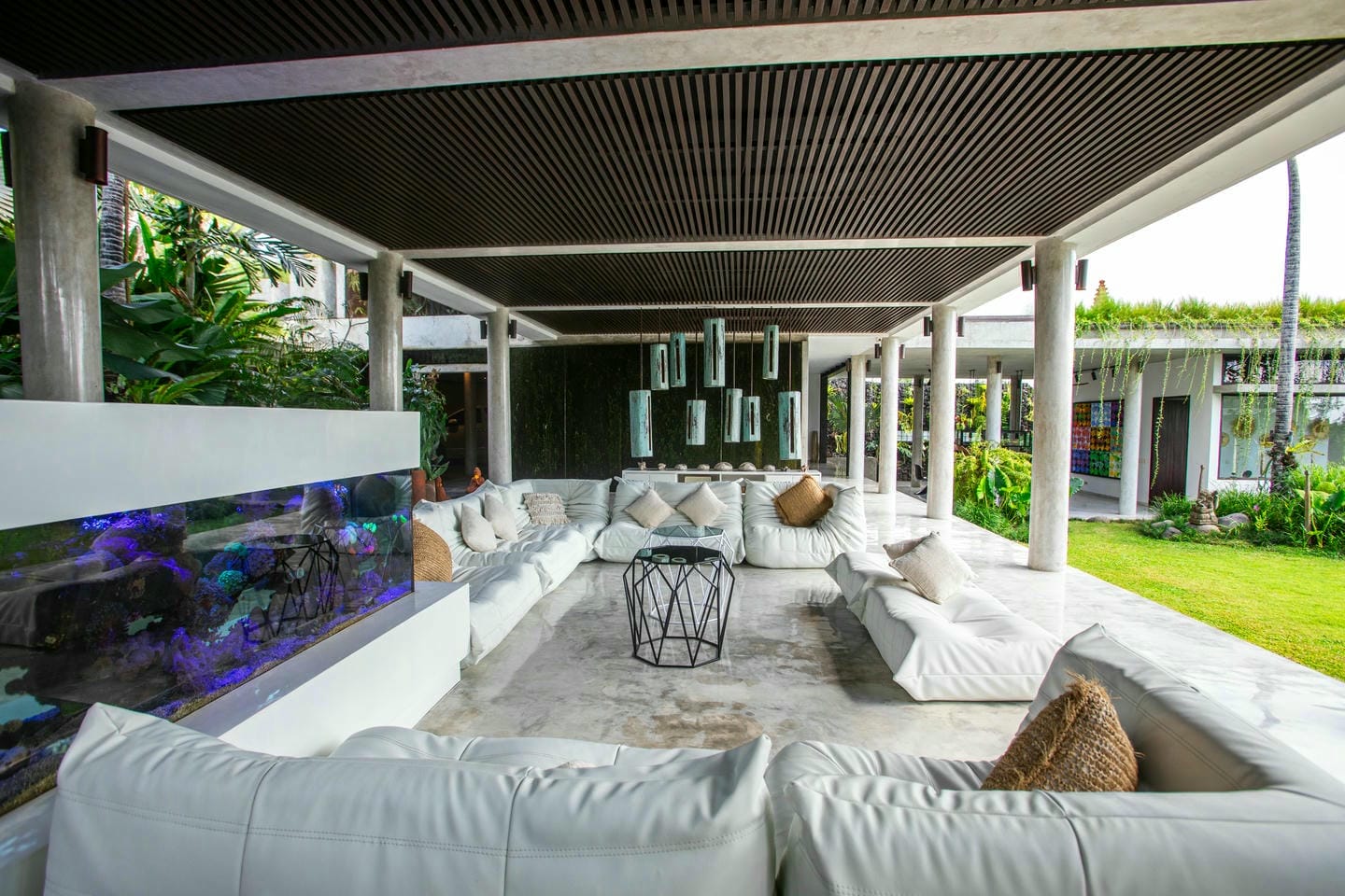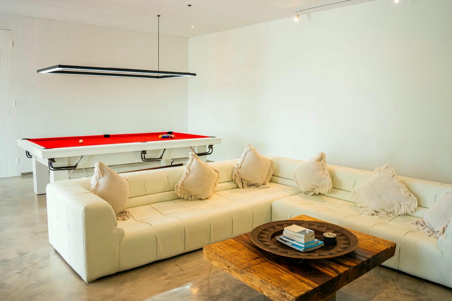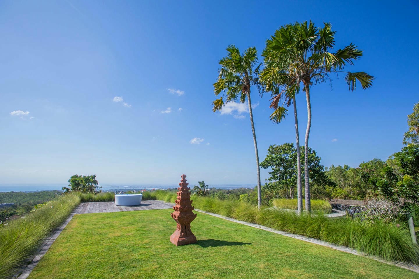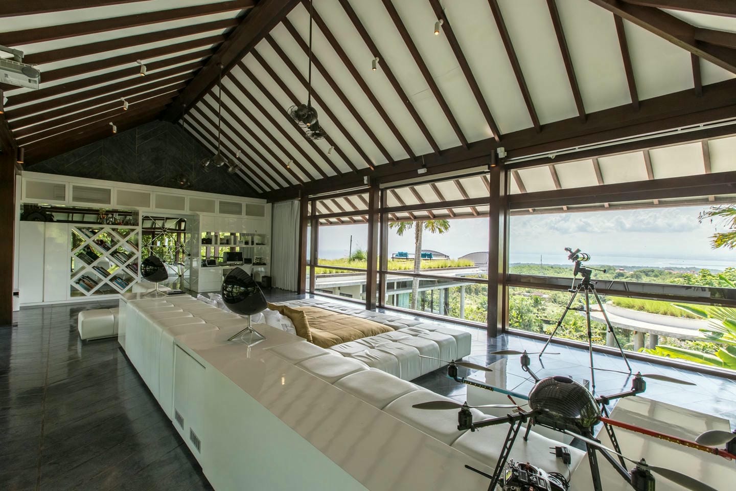 L’espace extérieur comprend une terrasse ensoleillée et une piscine à débordement directement accessibles depuis le séjour principal, offrant une vue panoramique spectaculaire sur la péninsule de Bukit. Cette villa dispose également d’équipements haut de gamme, notamment un second salon, une table de billard, une salle de sport et un sauna, réunissant tous les éléments d’un art de vivre premium.