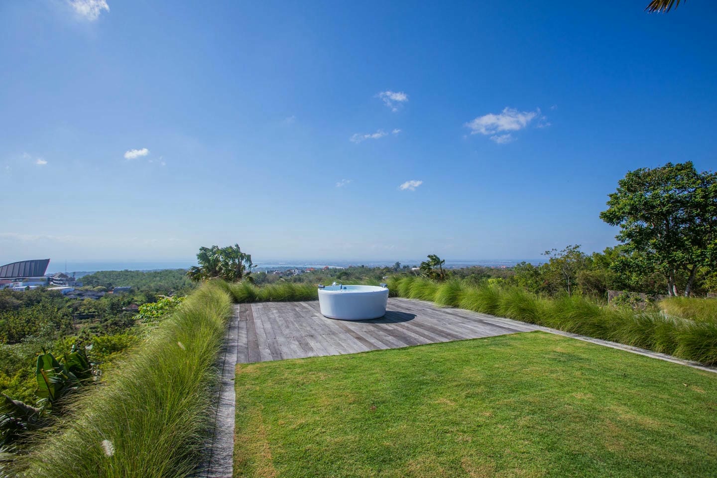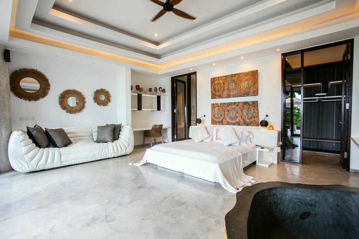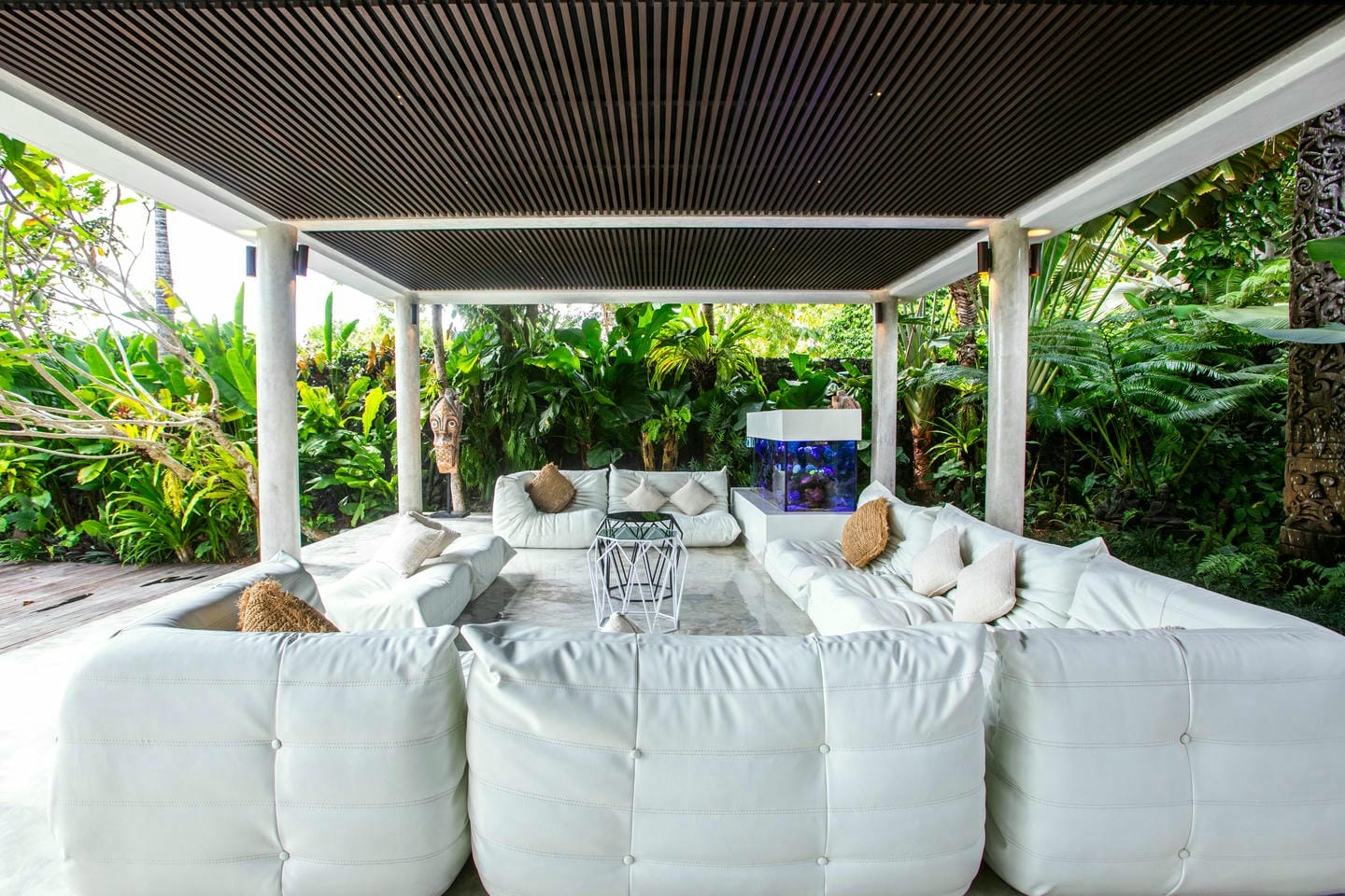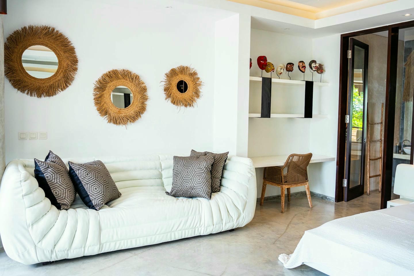 L’espace extérieur comprend une terrasse ensoleillée et une piscine à débordement directement accessibles depuis le séjour principal, offrant une vue panoramique spectaculaire sur la péninsule de Bukit. Cette villa dispose également d’équipements haut de gamme, notamment un second salon, une table de billard, une salle de sport et un sauna, réunissant tous les éléments d’un art de vivre premium.