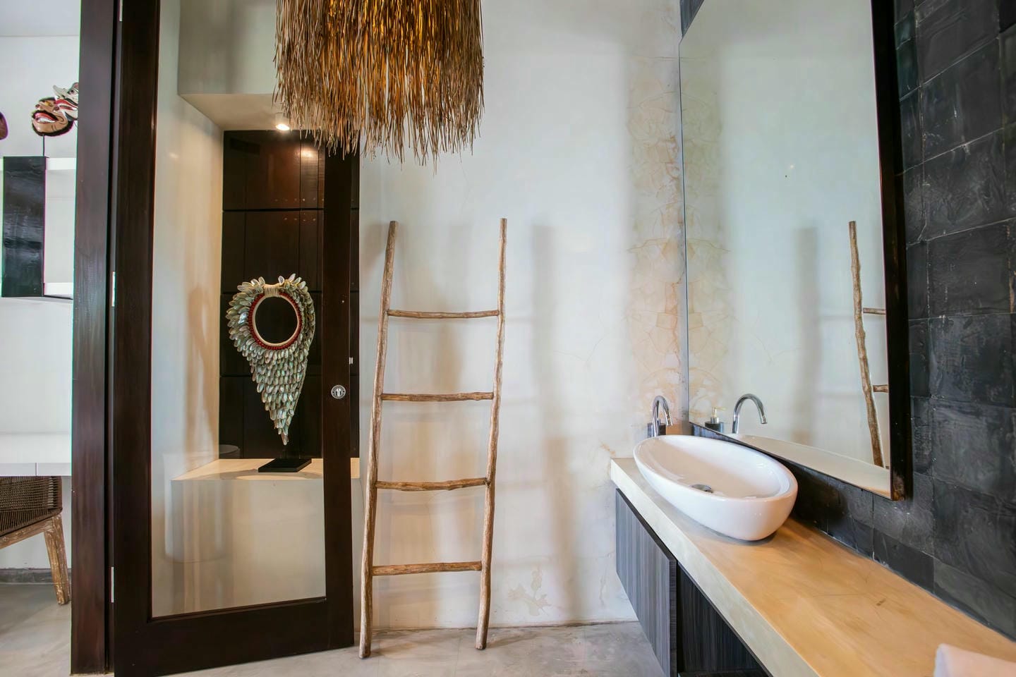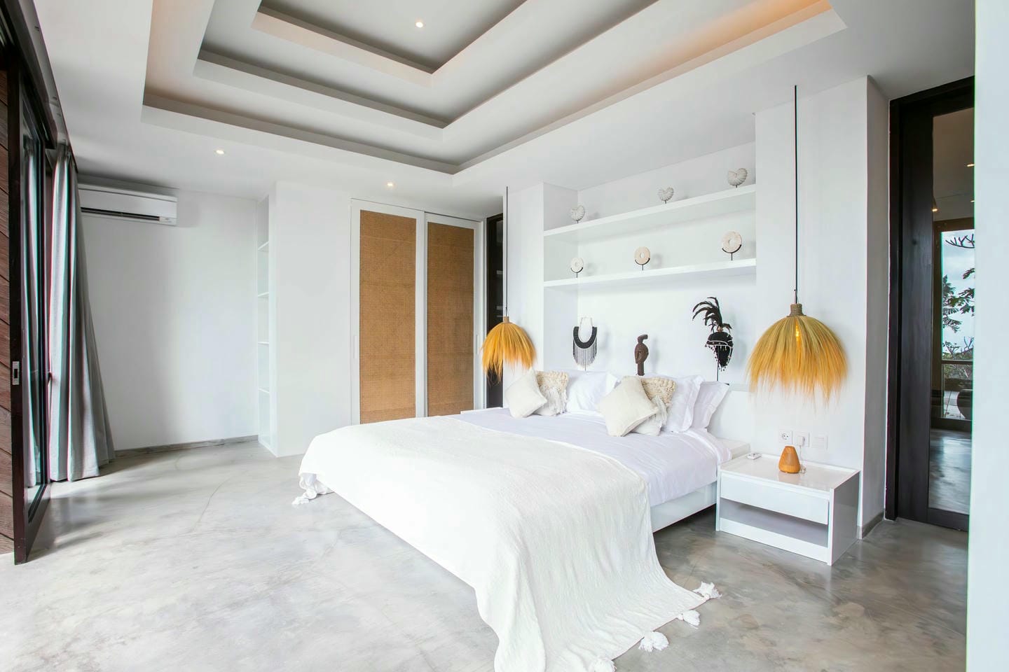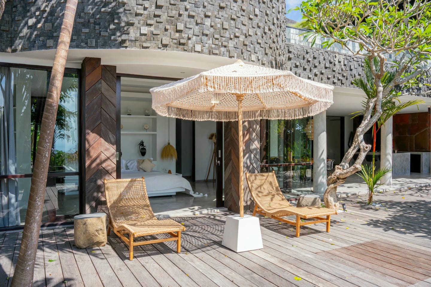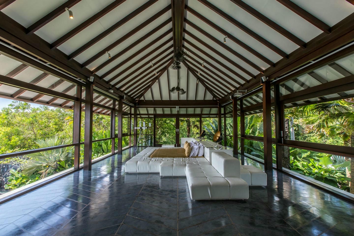 L’espace extérieur comprend une terrasse ensoleillée et une piscine à débordement directement accessibles depuis le séjour principal, offrant une vue panoramique spectaculaire sur la péninsule de Bukit. Cette villa dispose également d’équipements haut de gamme, notamment un second salon, une table de billard, une salle de sport et un sauna, réunissant tous les éléments d’un art de vivre premium.