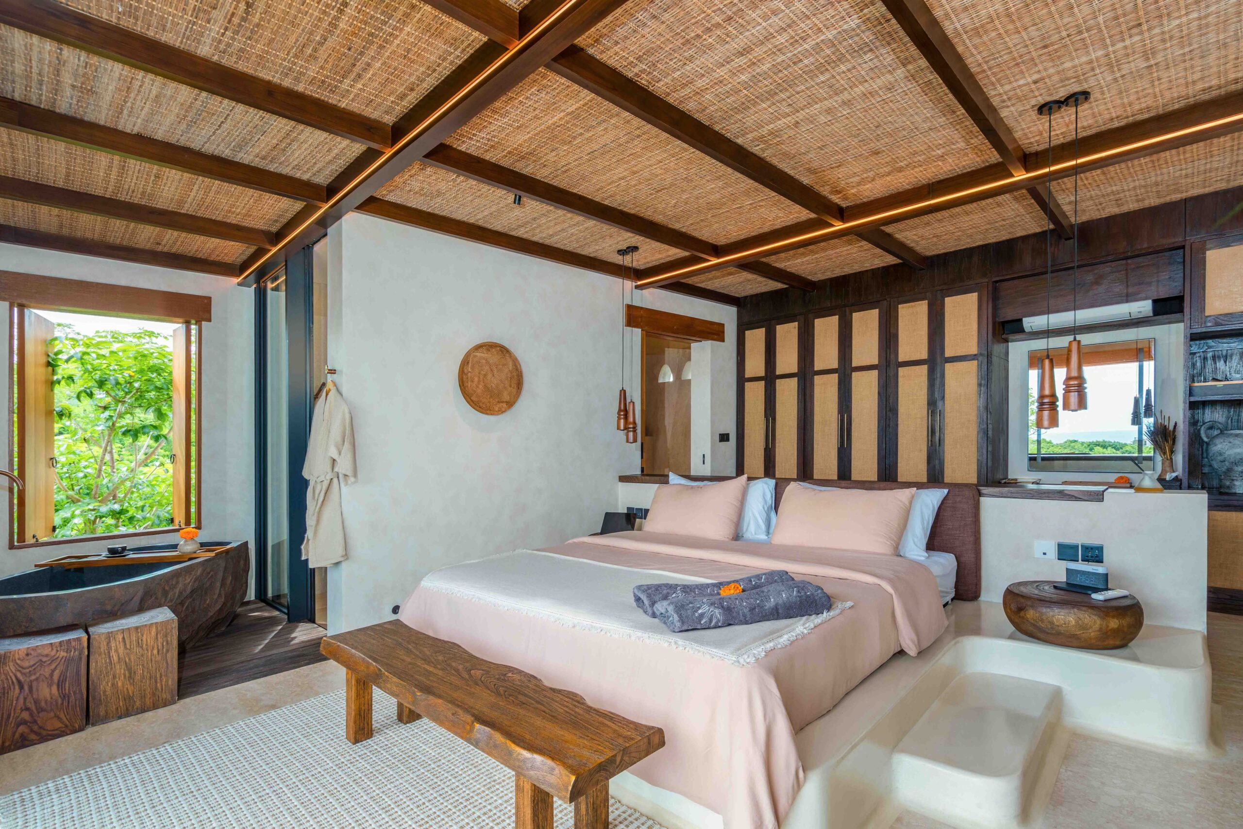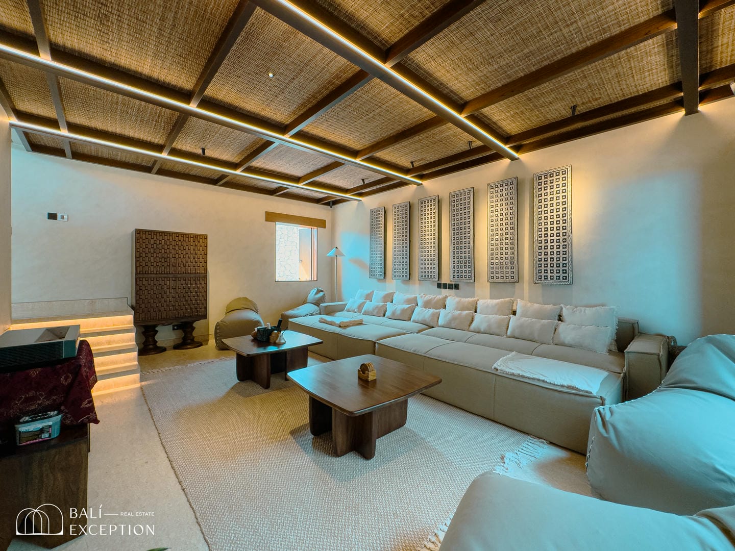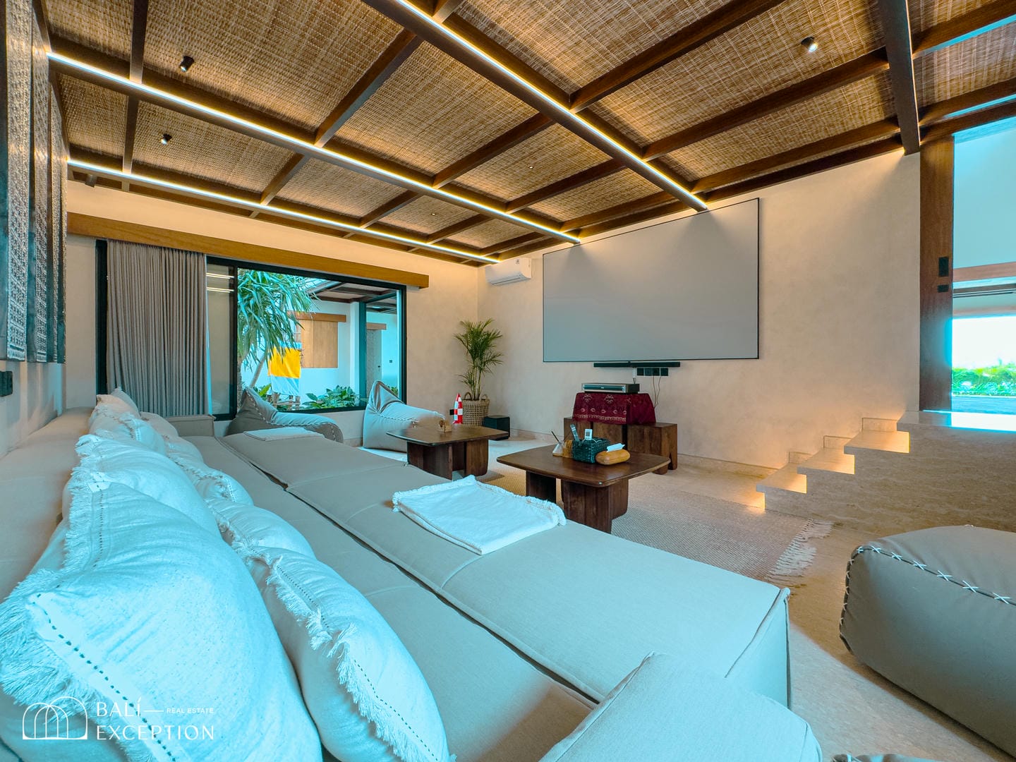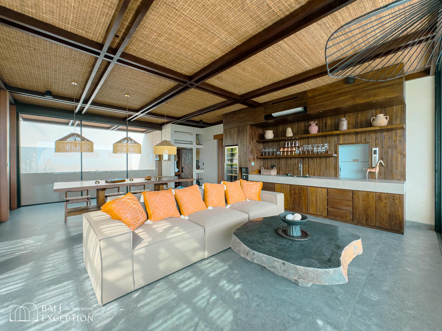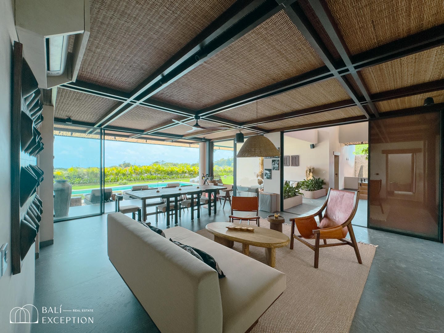 À l’intérieur, la villa présente un design tropical-moderne raffiné, mêlant textures naturelles, éléments en bois chaleureux et tons terreux. Les grands espaces ouverts, les finitions haut de gamme et la fluidité entre l’intérieur et l’extérieur créent une atmosphère luxueuse mais décontractée dans les pièces de vie et de repas.